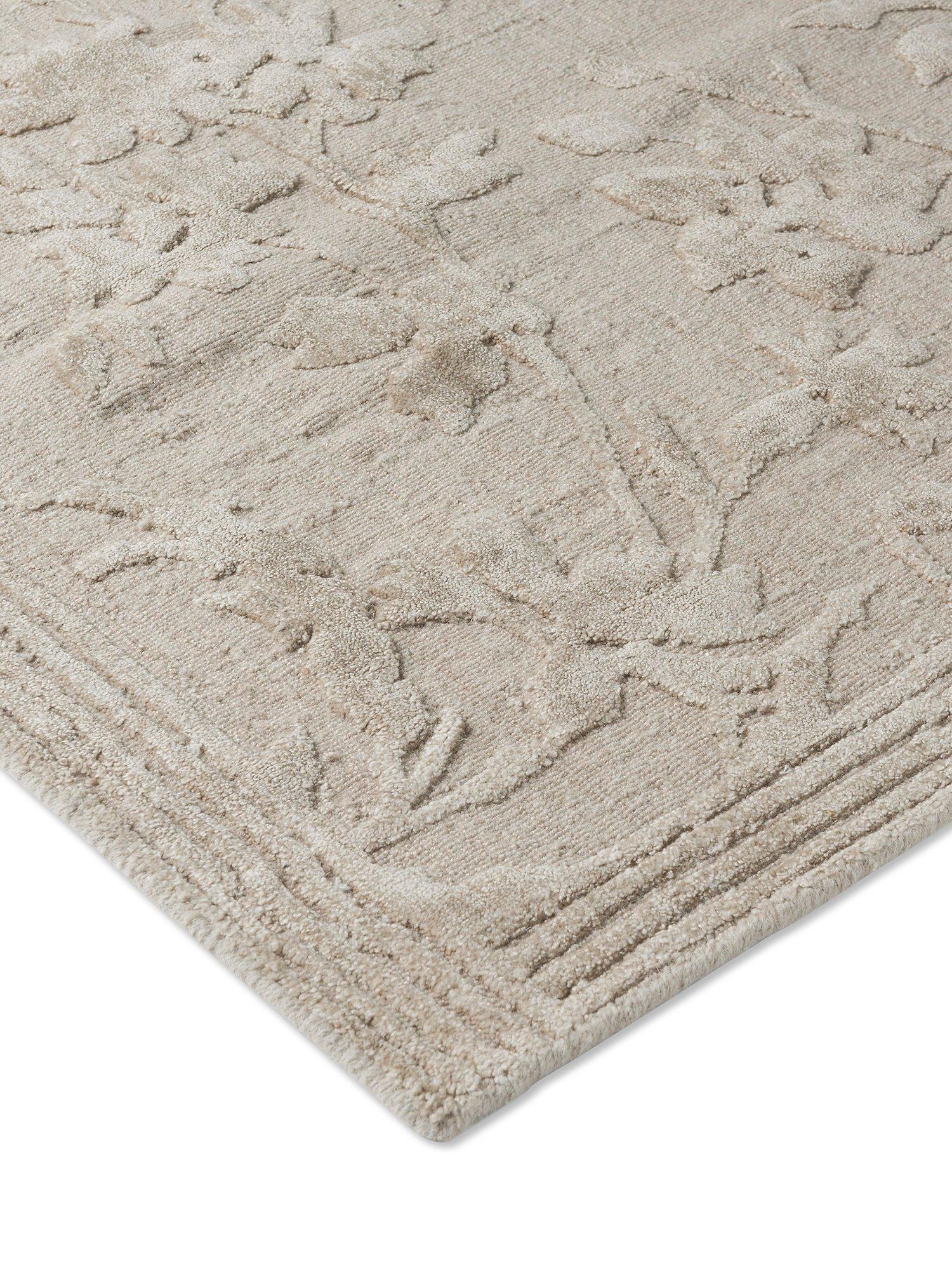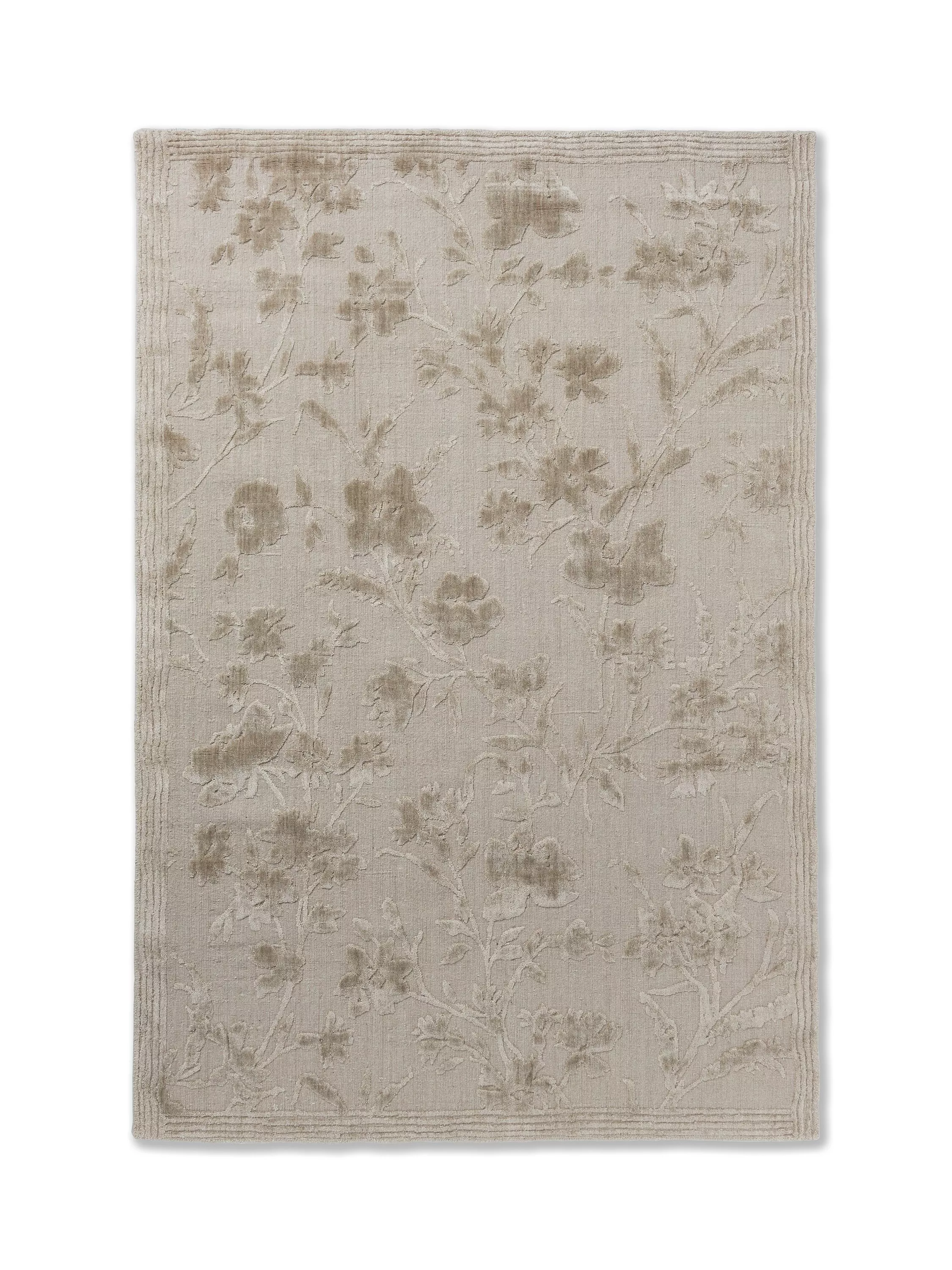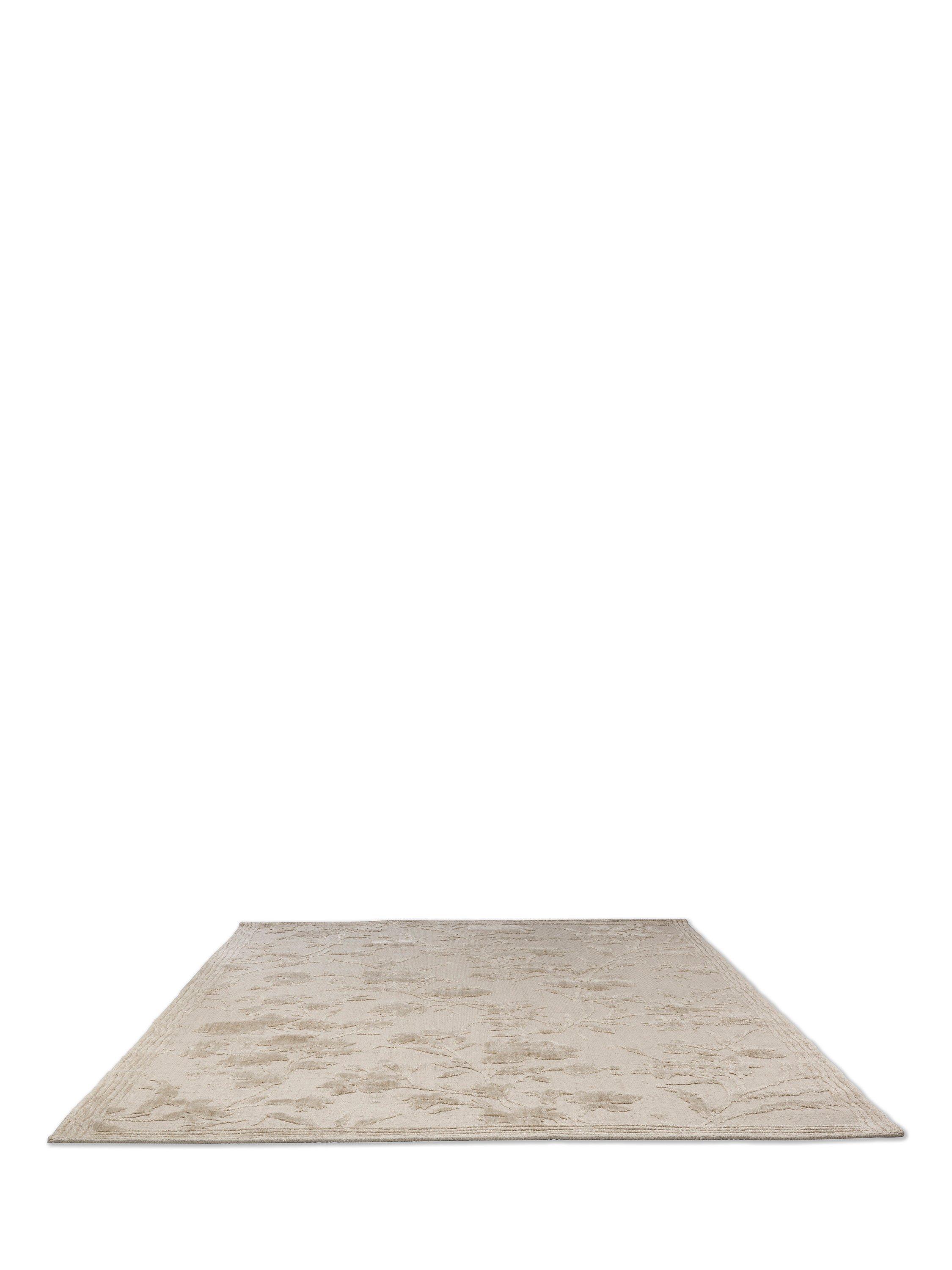 Charismatic and pretty, this striking floral monoprint is a relaunch of a wallpaper pattern held in the Laura Ashley archive, from 1996. The Rye design incorporates a trailing floral motif, featuring large flowerheads, leaves and stems. This beautiful handloom jacquard combines three qualities of yarn. The matte wool and cotton quality in the ground are the perfect base for the highlighted floral motive in the bamboo silk pile. This unique bamboo yarn gives this quality rug an element of luxury and lustre. With this a lovely antique look and feel has been created.