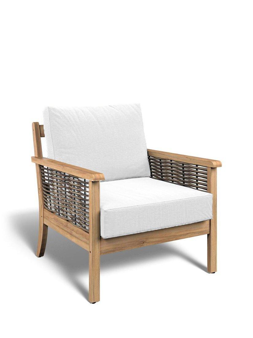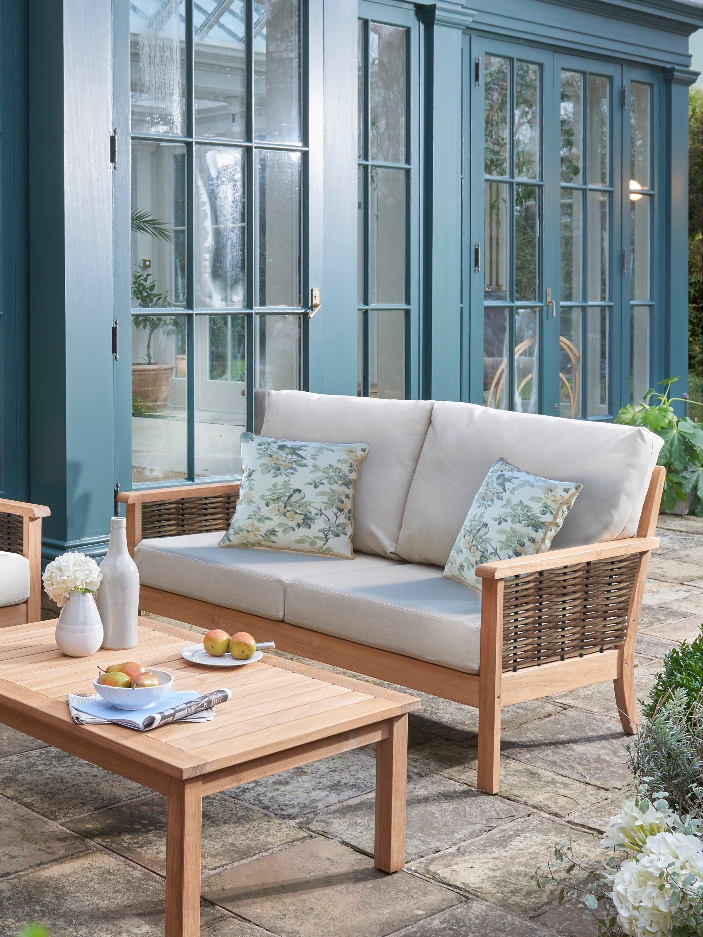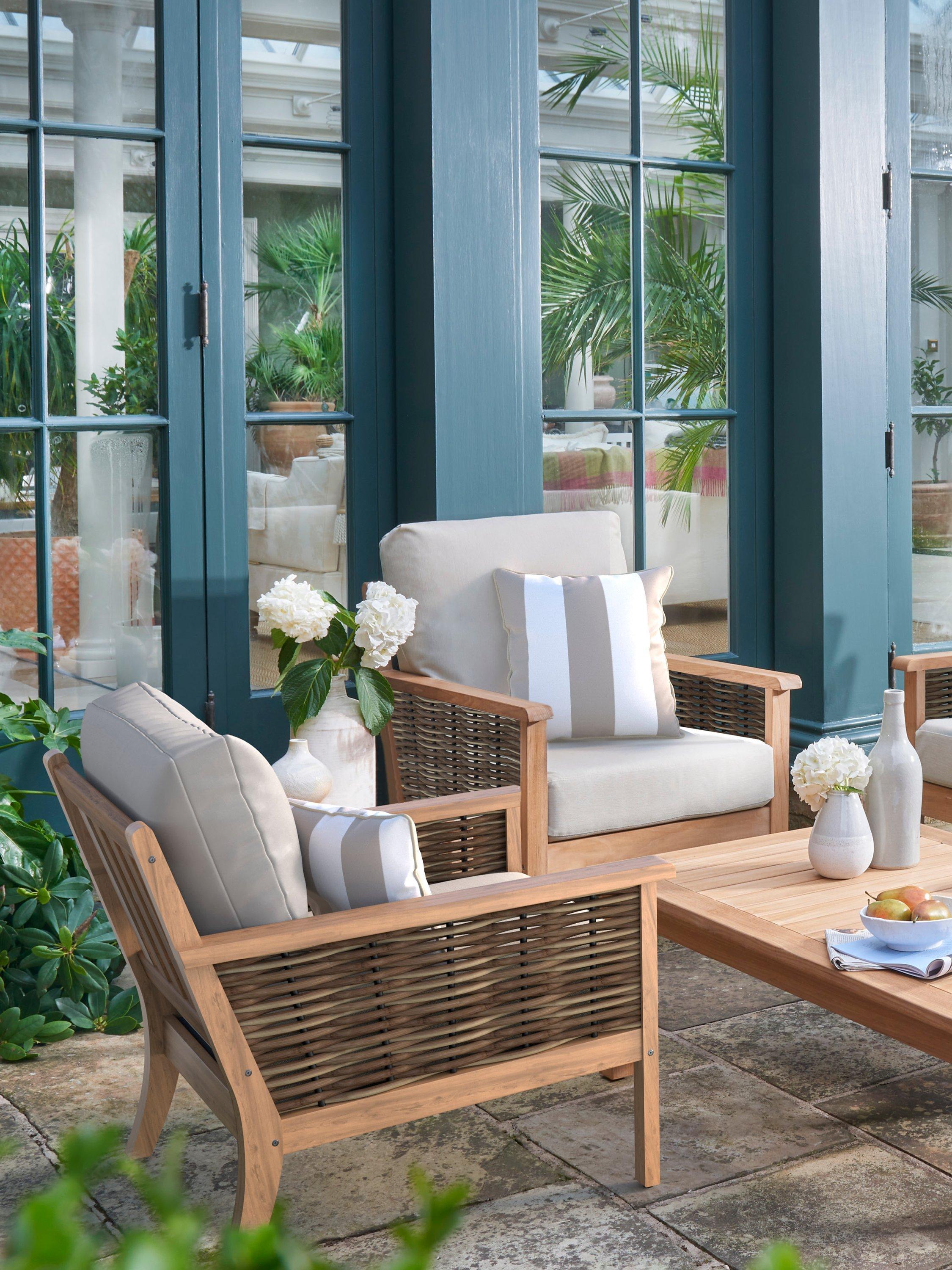 Relax in the Laura Ashley Salcey Woven Garden Lounging Set made from teak wood and enhanced with all-weather weave on the seating side panels. The clean lines of the wooden frame are beautifully accompanied by sumptuous foam and fibre-filled seat and backrest cushions and scatter cushions manufactured in Laura Ashley water and UV-resistant fabrics, giving you a comfortable sit in your garden or even inside the home.