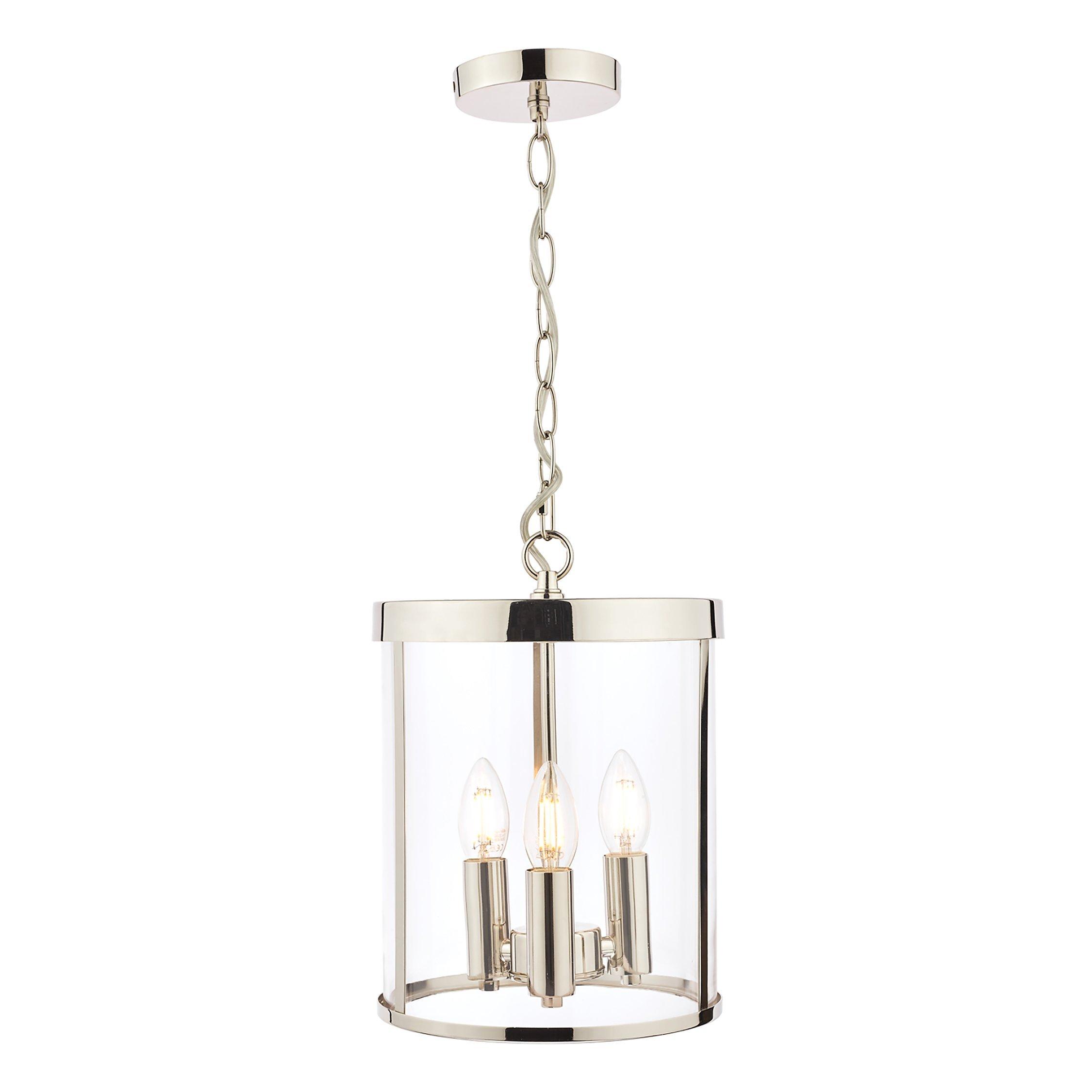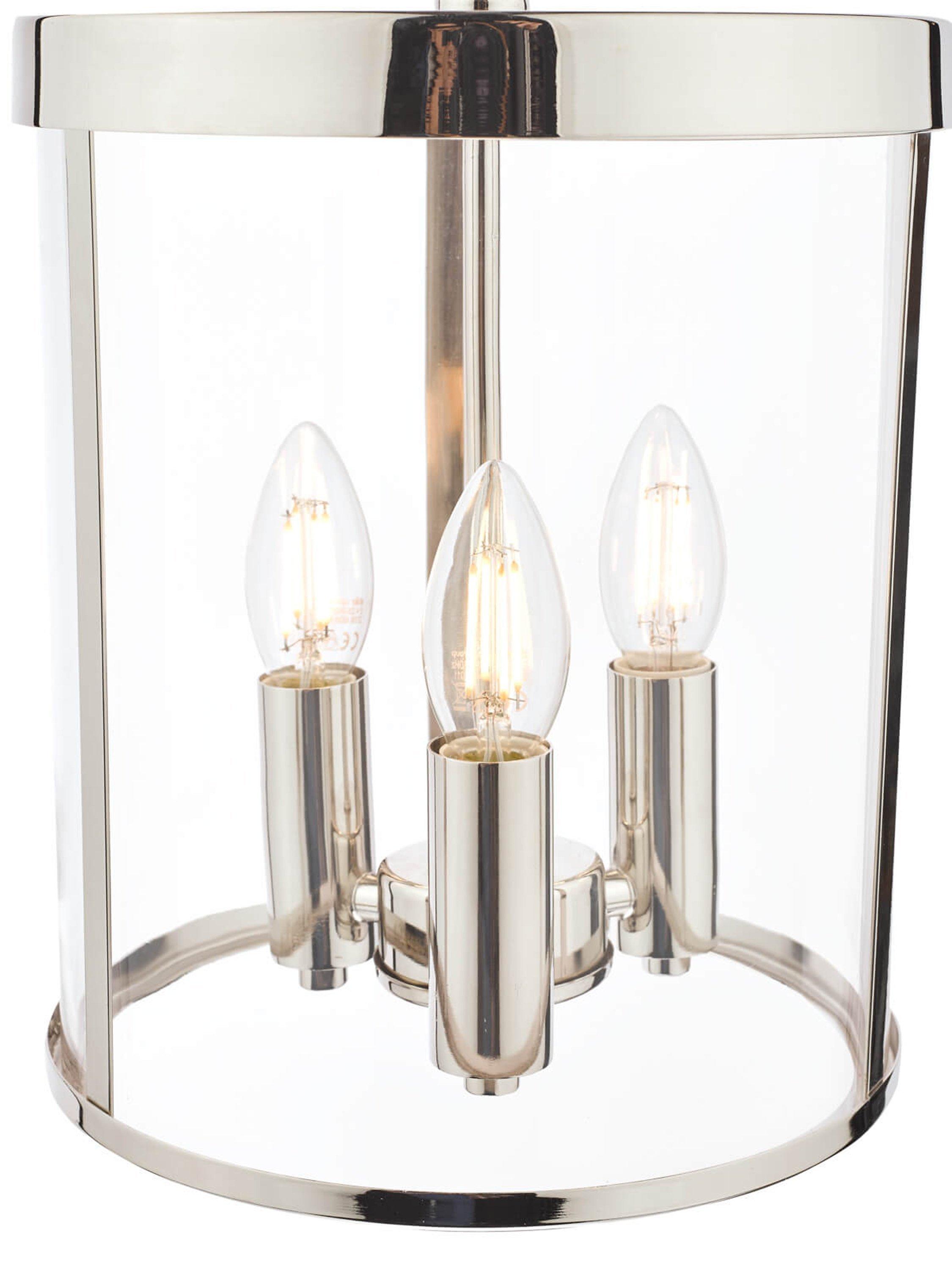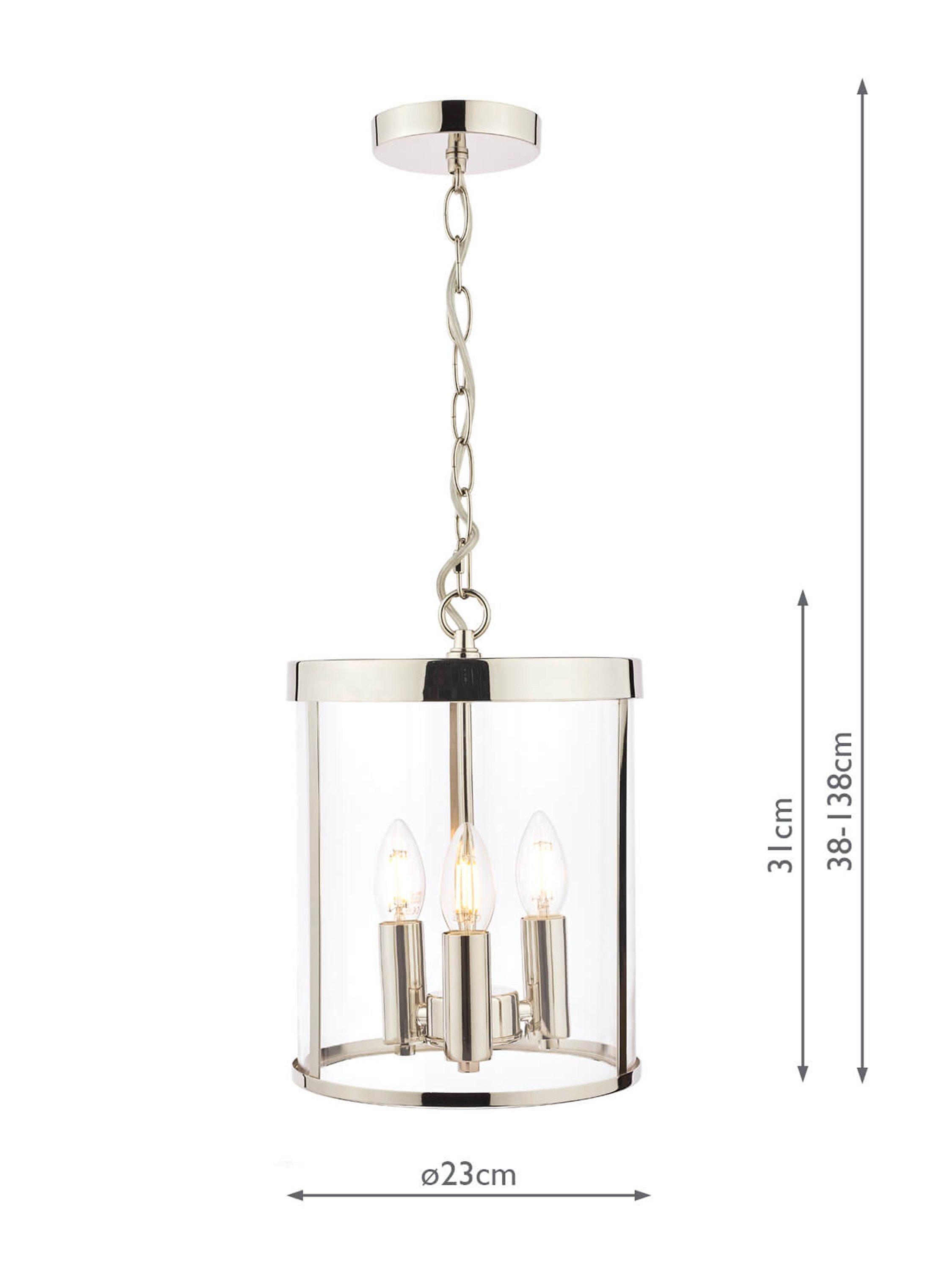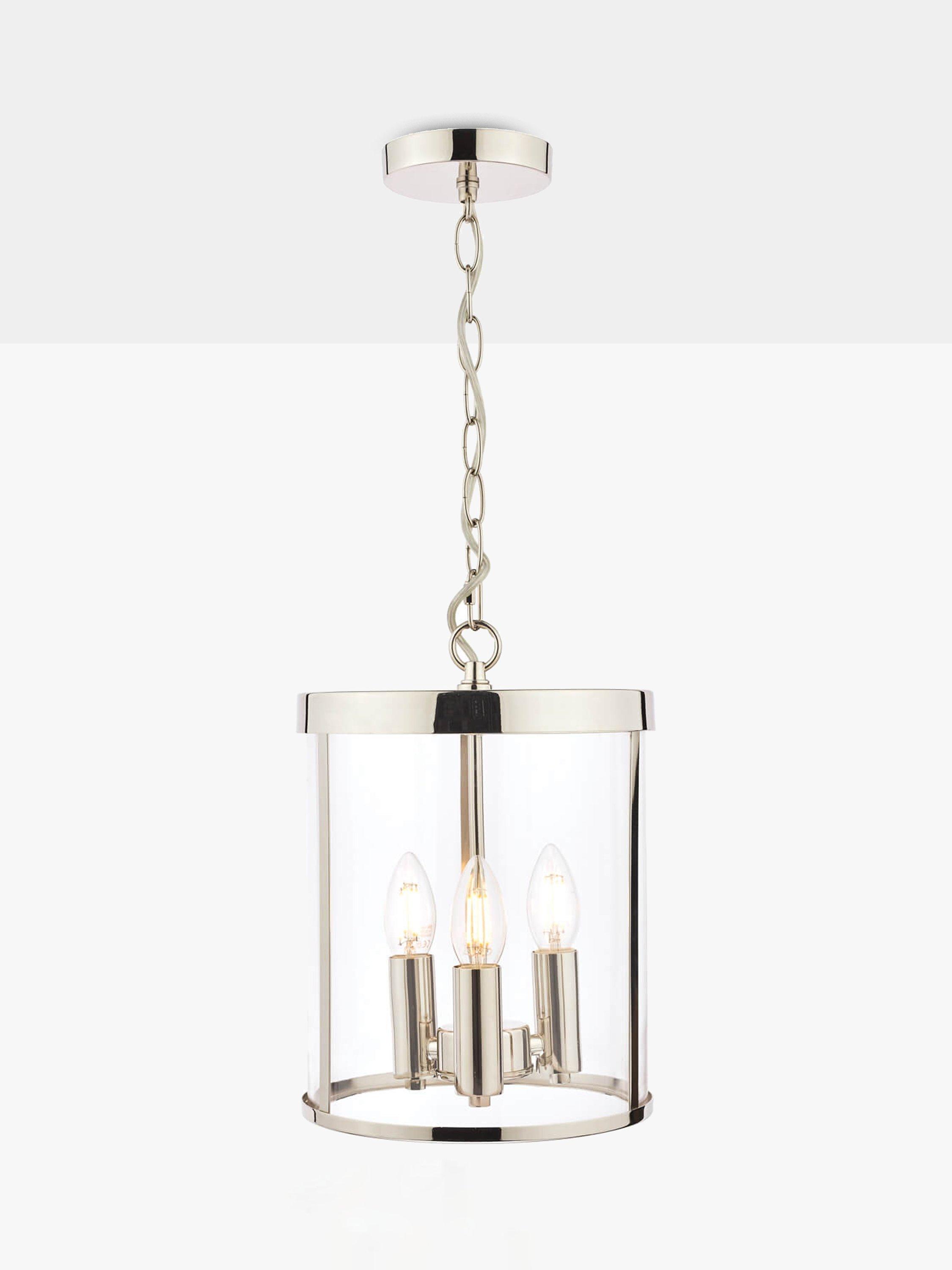 With its simple lantern-style design, this pendant blends both old and new styling. Encased within the glass frame are three bulbholders in the shape of a cluster and when illuminated, it will cast a glow of light around your space. The chain is height-adjustable at the point of installation, allowing for perfect positioning in your home. Available in a choice of two metal finishes.