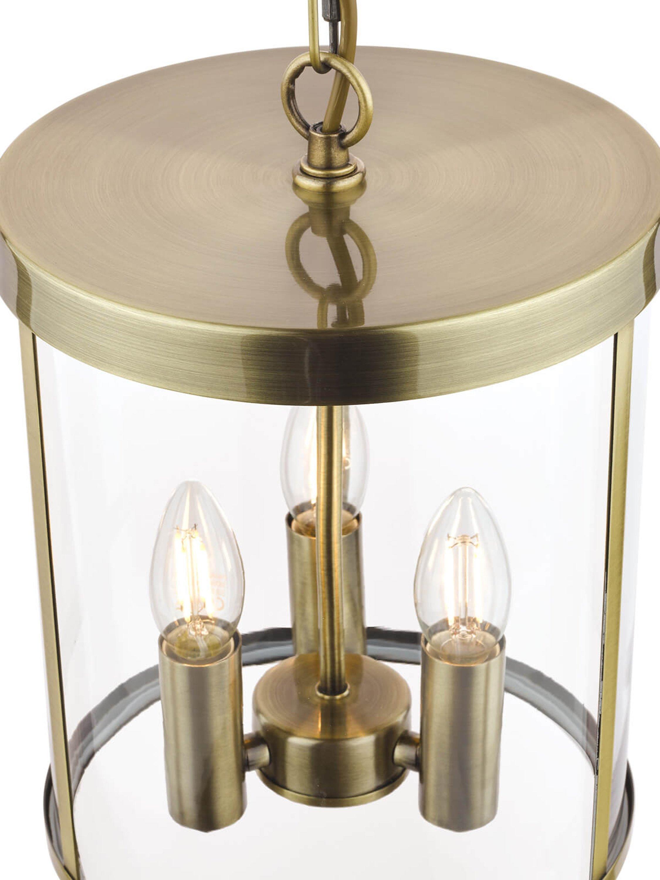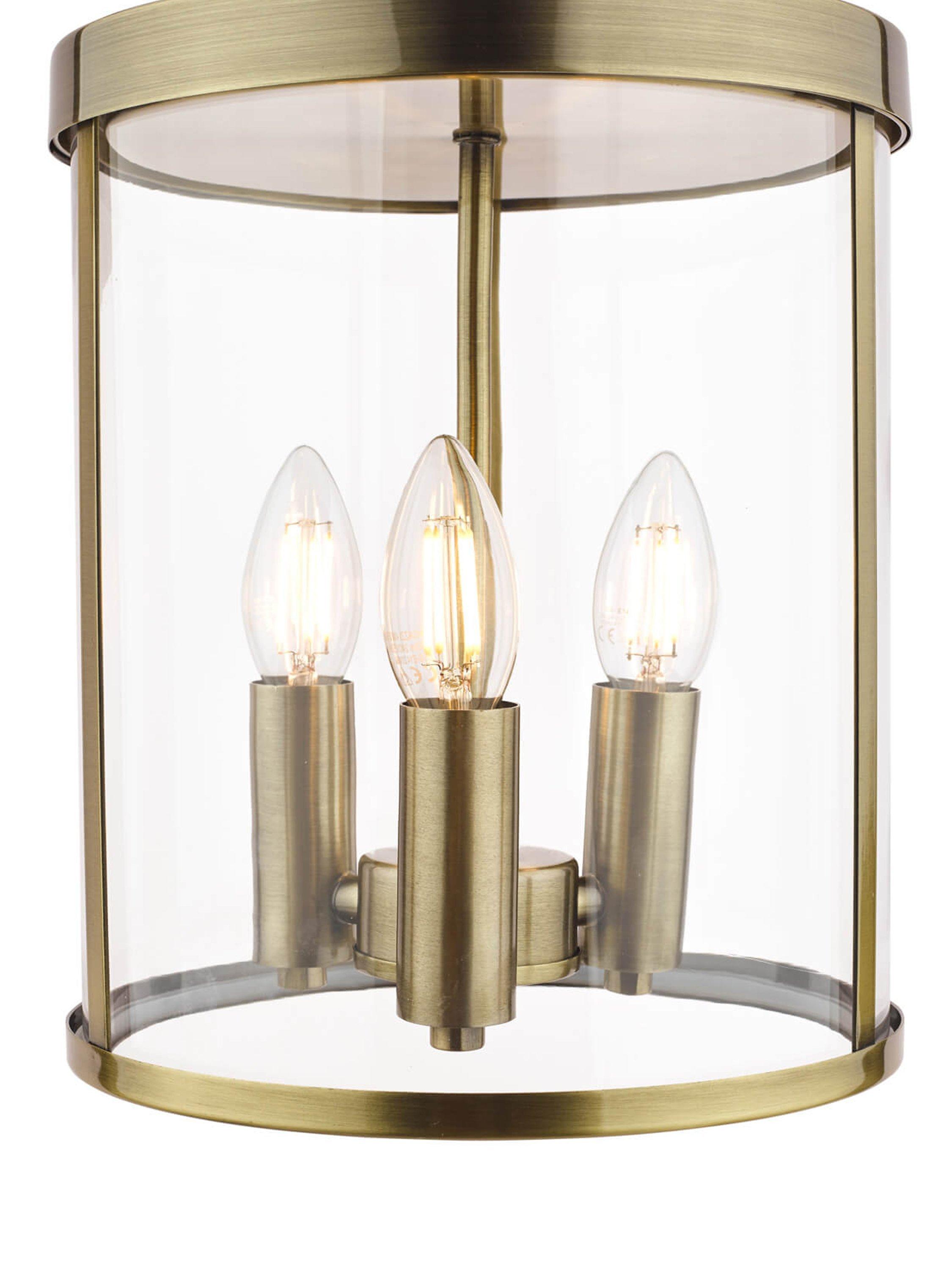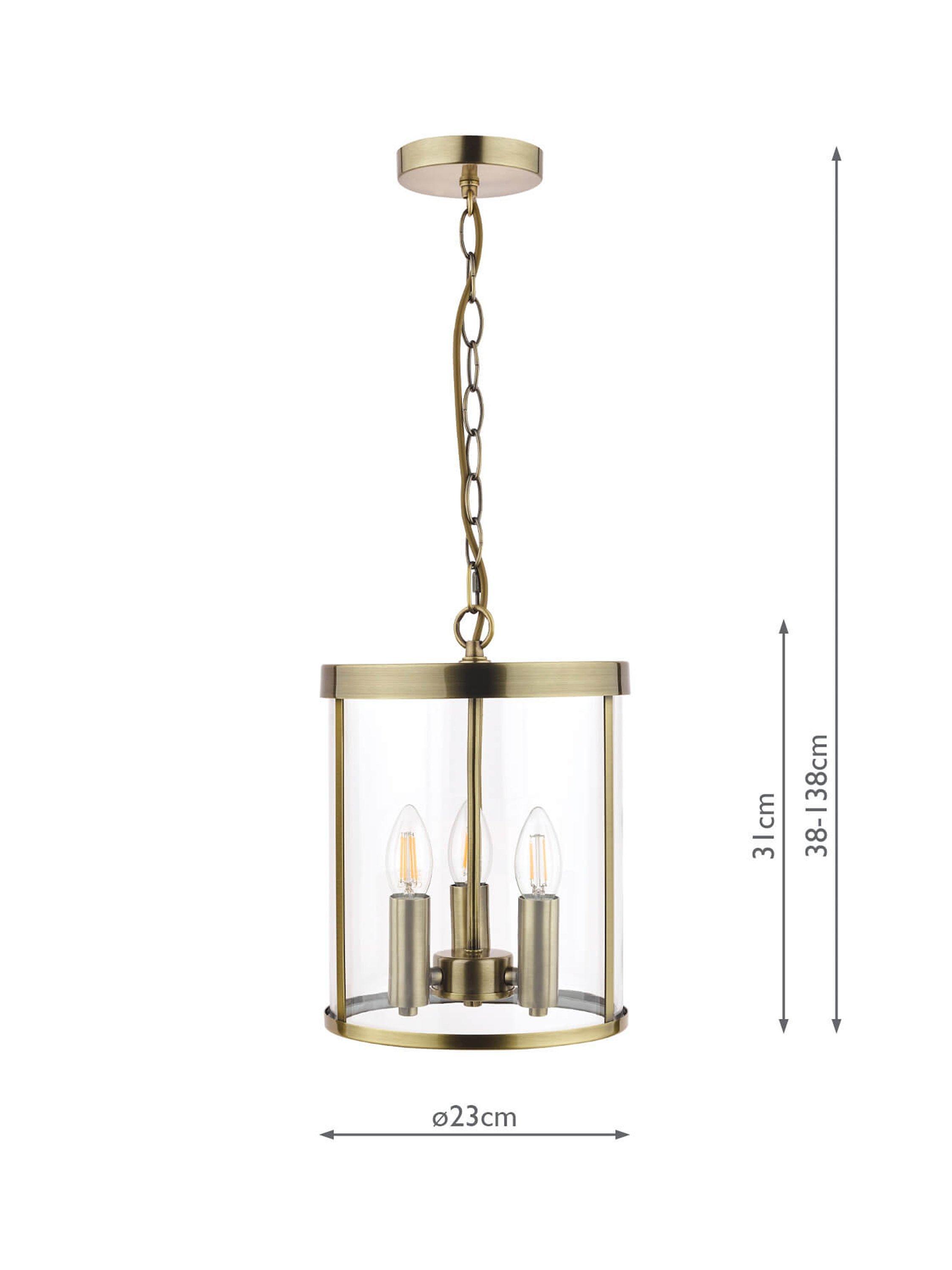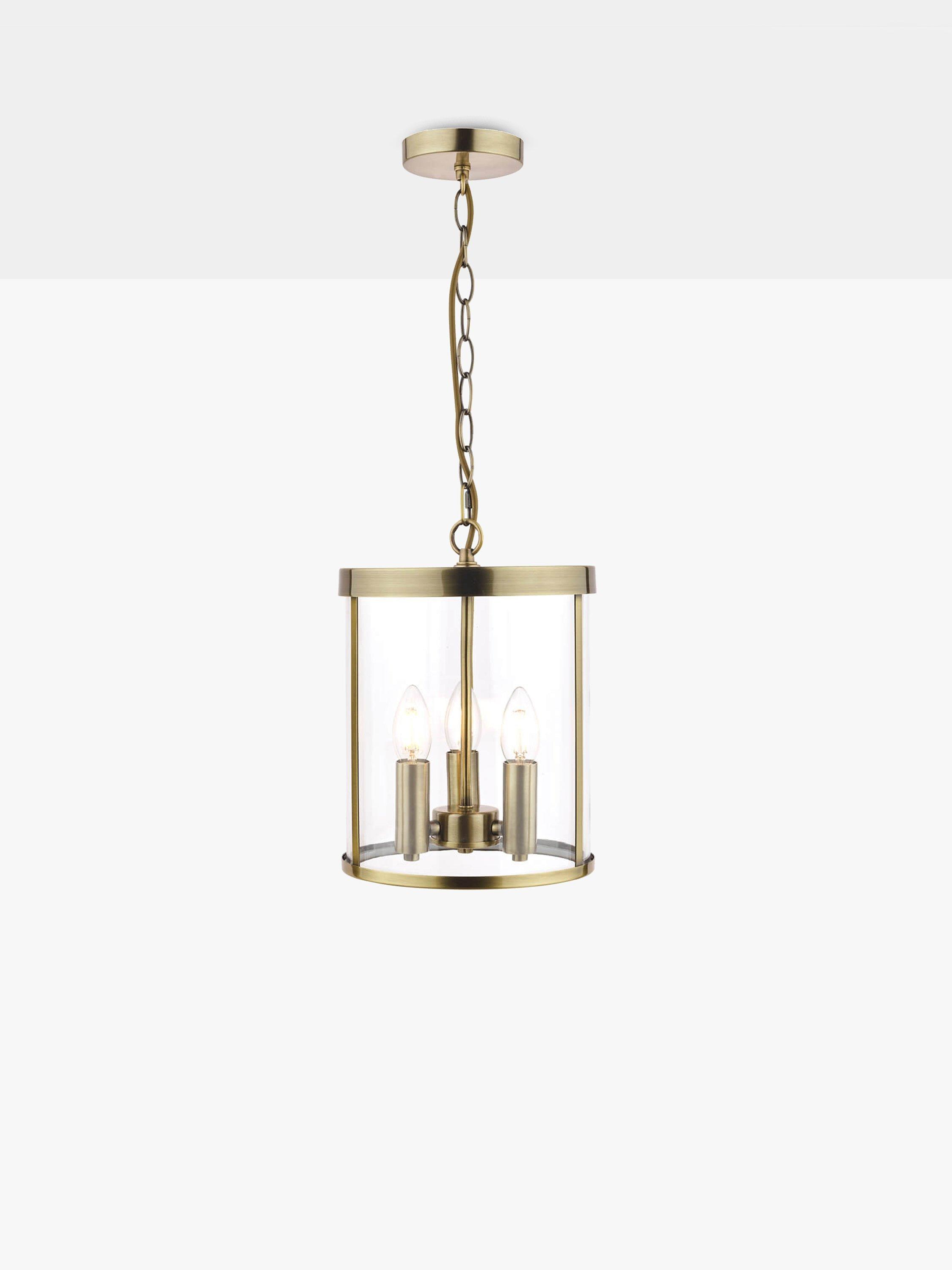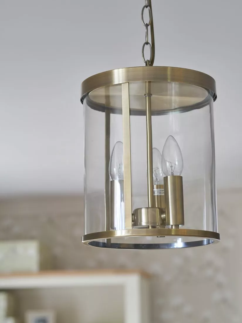 With its simple lantern-style design, this pendant blends both old and new styling. Encased within the glass frame are three bulbholders in the shape of a cluster and when illuminated, it will cast a glow of light around your space. The chain is height-adjustable at the point of installation, allowing for perfect positioning in your home. Available in a choice of two metal finishes.