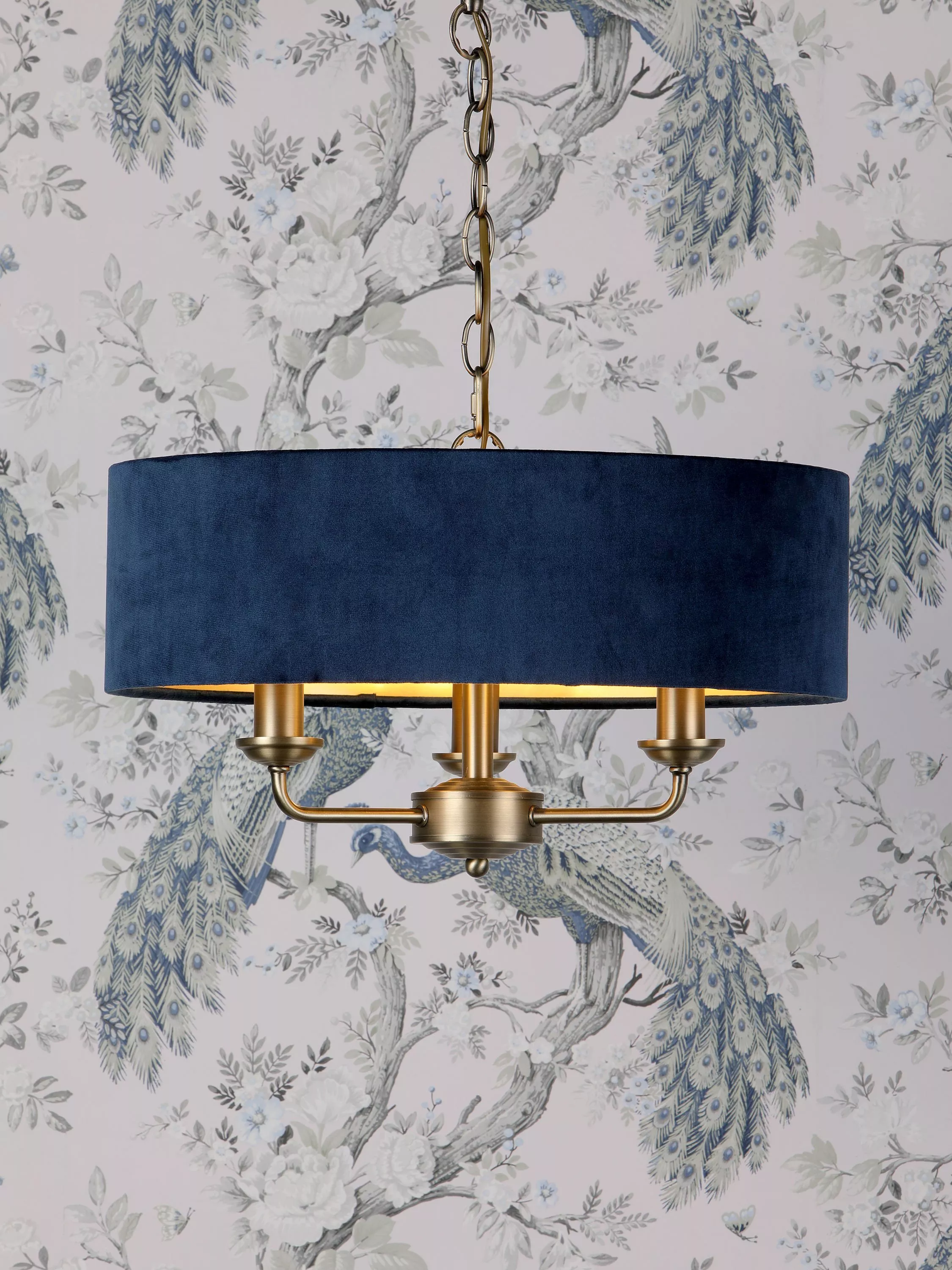 This timeless light fitting is ideal in living spaces and dining rooms, and it's suspended from a height-adjustable chain. Made from metal in a polished or satin finish, it's designed with a smart drum lampshade that encases three lights. The lampshade is made from slubbed linen and lined with a metallic inner to enhance a warm glow of light. Adding extra finesse, the ceiling rose has a stepped design that gives the fitting an Art-Deco inspired touch. Three LED bulbs are required.