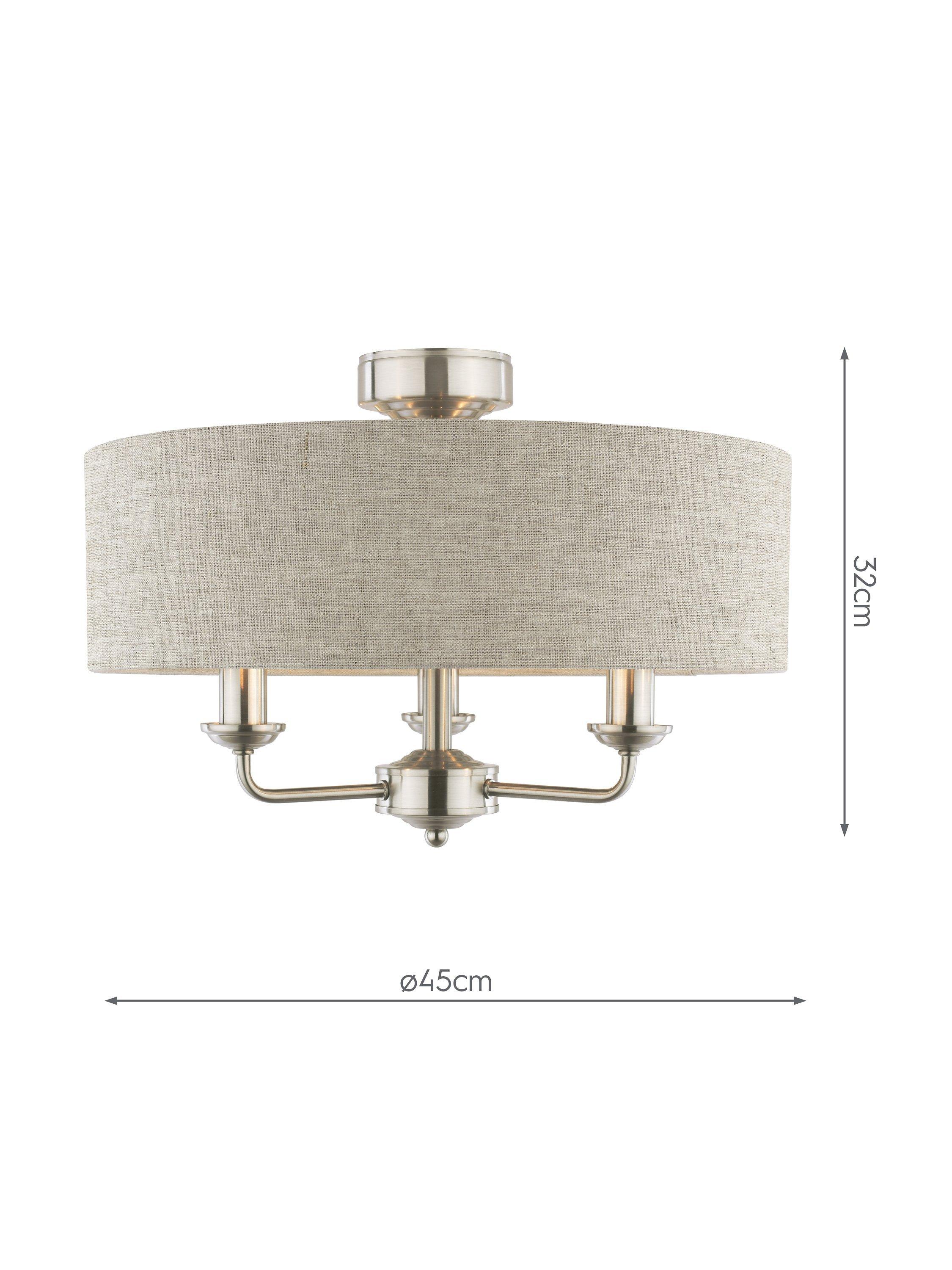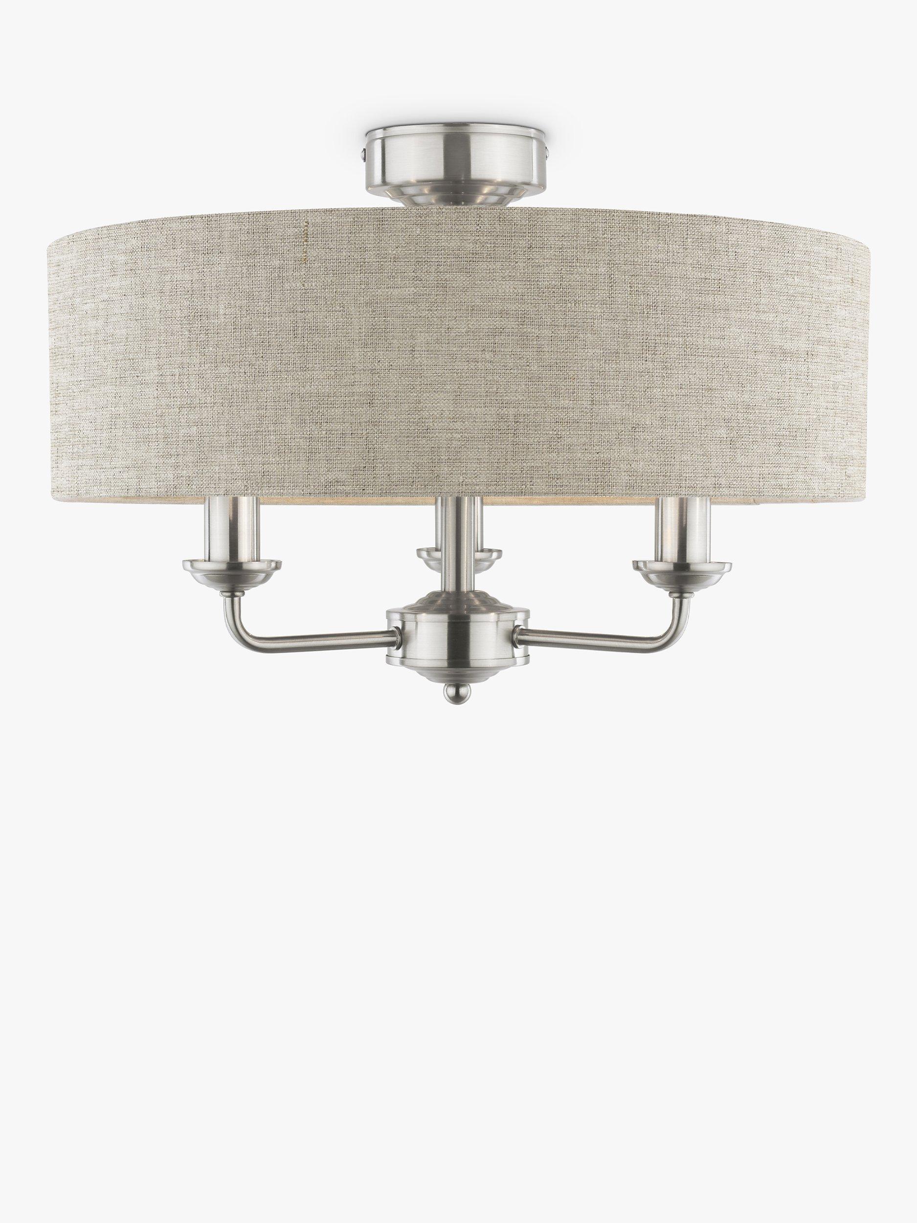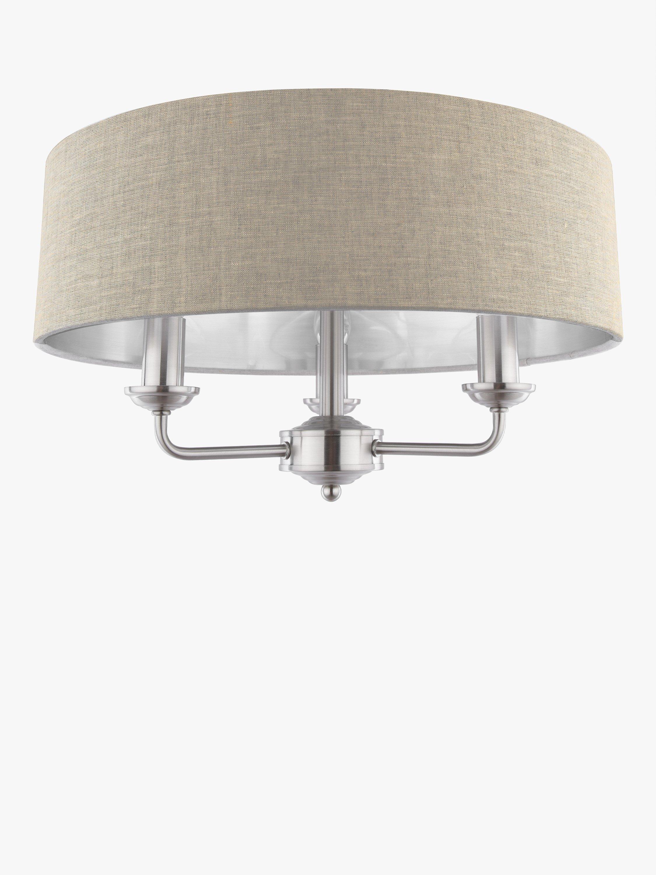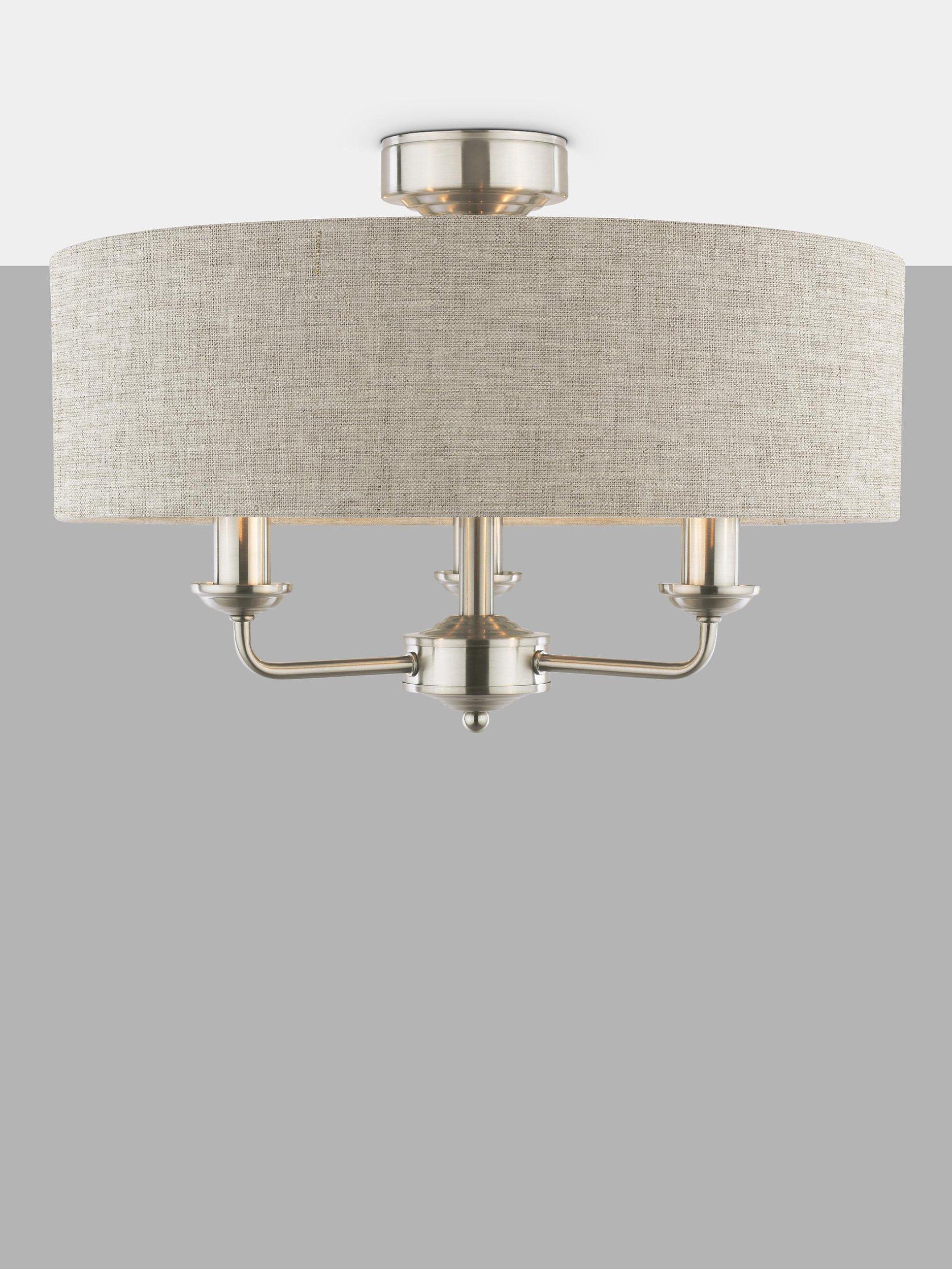 This timeless light fitting is ideal in living spaces and dining rooms, and it's suspended from a height-adjustable chain. Made from metal in a polished or satin finish, it's designed with a smart drum lampshade that encases three lights. The lampshade is made from slubbed linen and lined with a metallic inner to enhance a warm glow of light. Adding extra finesse, the ceiling rose has a stepped design that gives the fitting an Art-Deco inspired touch. Three LED bulbs are required.