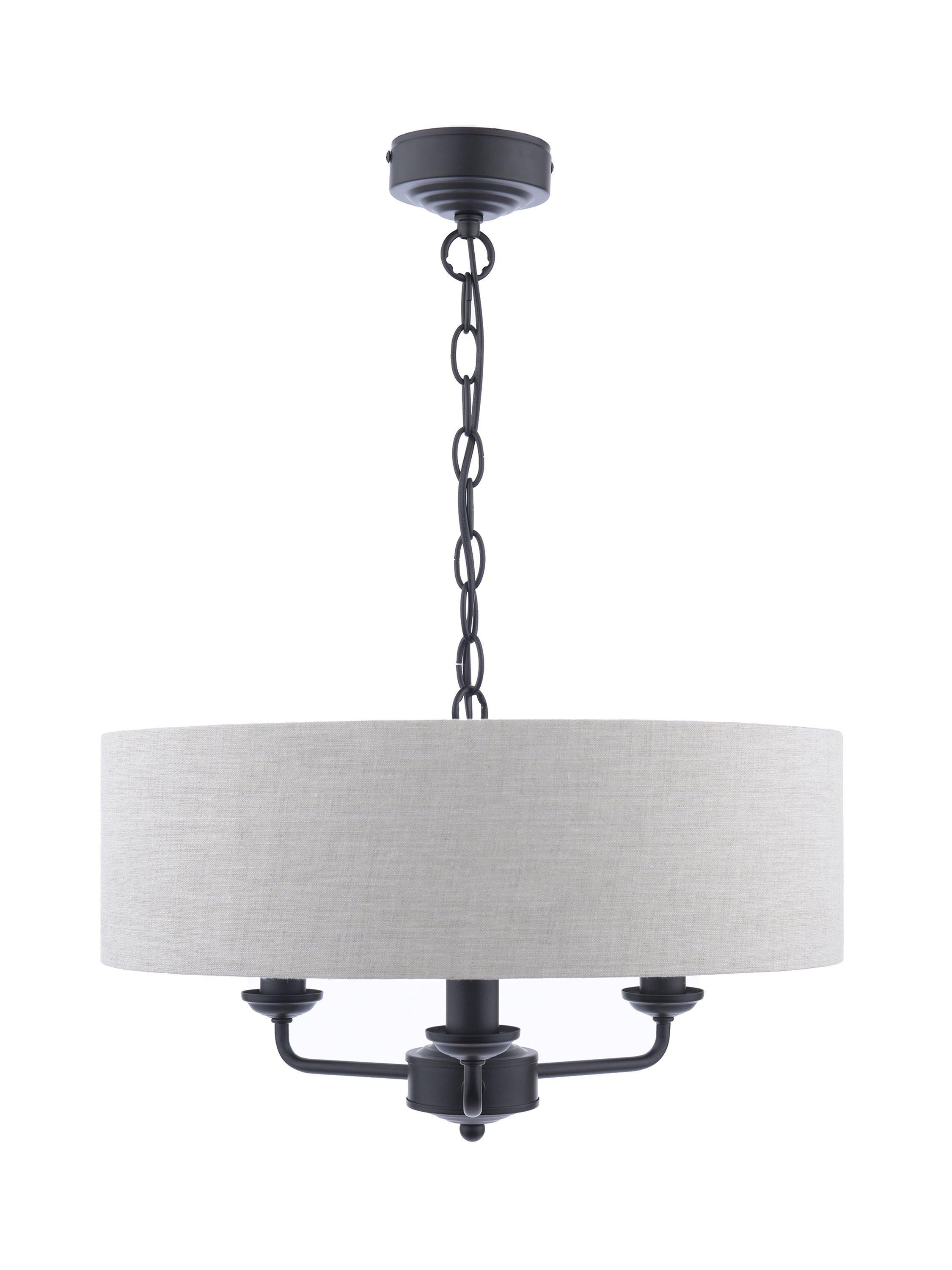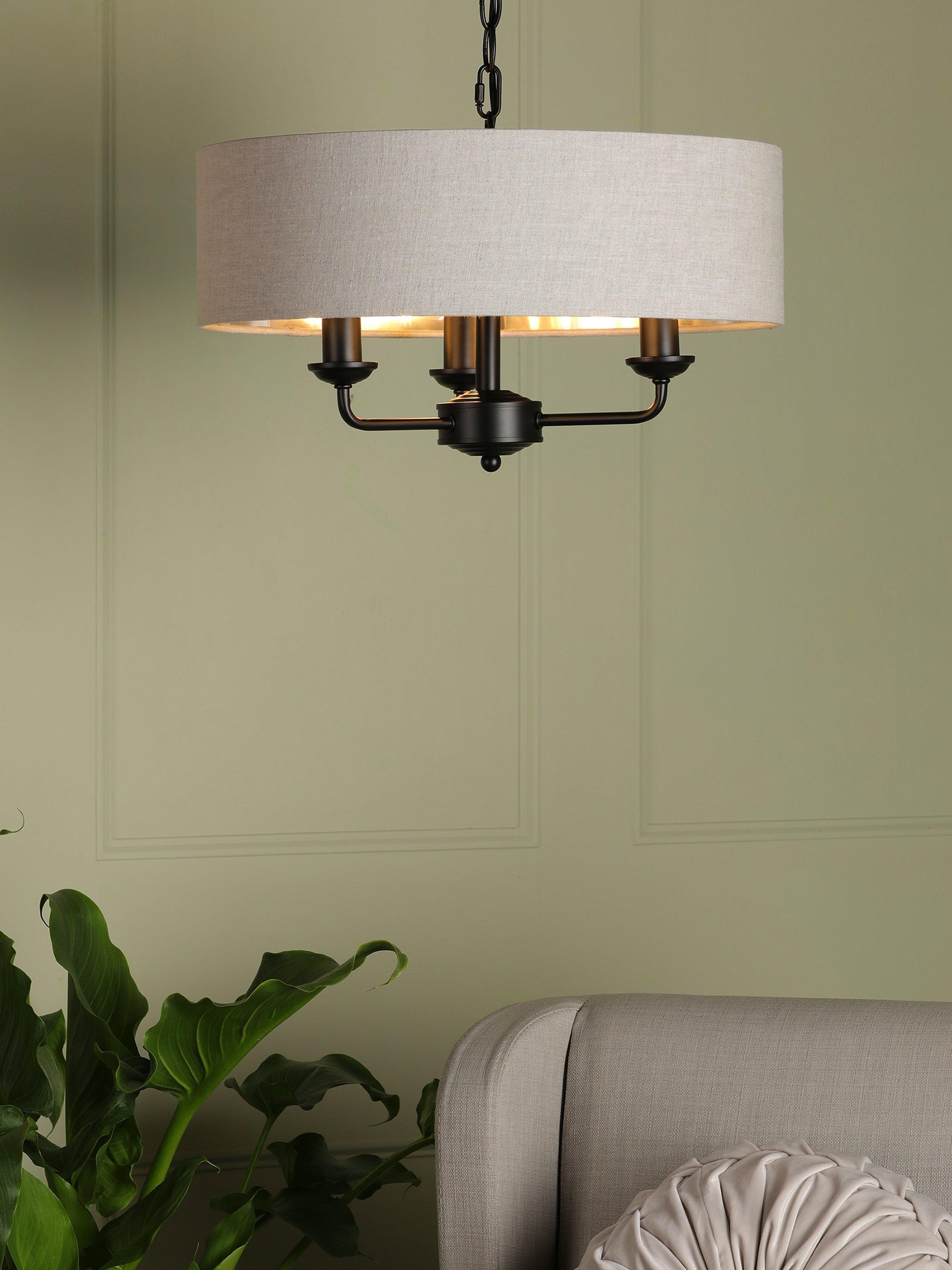 This timeless light fitting is ideal in living spaces and dining rooms, and it's suspended from a height-adjustable chain. Made from metal in a polished or satin finish, it's designed with a smart drum lampshade that encases three lights. The lampshade is made from slubbed linen and lined with a metallic inner to enhance a warm glow of light. Adding extra finesse, the ceiling rose has a stepped design that gives the fitting an Art-Deco inspired touch. Three LED bulbs are required.