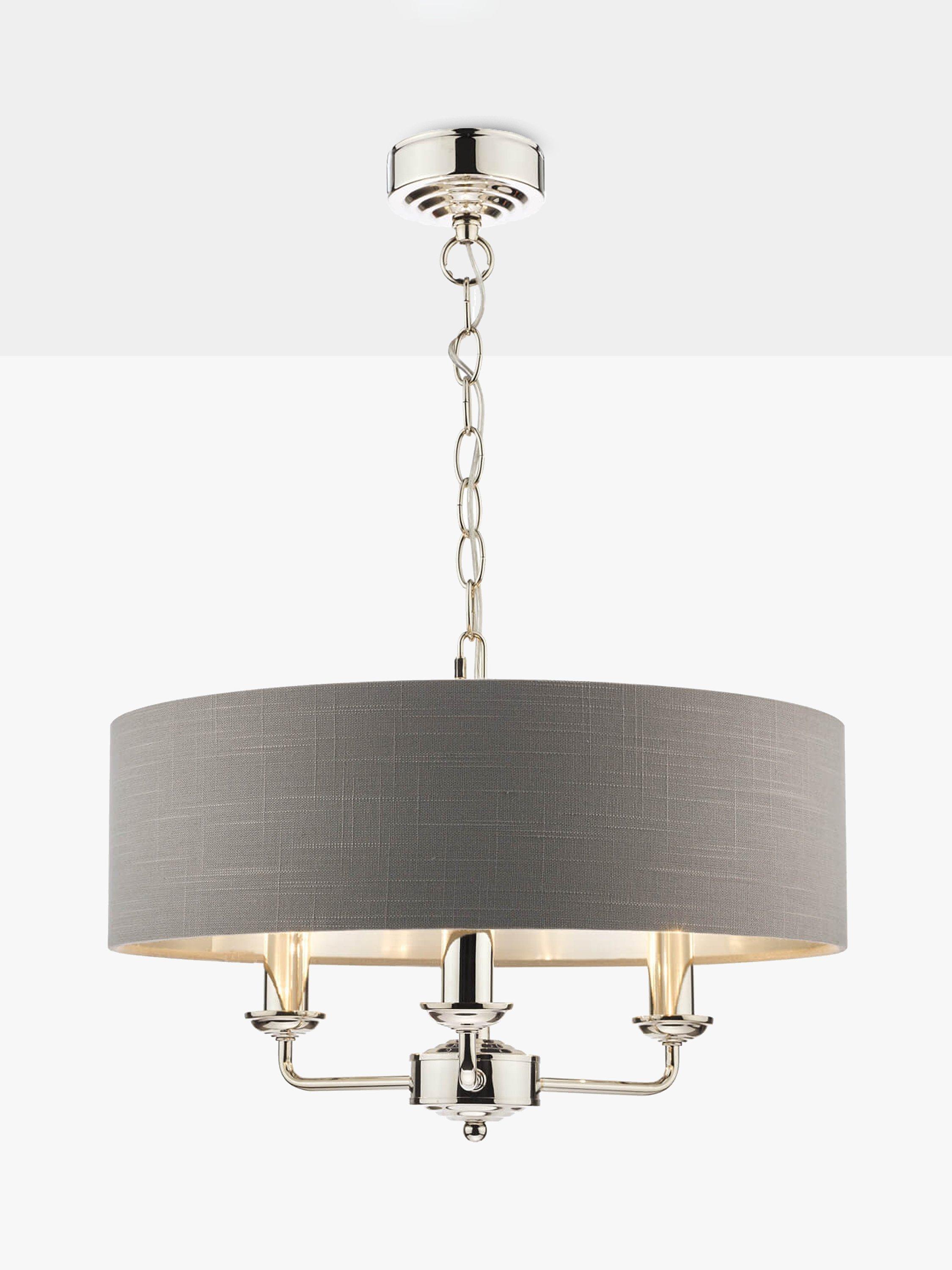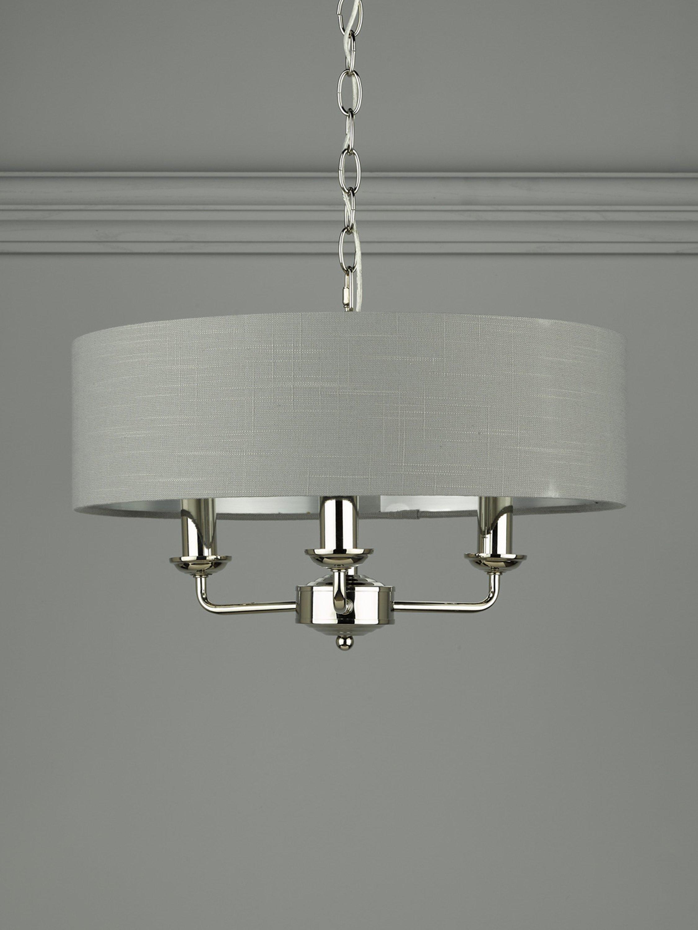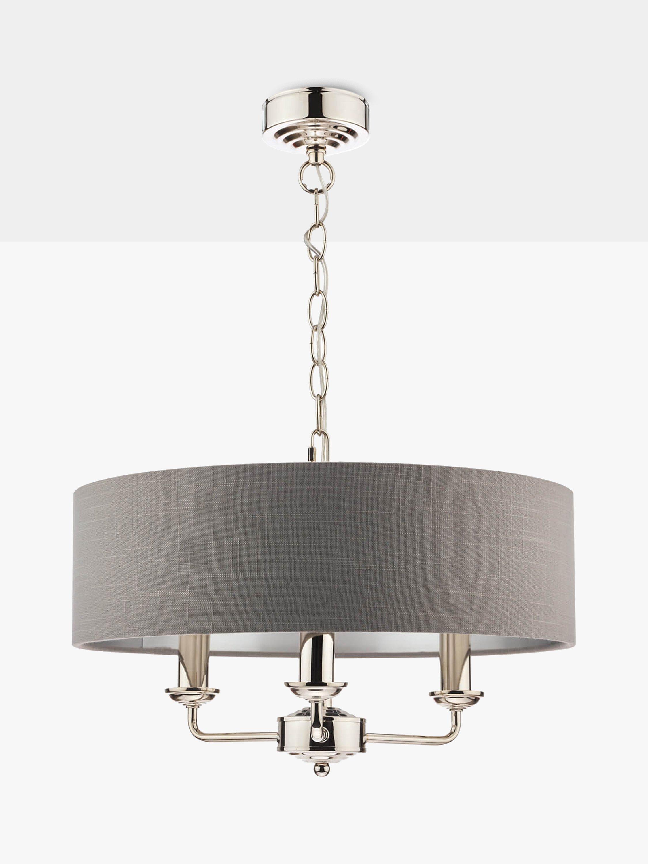 This timeless light fitting is ideal in living spaces and dining rooms, and it's suspended from a height-adjustable chain. Made from metal in a polished or satin finish, it's designed with a smart drum lampshade that encases three lights. The lampshade is made from slubbed linen and lined with a metallic inner to enhance a warm glow of light. Adding extra finesse, the ceiling rose has a stepped design that gives the fitting an Art-Deco inspired touch. Three LED bulbs are required.