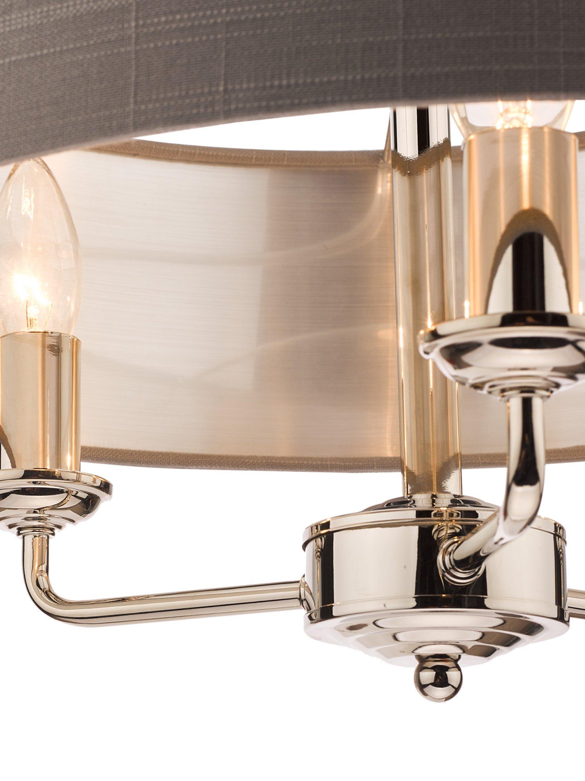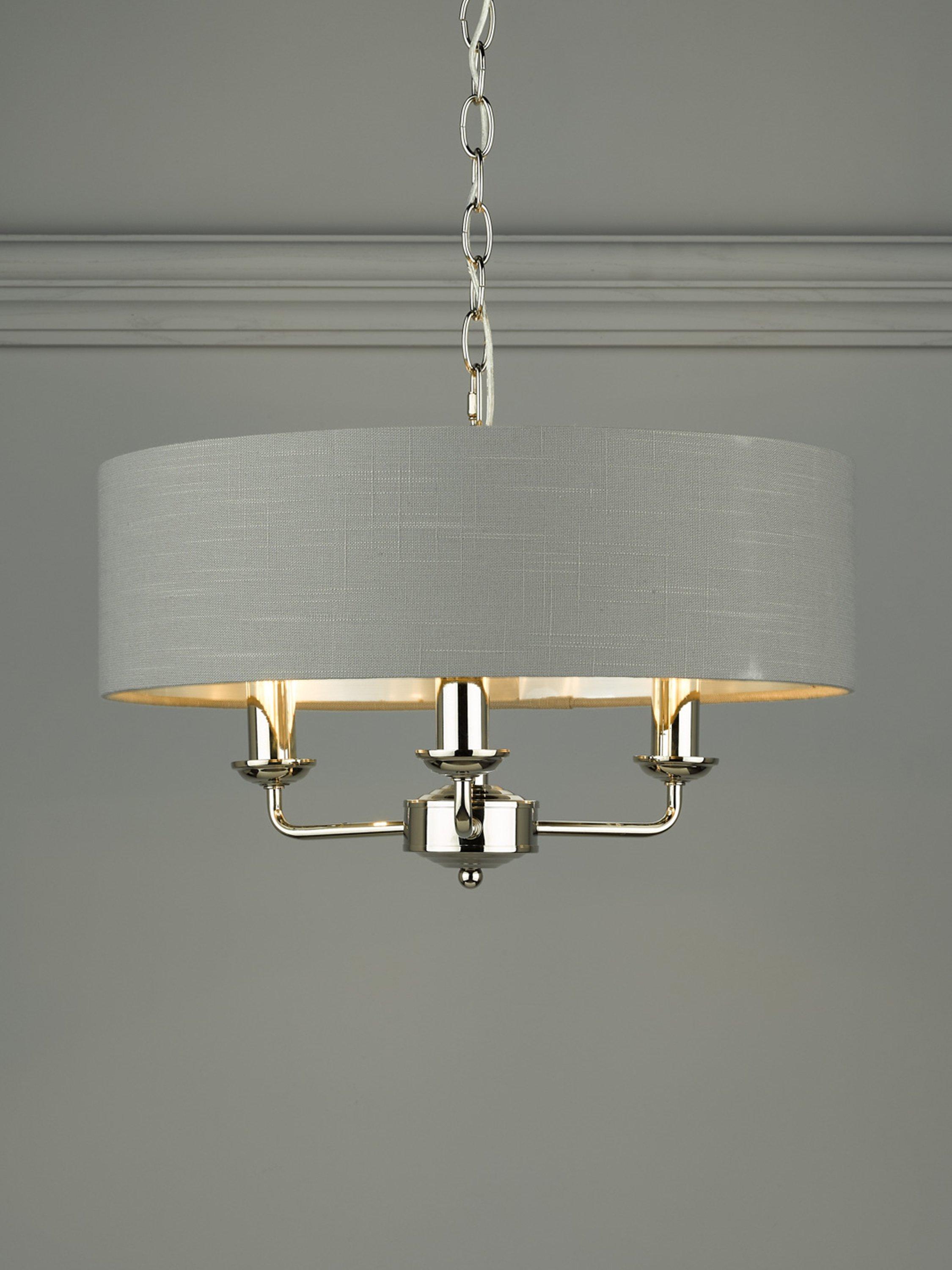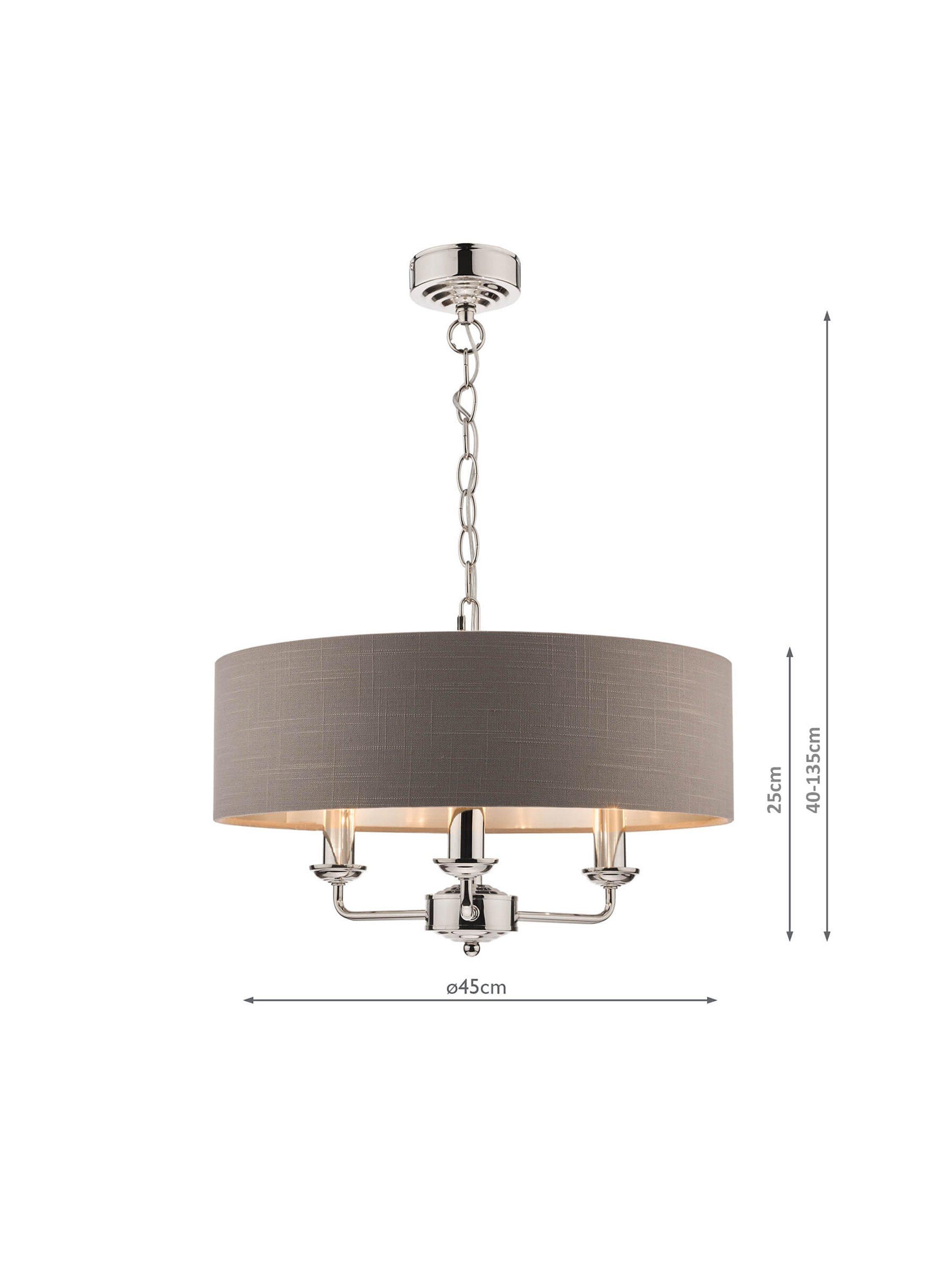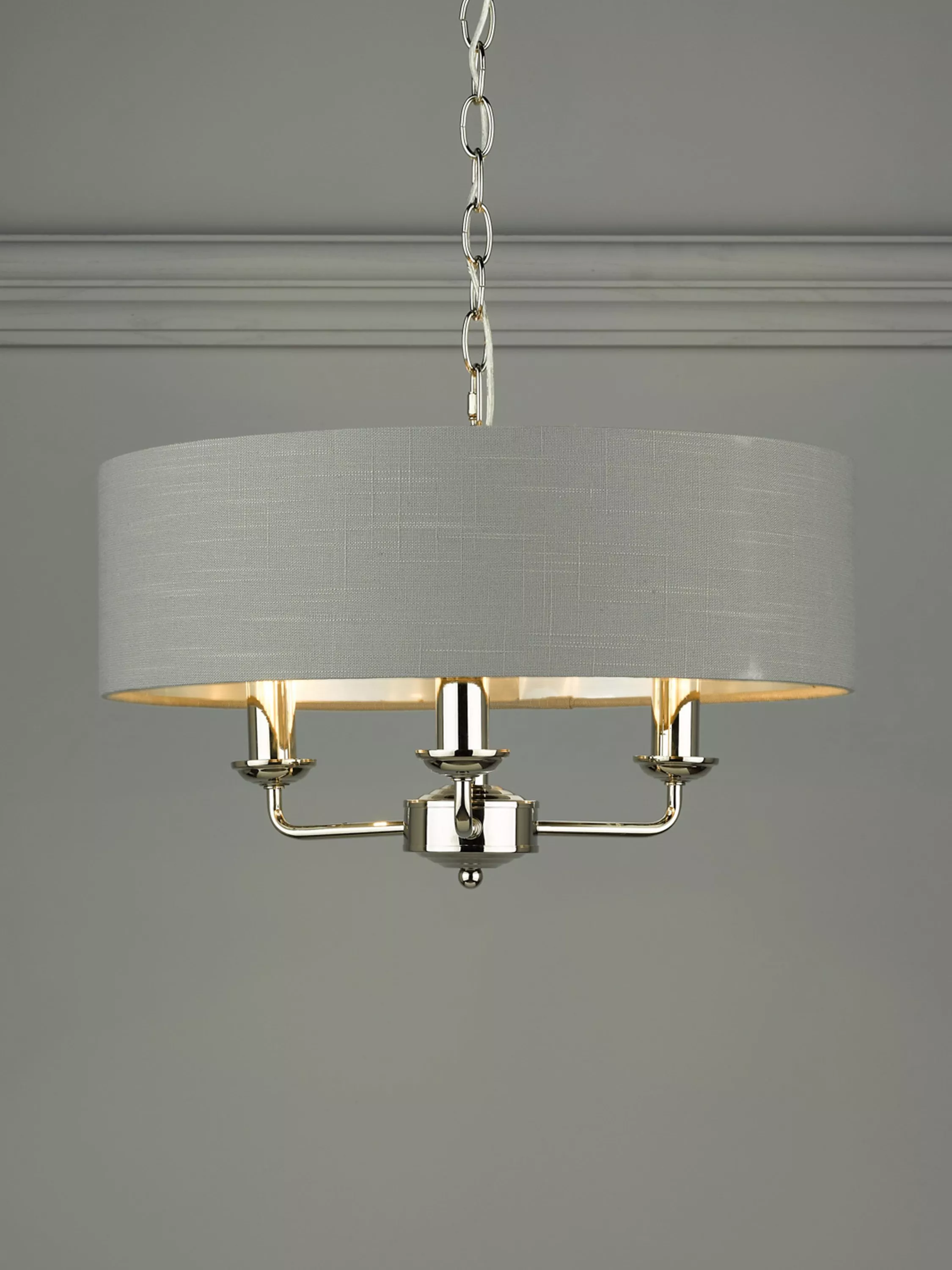 This timeless light fitting is ideal in living spaces and dining rooms, and it's suspended from a height-adjustable chain. Made from metal in a polished or satin finish, it's designed with a smart drum lampshade that encases three lights. The lampshade is made from slubbed linen and lined with a metallic inner to enhance a warm glow of light. Adding extra finesse, the ceiling rose has a stepped design that gives the fitting an Art-Deco inspired touch. Three LED bulbs are required.