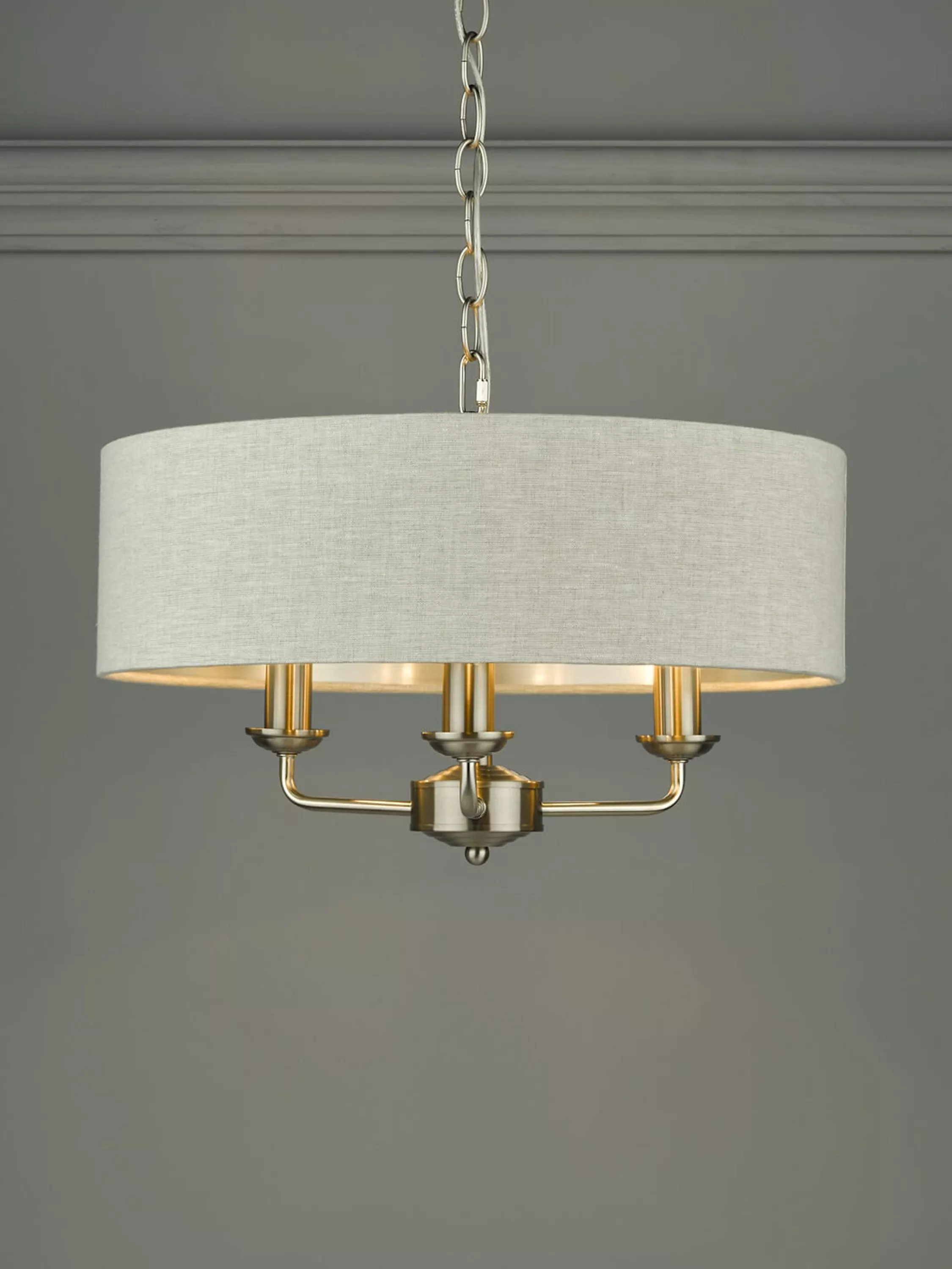 This timeless light fitting is ideal in living spaces and dining rooms, and it's suspended from a height-adjustable chain. Made from metal in a polished or satin finish, it's designed with a smart drum lampshade that encases three lights. The lampshade is made from slubbed linen and lined with a metallic inner to enhance a warm glow of light. Adding extra finesse, the ceiling rose has a stepped design that gives the fitting an Art-Deco inspired touch. Three LED bulbs are required.