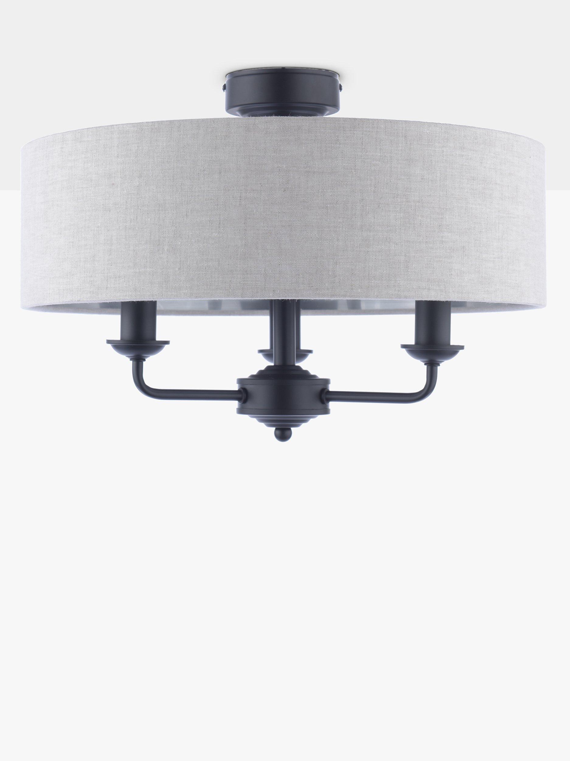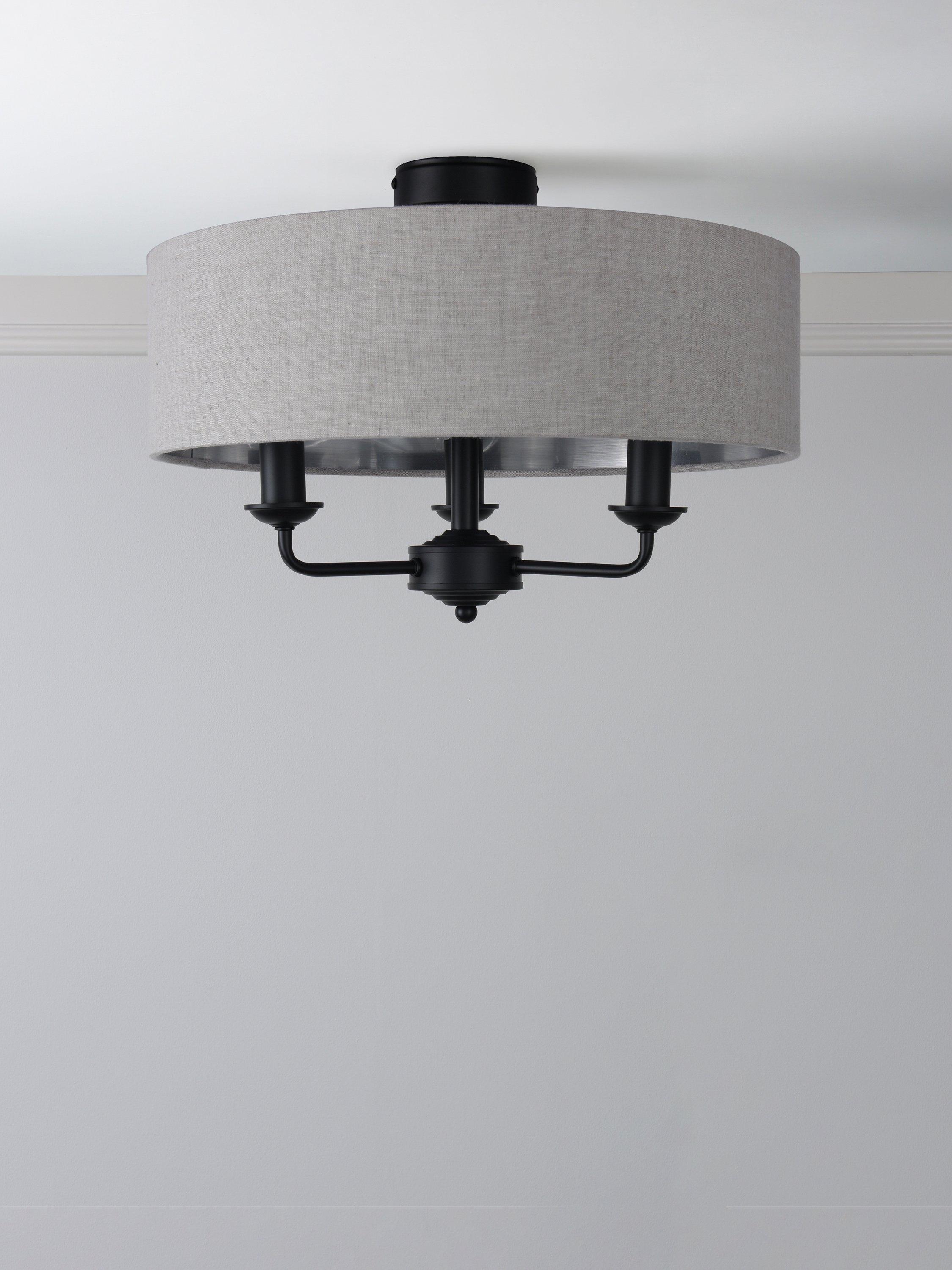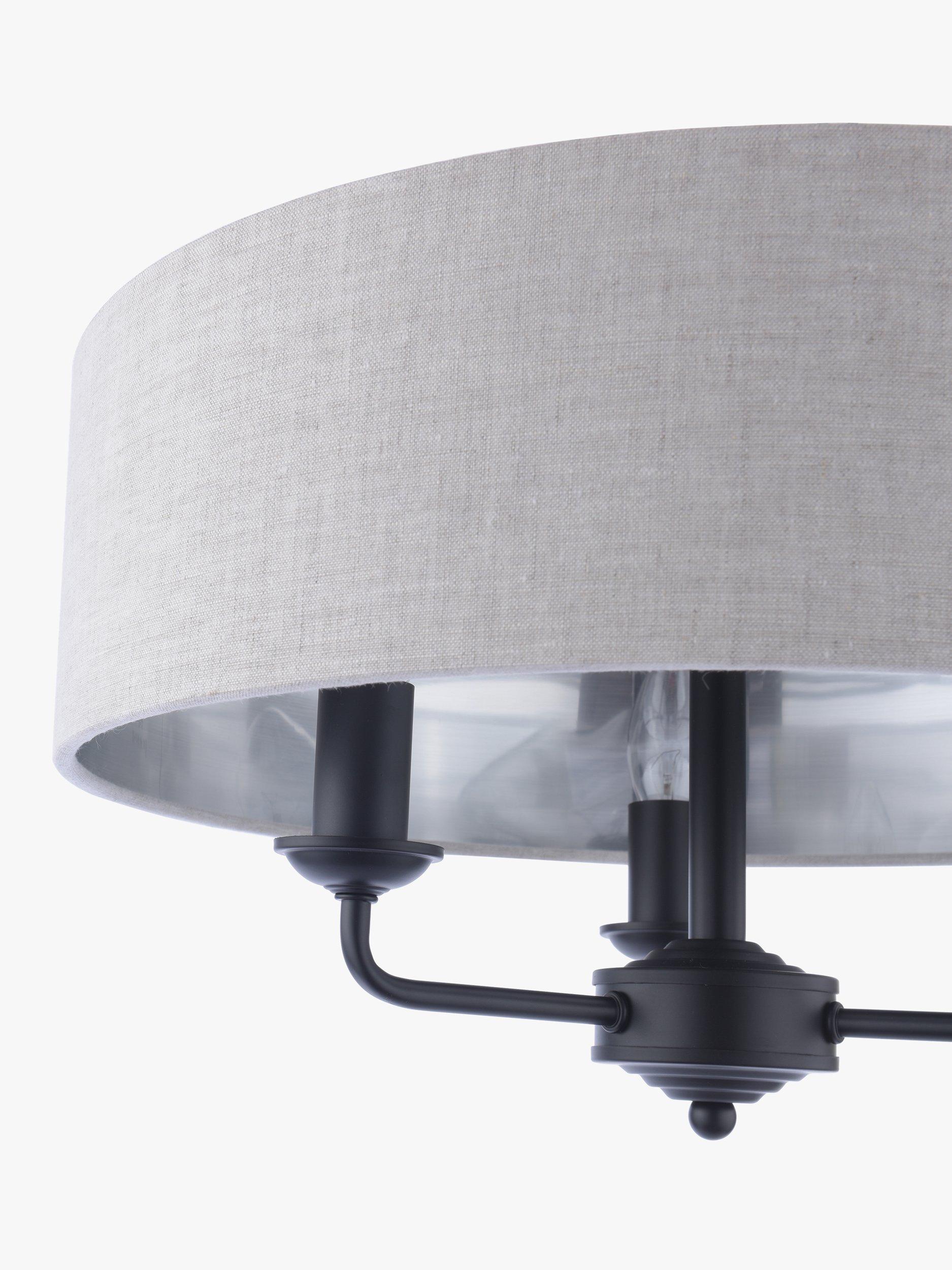 This timeless light fitting is ideal in living spaces and dining rooms. Made from metal, it's designed with a smart drum lampshade that encases three lights. The lampshade is made from fabric which allows a warm glow of light. Adding extra finesse, the ceiling rose has a stepped design that gives the fitting an Art-Deco inspired touch. Three LED bulbs are required.