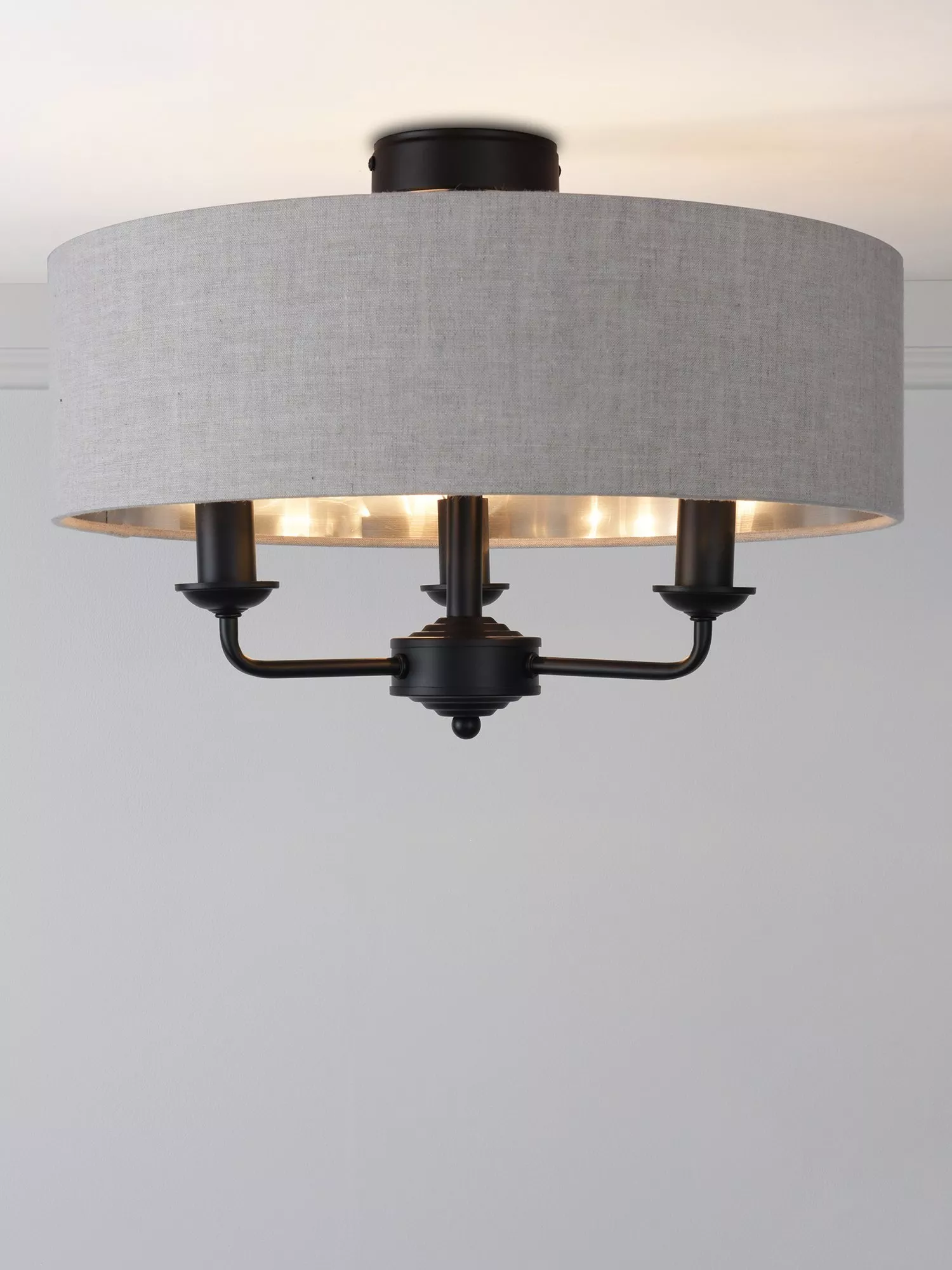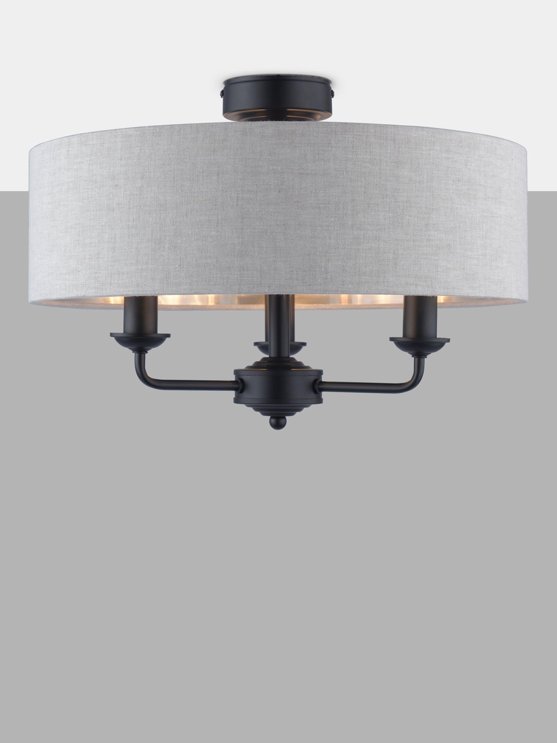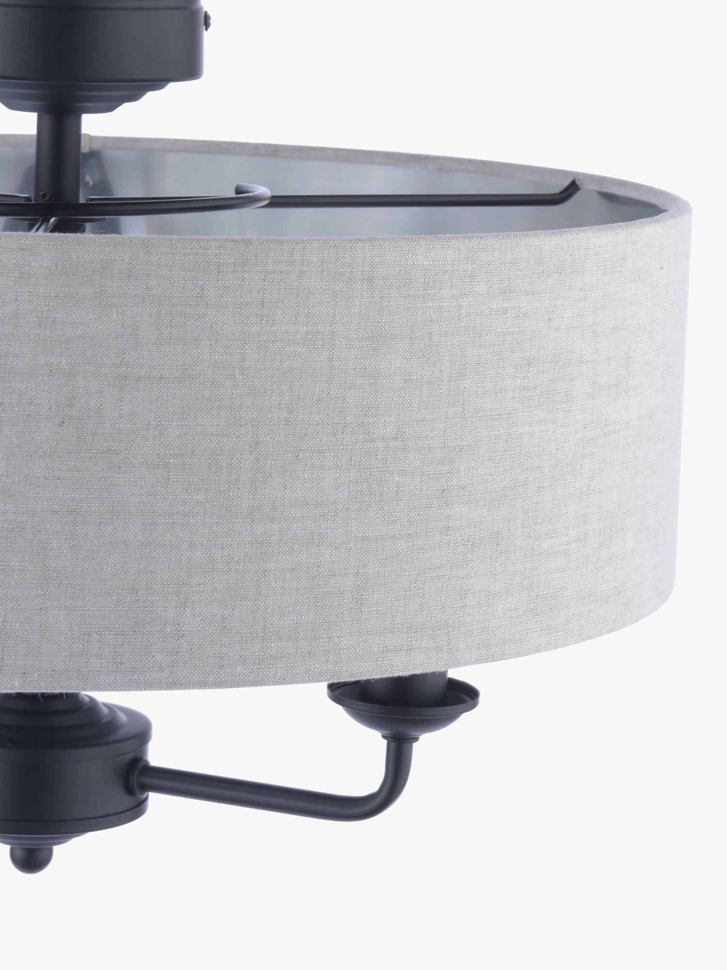 This timeless light fitting is ideal in living spaces and dining rooms. Made from metal, it's designed with a smart drum lampshade that encases three lights. The lampshade is made from fabric which allows a warm glow of light. Adding extra finesse, the ceiling rose has a stepped design that gives the fitting an Art-Deco inspired touch. Three LED bulbs are required.