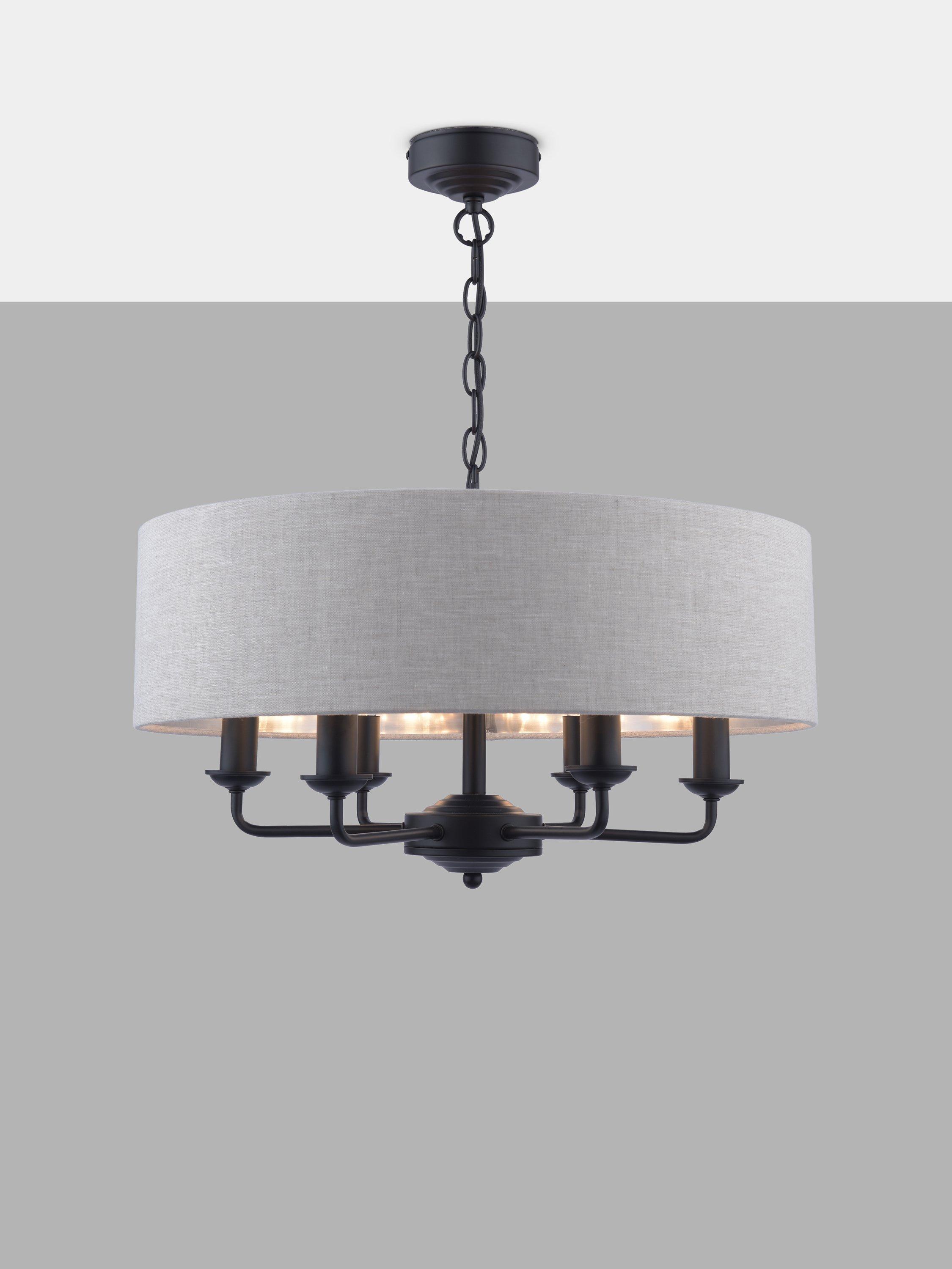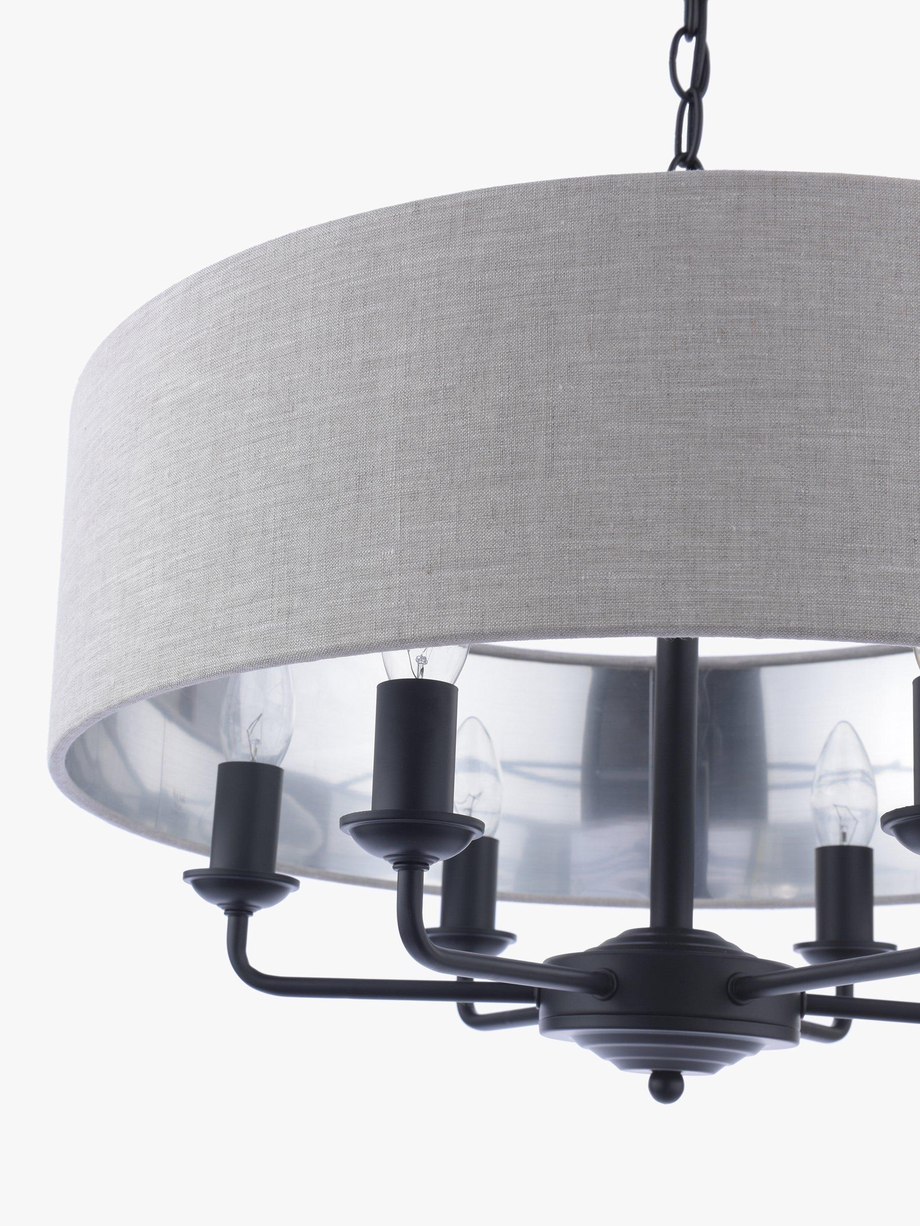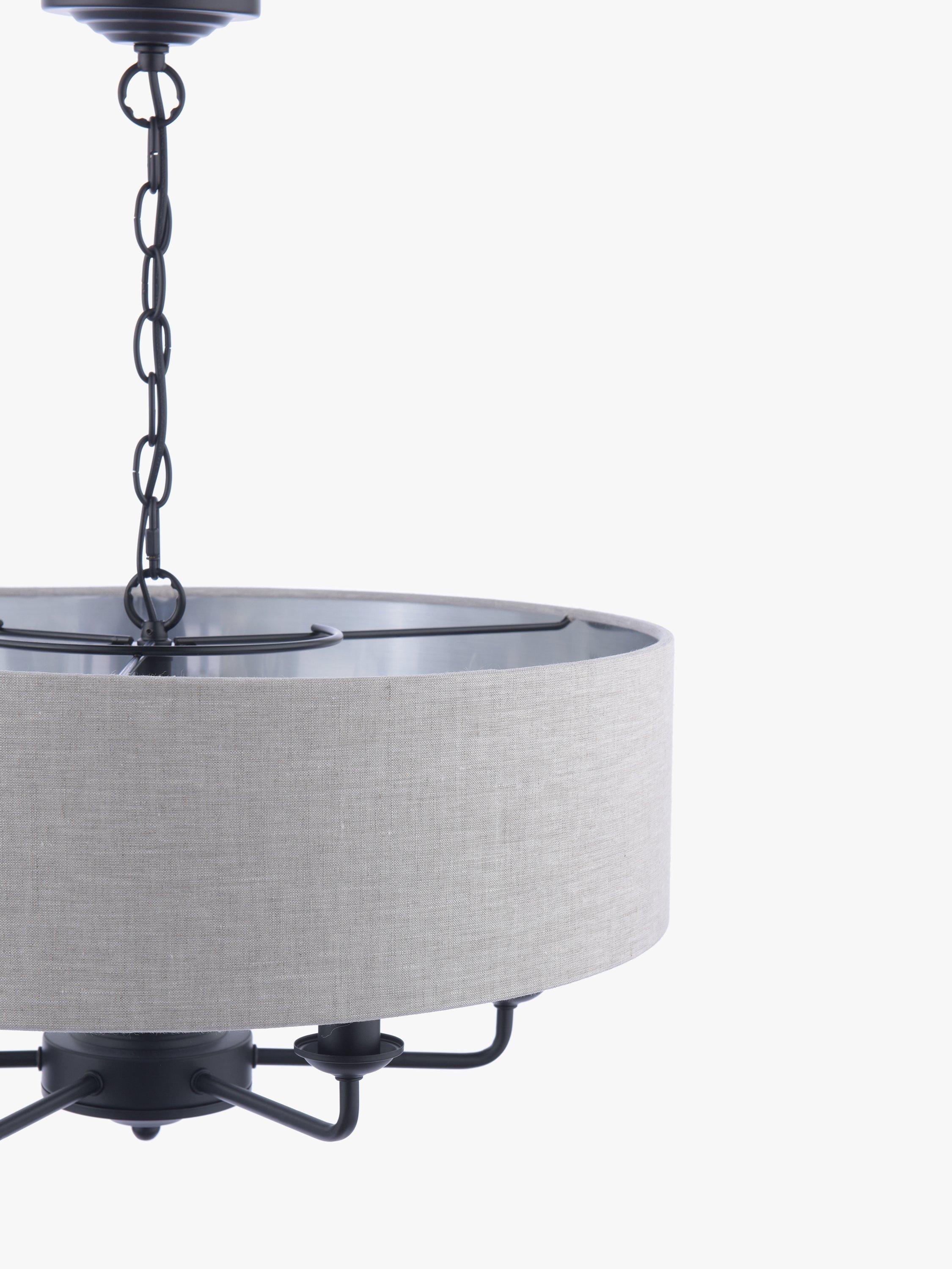 This timeless light fitting is ideal in living spaces and dining rooms, and it's suspended from a height-adjustable chain. Made from metal, it's designed with a smart drum lampshade that encases six lights. The lampshade is made from fabric which allows a warm glow of light. Adding extra finesse, the ceiling rose has a stepped design that gives the fitting an Art-Deco inspired touch. Six LED bulbs are required.