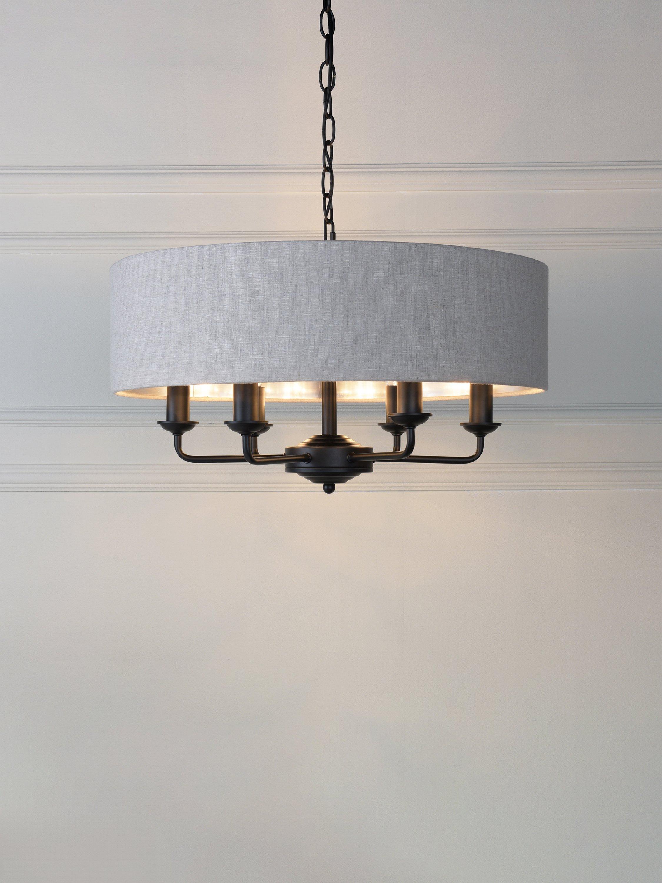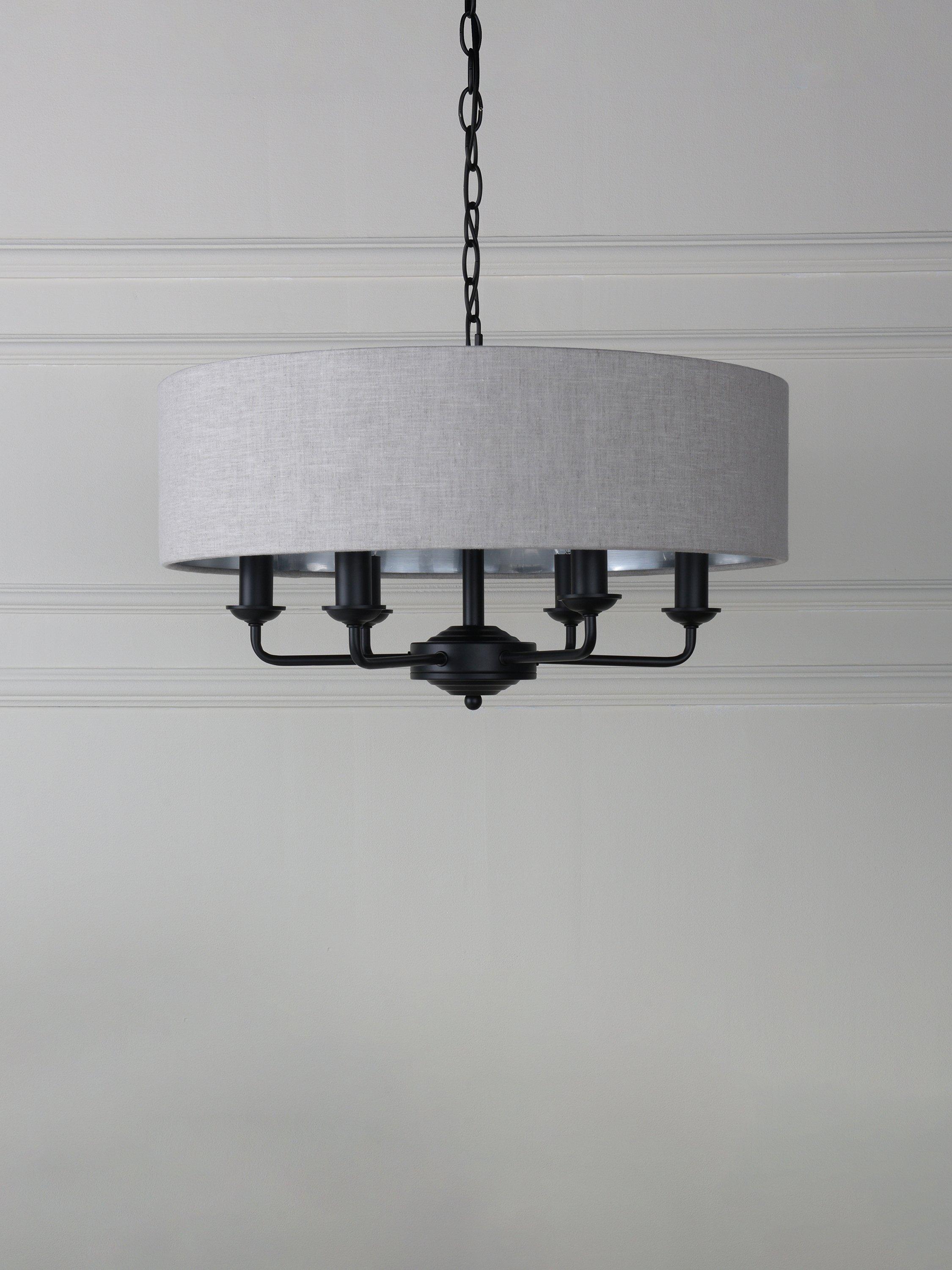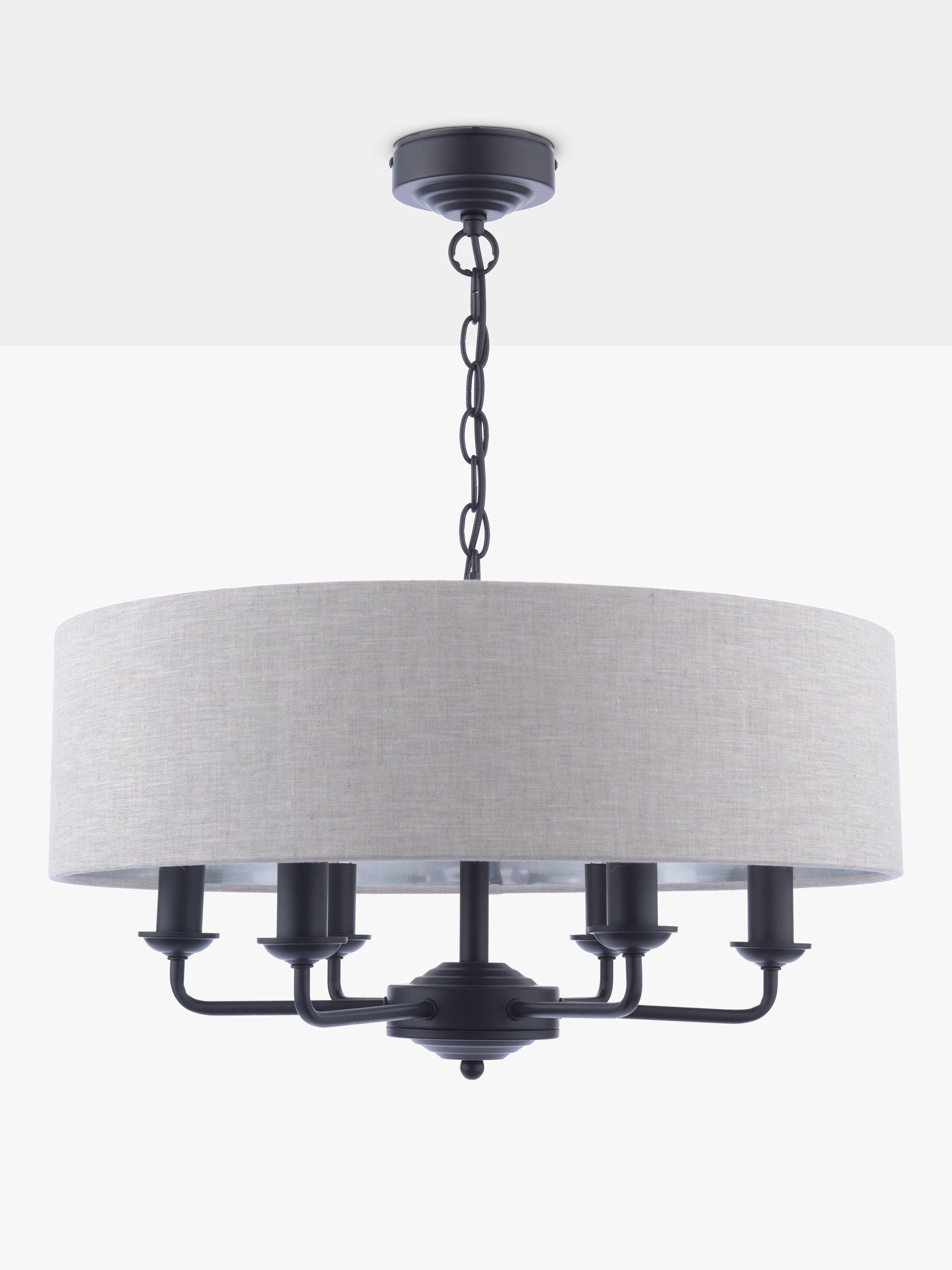 This timeless light fitting is ideal in living spaces and dining rooms, and it's suspended from a height-adjustable chain. Made from metal, it's designed with a smart drum lampshade that encases six lights. The lampshade is made from fabric which allows a warm glow of light. Adding extra finesse, the ceiling rose has a stepped design that gives the fitting an Art-Deco inspired touch. Six LED bulbs are required.