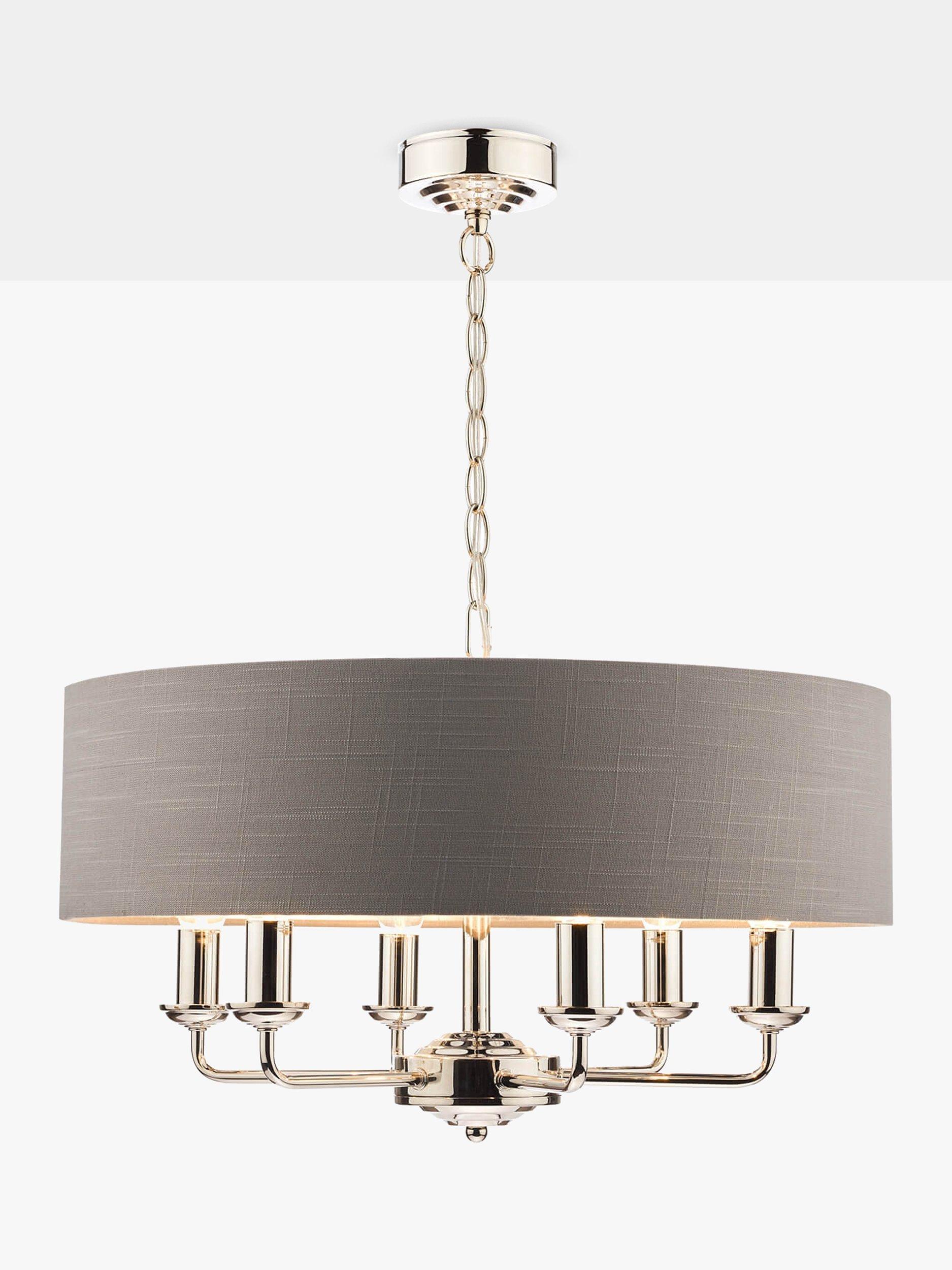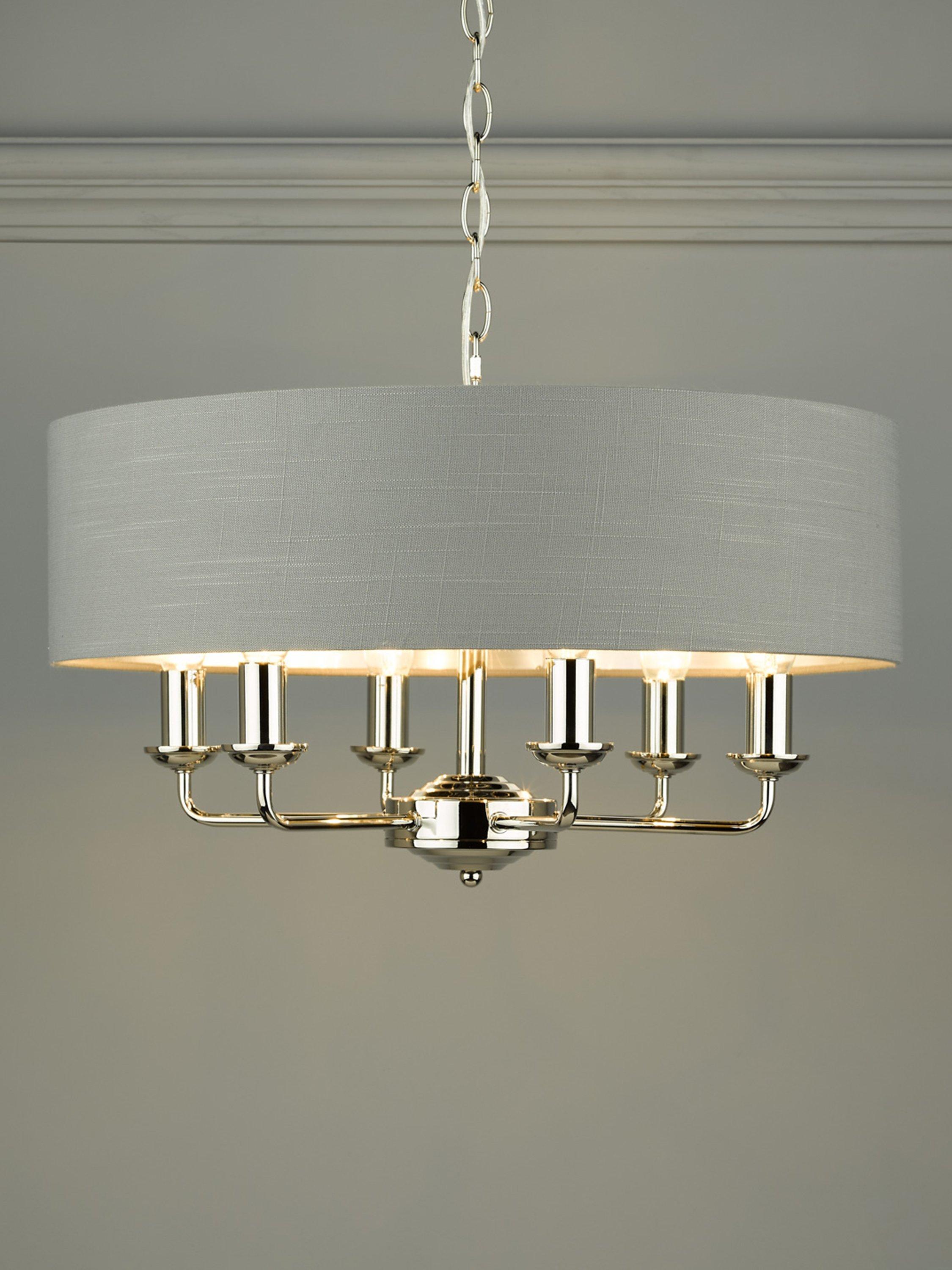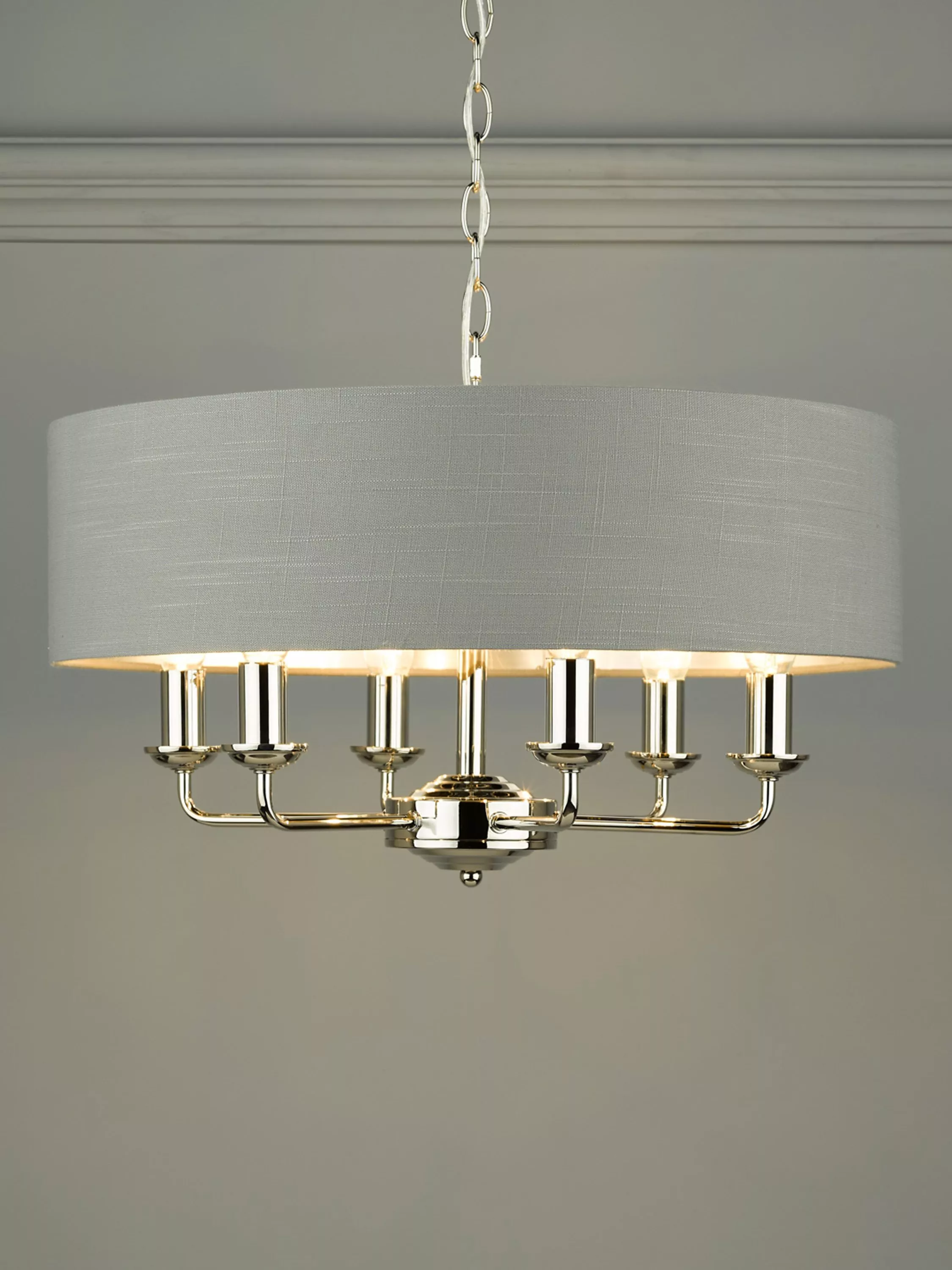 Generous in size, this timeless light fitting is ideal in living spaces and dining rooms, and it's suspended from a height-adjustable chain. Made from metal in a polished or satin finish, it's designed with a smart drum lampshade that encases six lights. The lampshade is made from slubbed linen and lined with a metallic inner to enhance a warm glow of light. Adding extra finesse, the ceiling rose has a stepped design that gives the fitting an Art-Deco inspired touch. Six LED bulbs are required.