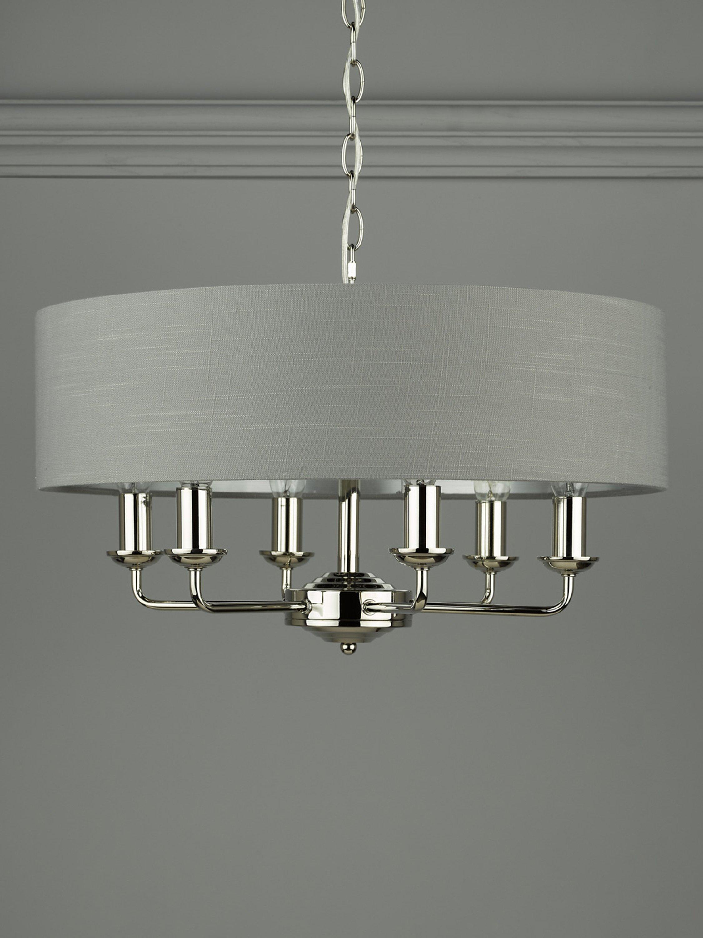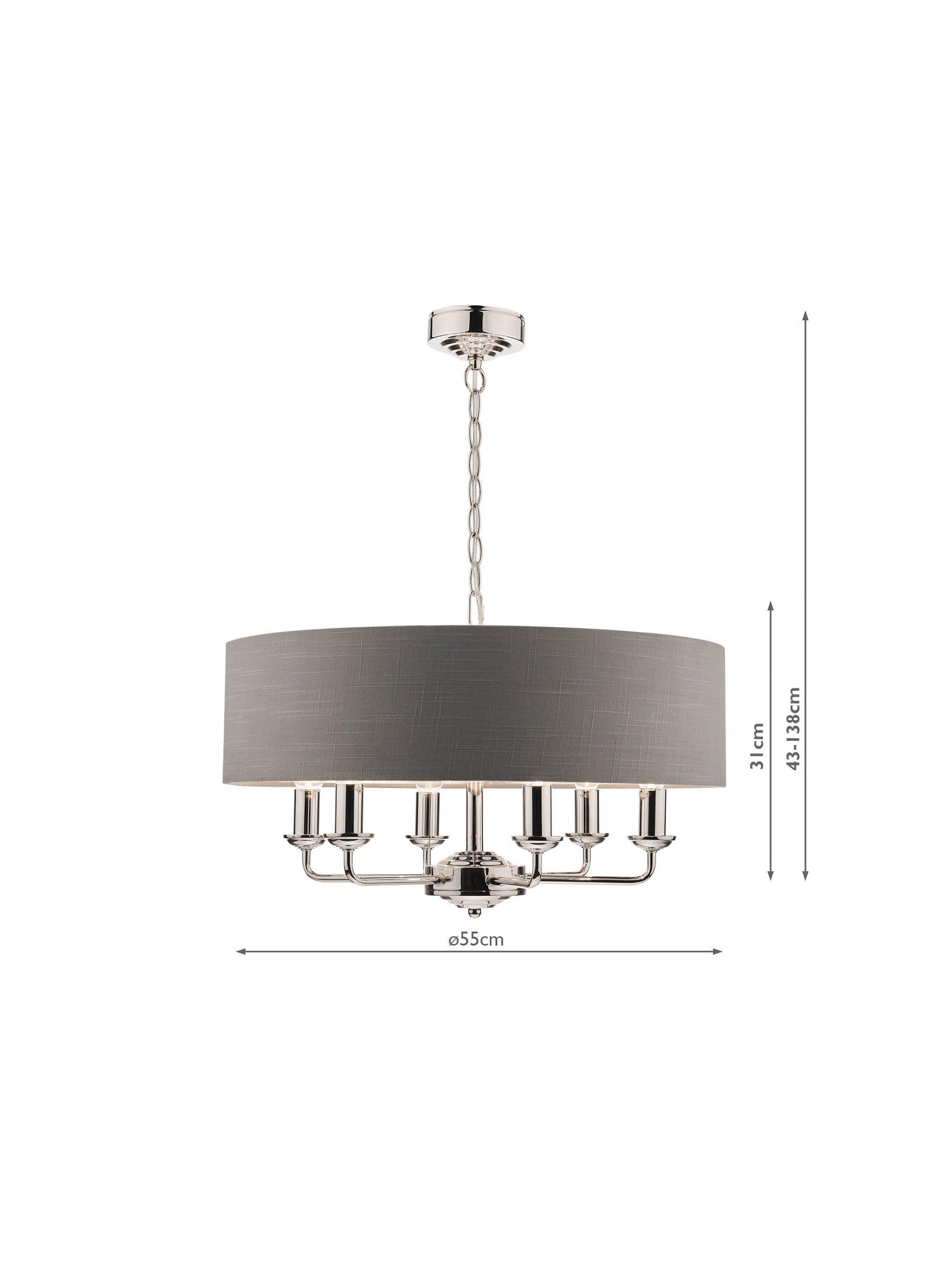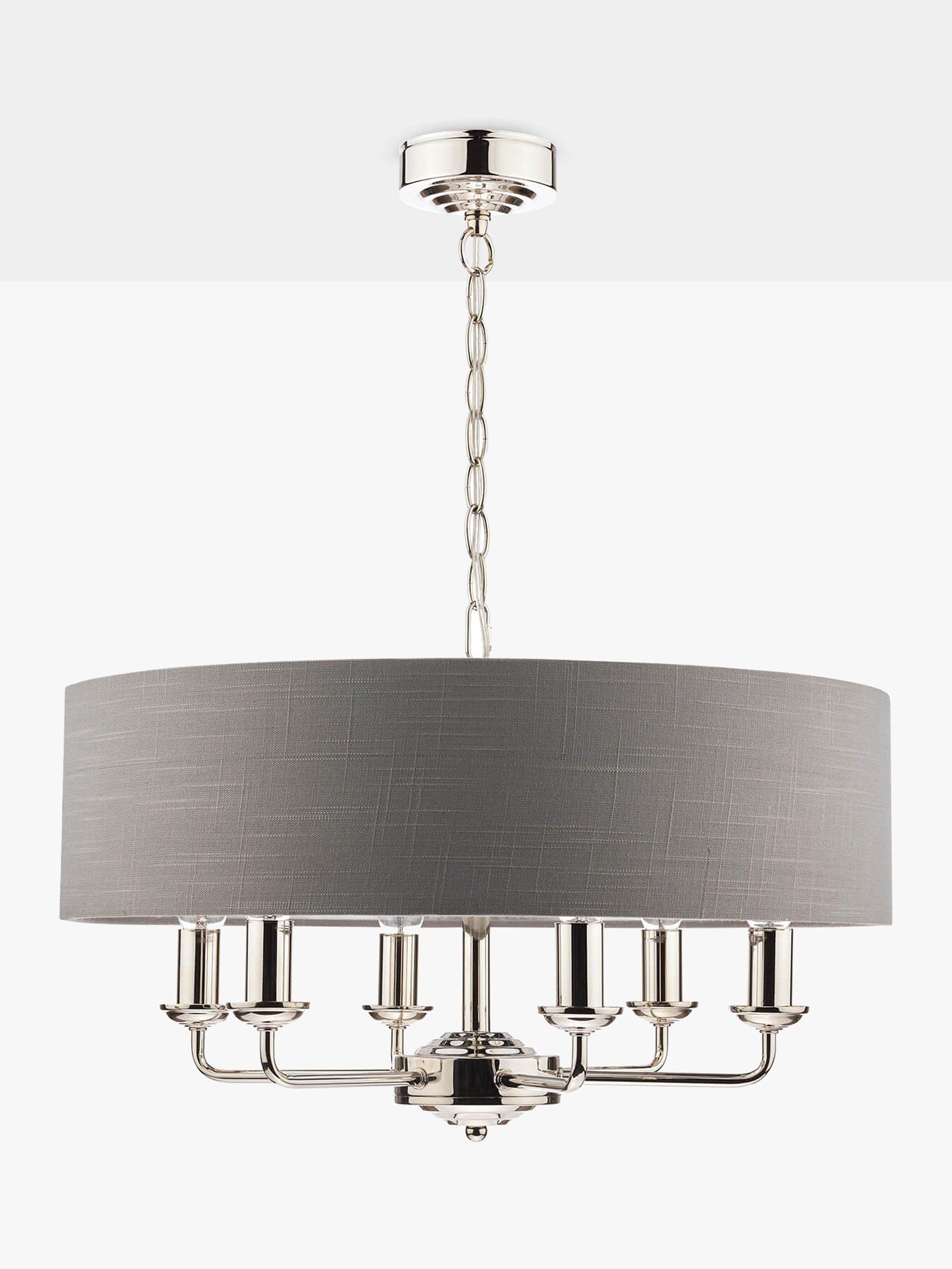 Generous in size, this timeless light fitting is ideal in living spaces and dining rooms, and it's suspended from a height-adjustable chain. Made from metal in a polished or satin finish, it's designed with a smart drum lampshade that encases six lights. The lampshade is made from slubbed linen and lined with a metallic inner to enhance a warm glow of light. Adding extra finesse, the ceiling rose has a stepped design that gives the fitting an Art-Deco inspired touch. Six LED bulbs are required.