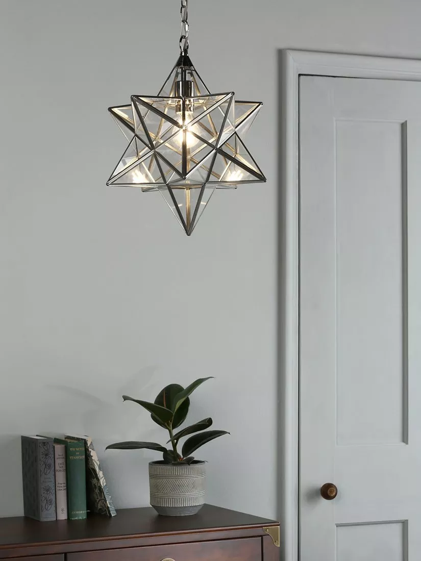 Instantly recognisable, this hand-finished ceiling light redefines the classic lantern pendant into a distinctive star shape. The panes of glass are joined together with metal in a polished finish and it glows when illuminated, filling your space with warm ambience. It's height-adjustable at the point of installation and one LED bulb is required.