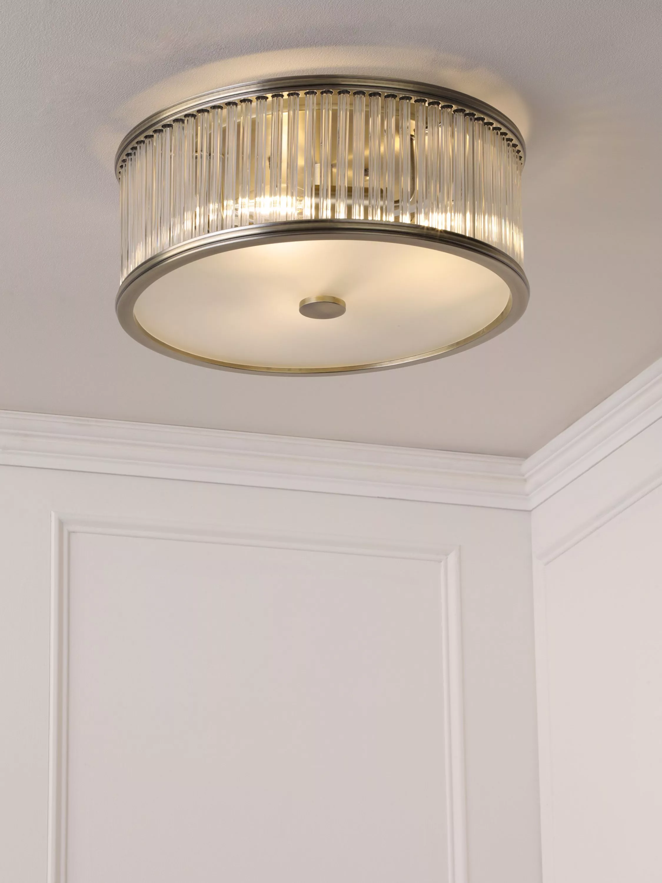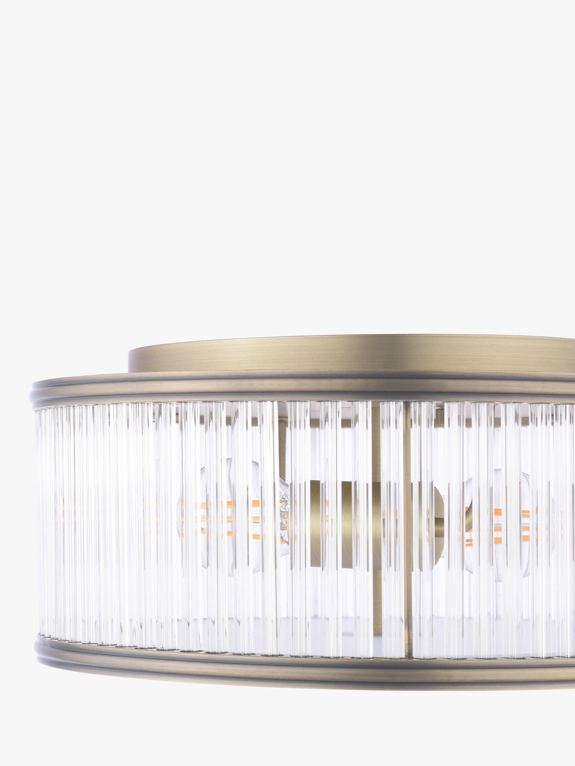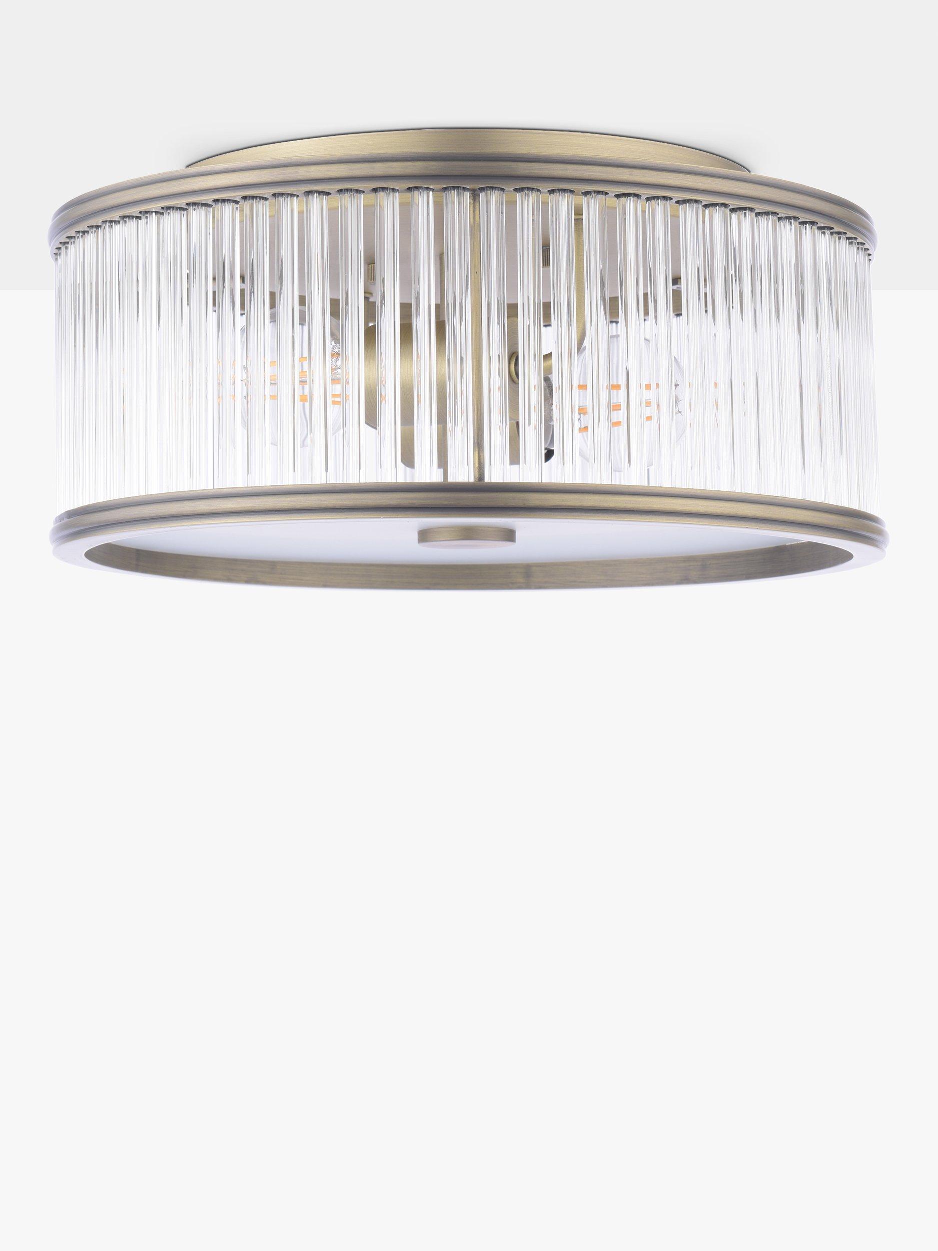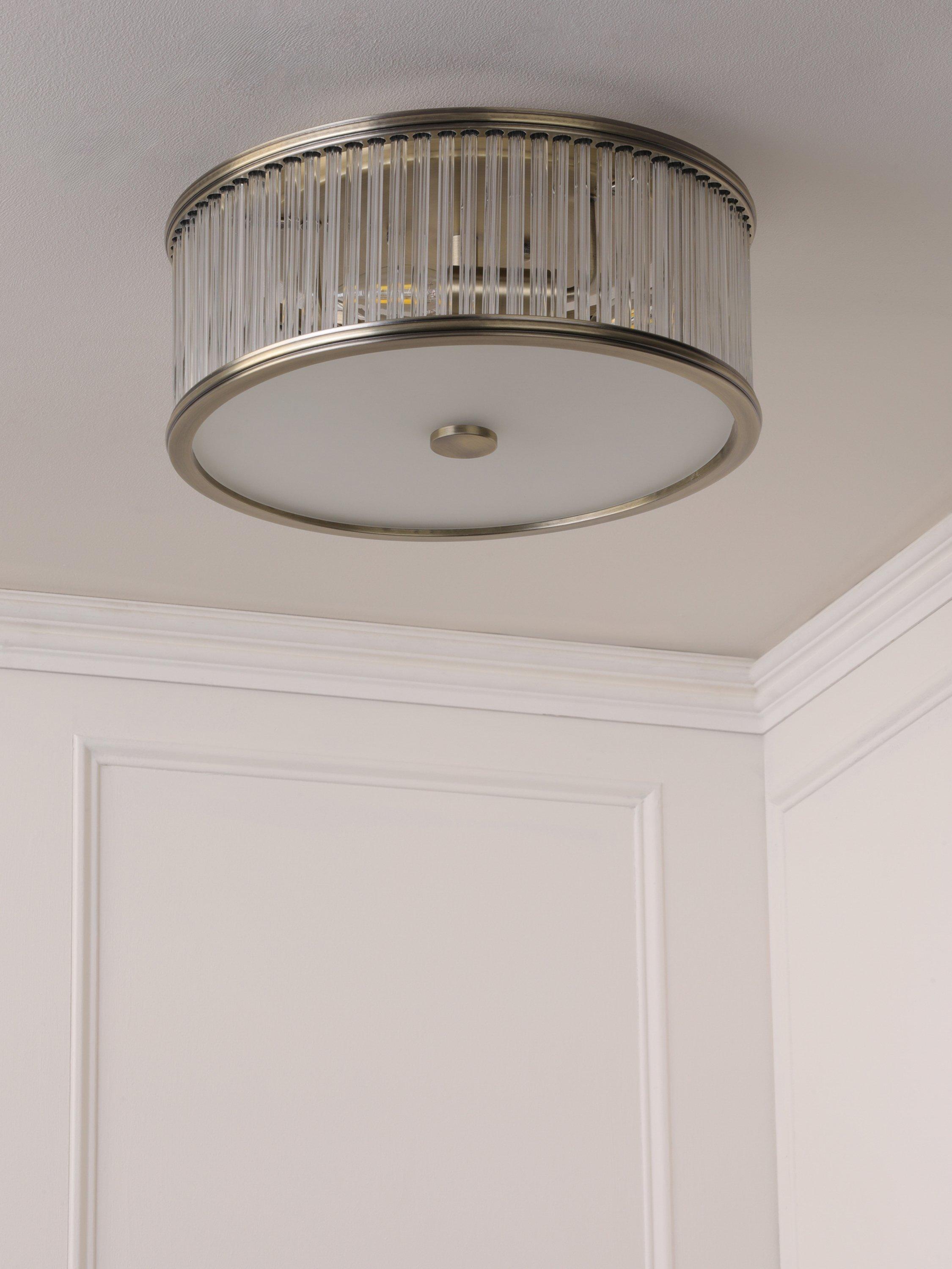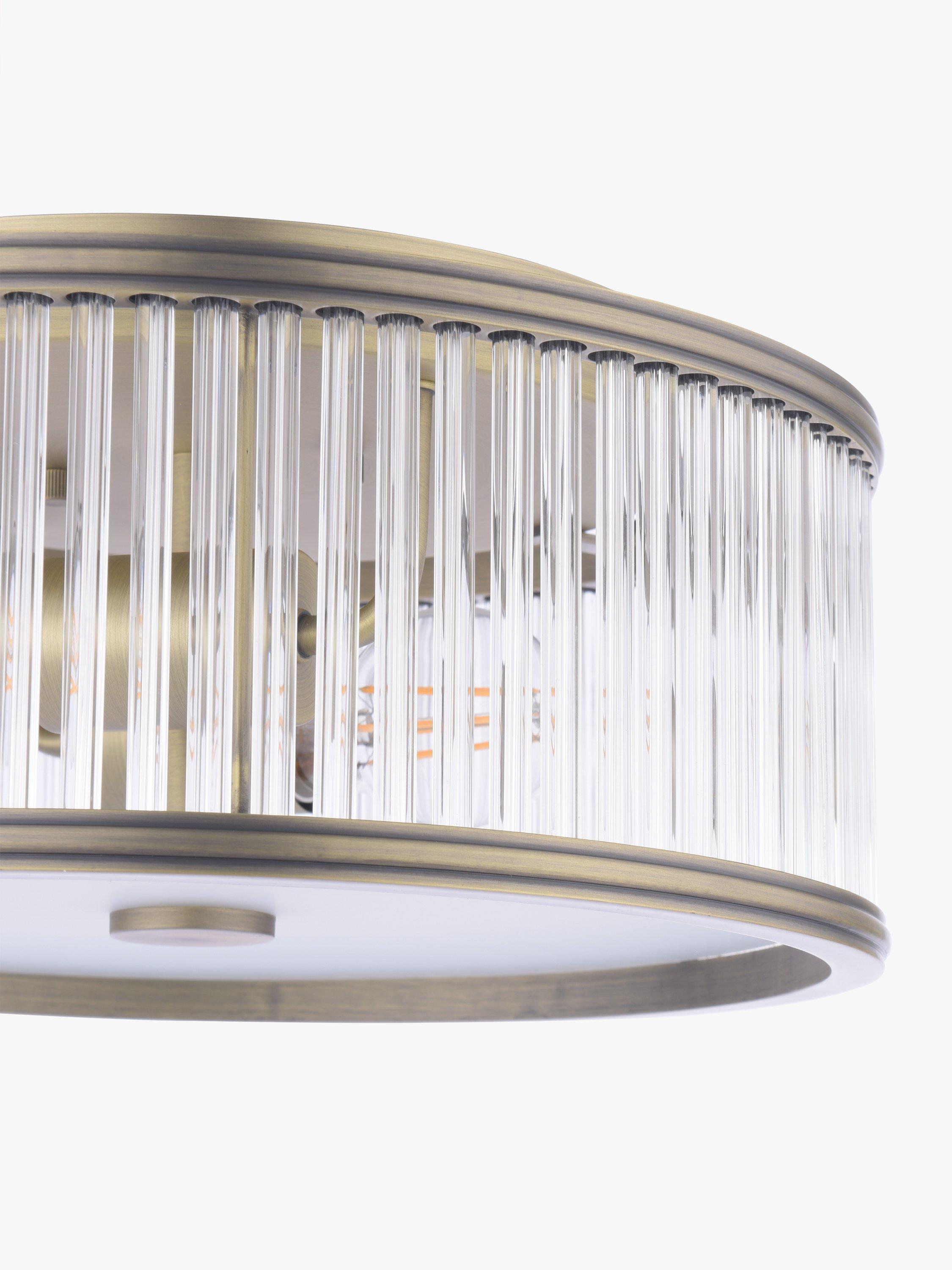 The Sutton double bulb, flush ceiling light by Laura Ashley features a fluted solid glass shade with antique brass metal accents. Its flush design makes it well-suited in spaces which have a low ceiling and smaller rooms, creating a warm and inviting space.