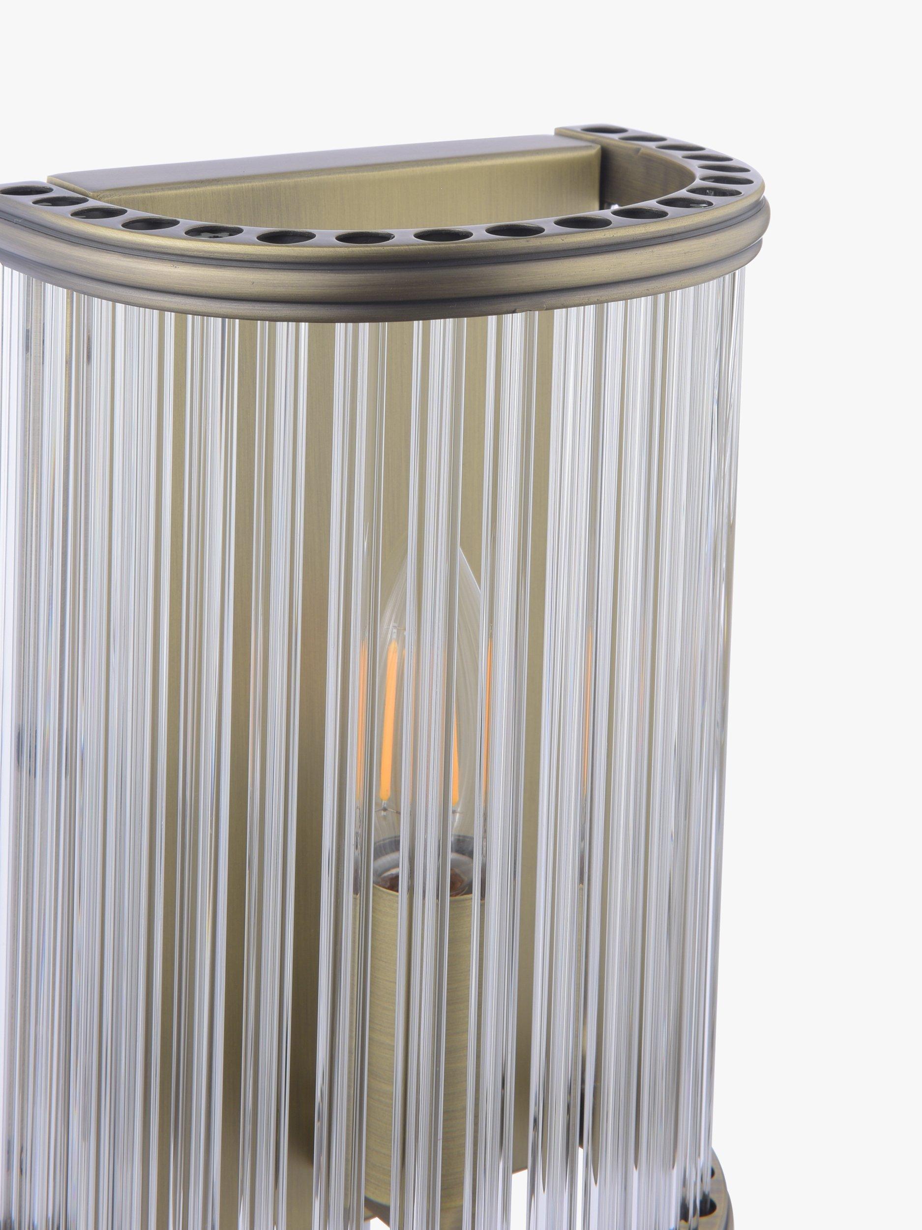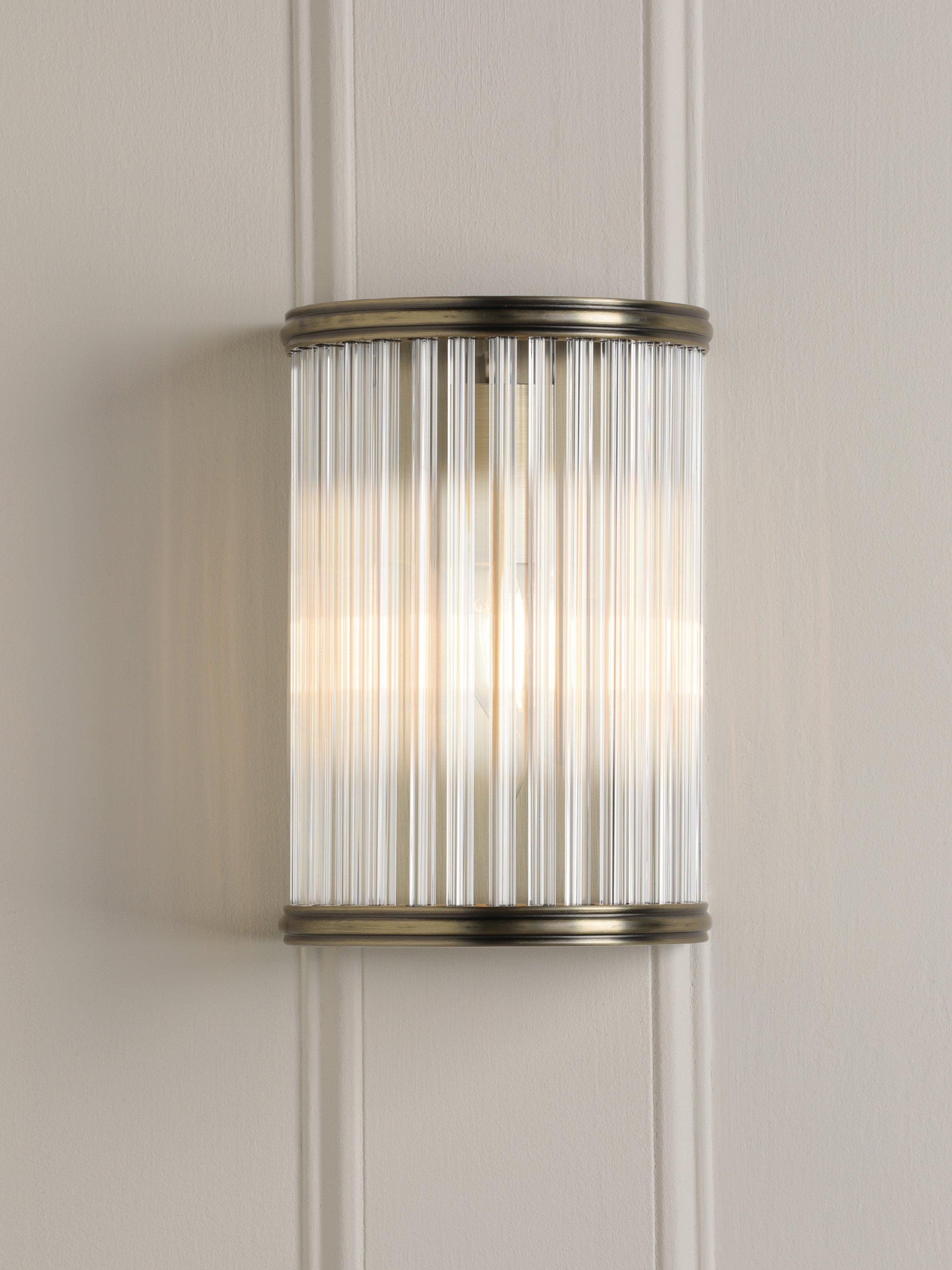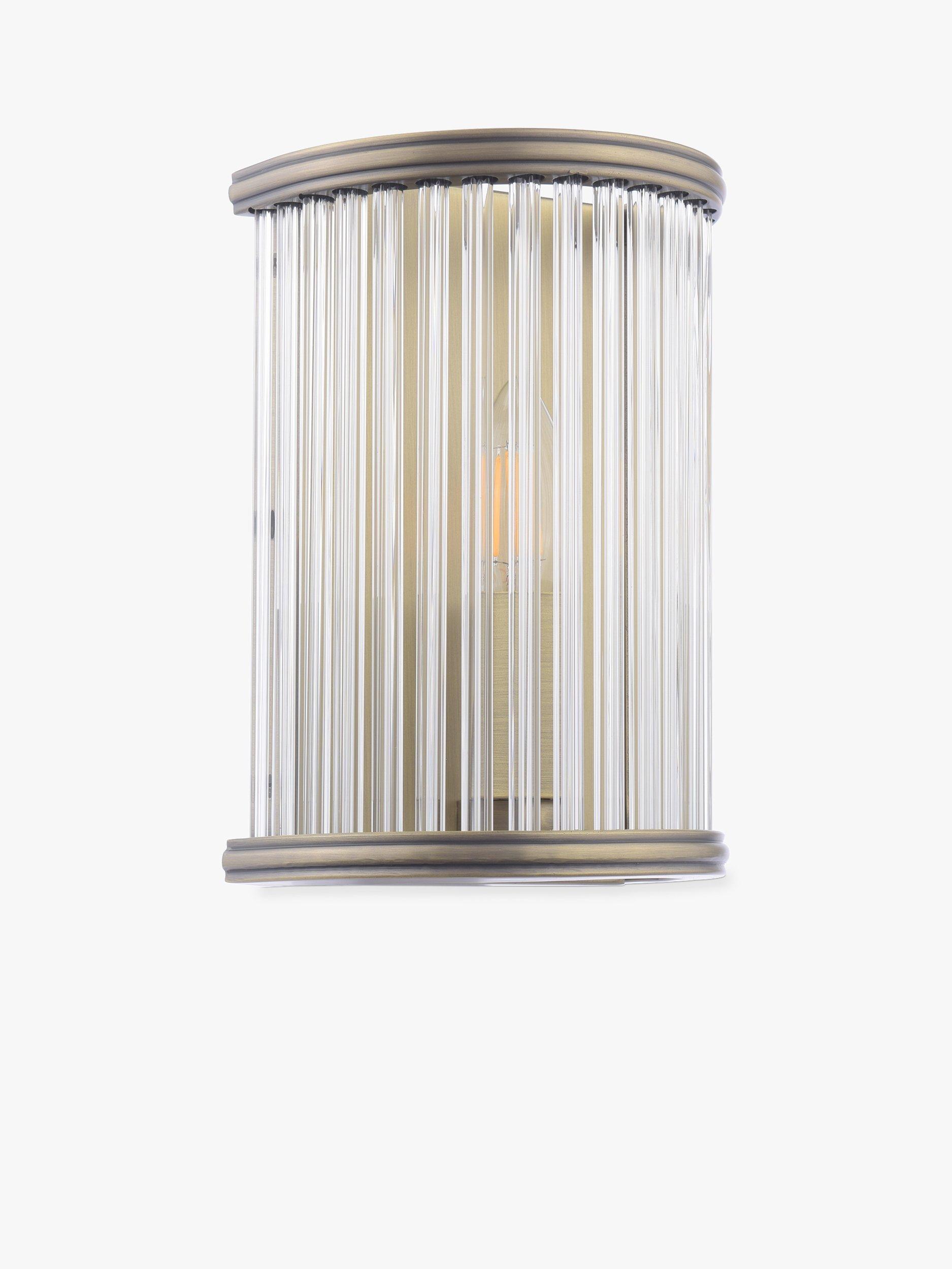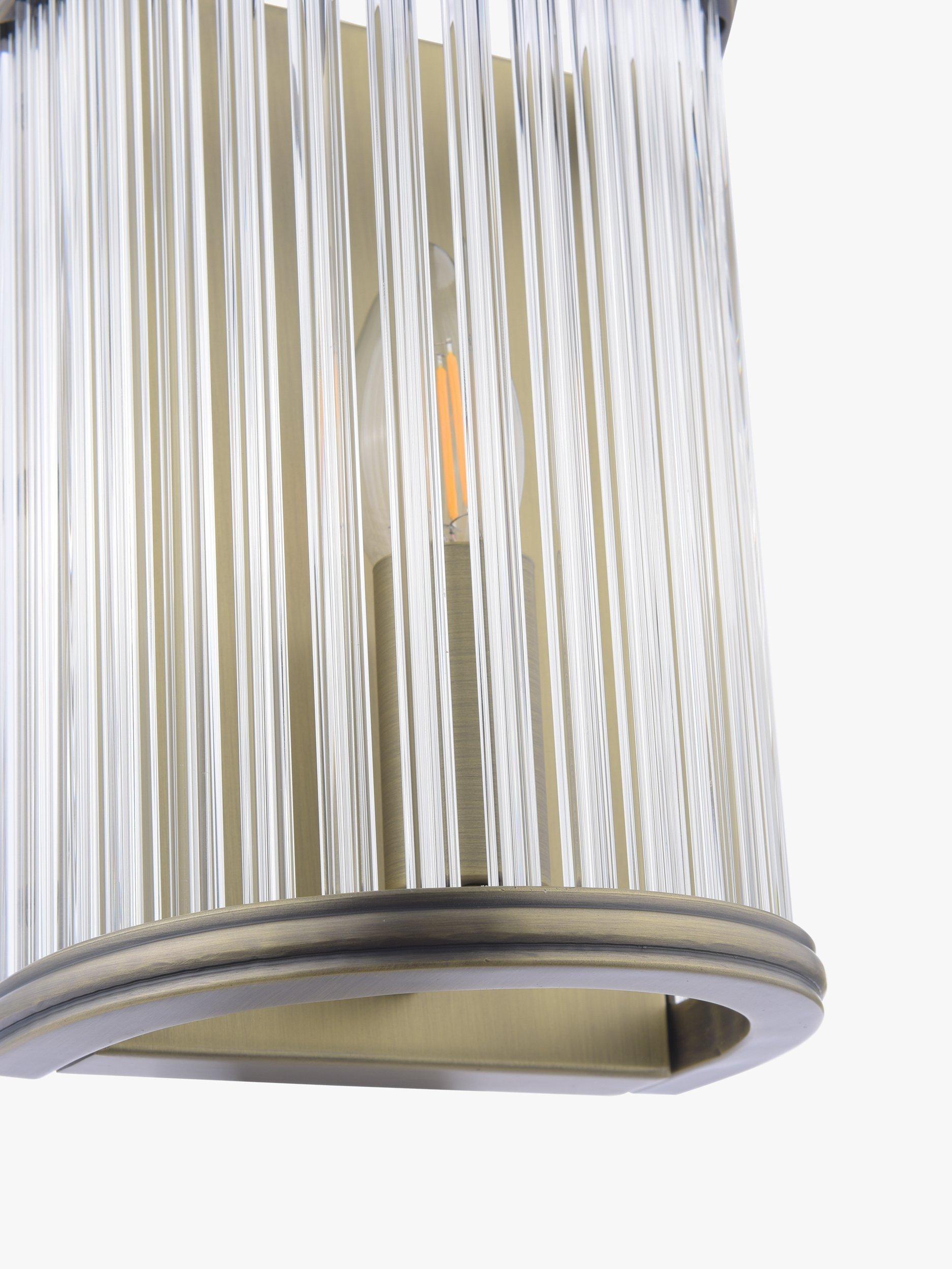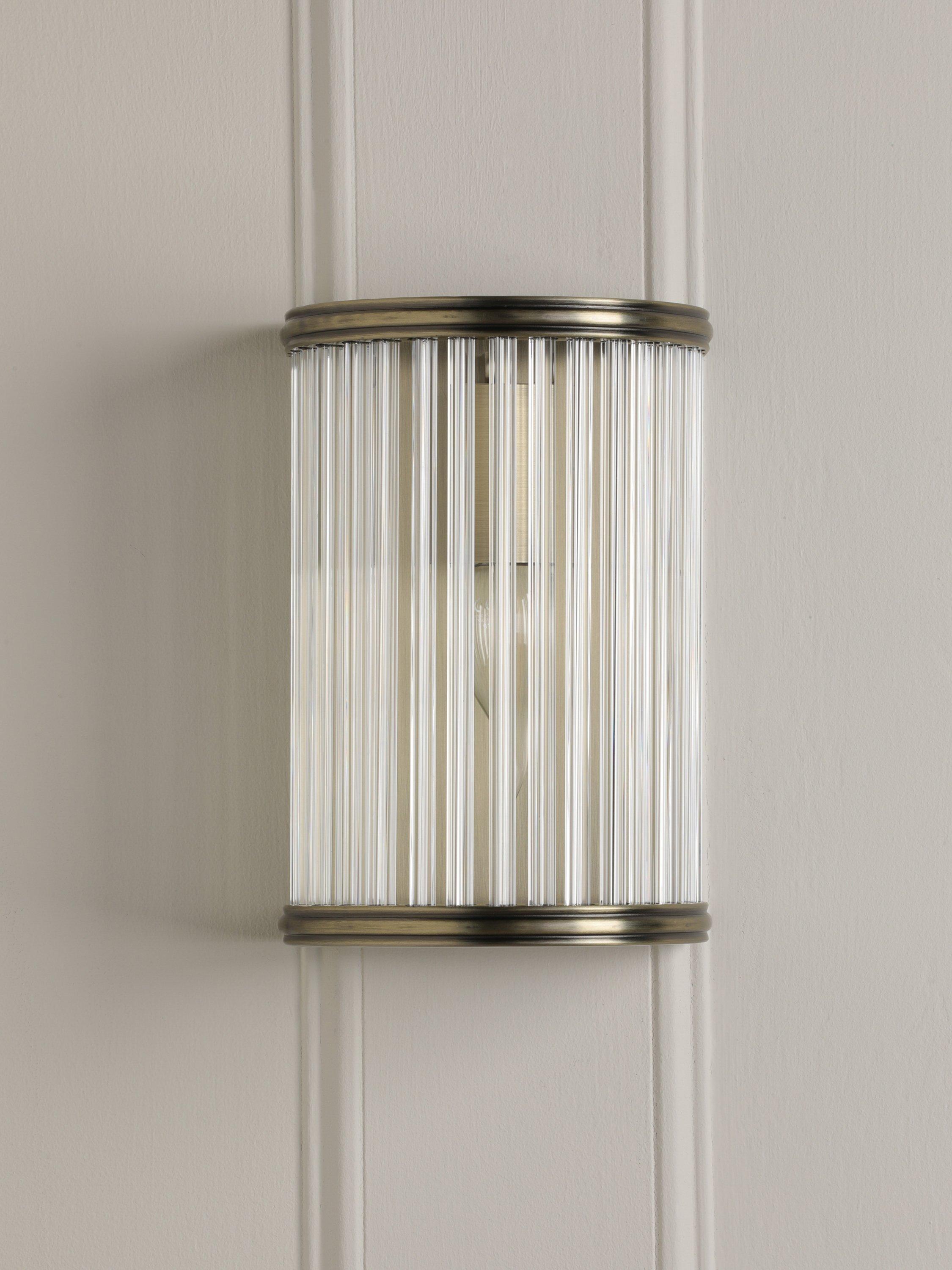 Elegant and timeless, the Sutton Wall Light in matte antique brass features faceted clear glass rods. A great addition to any hallway, living room or home office.