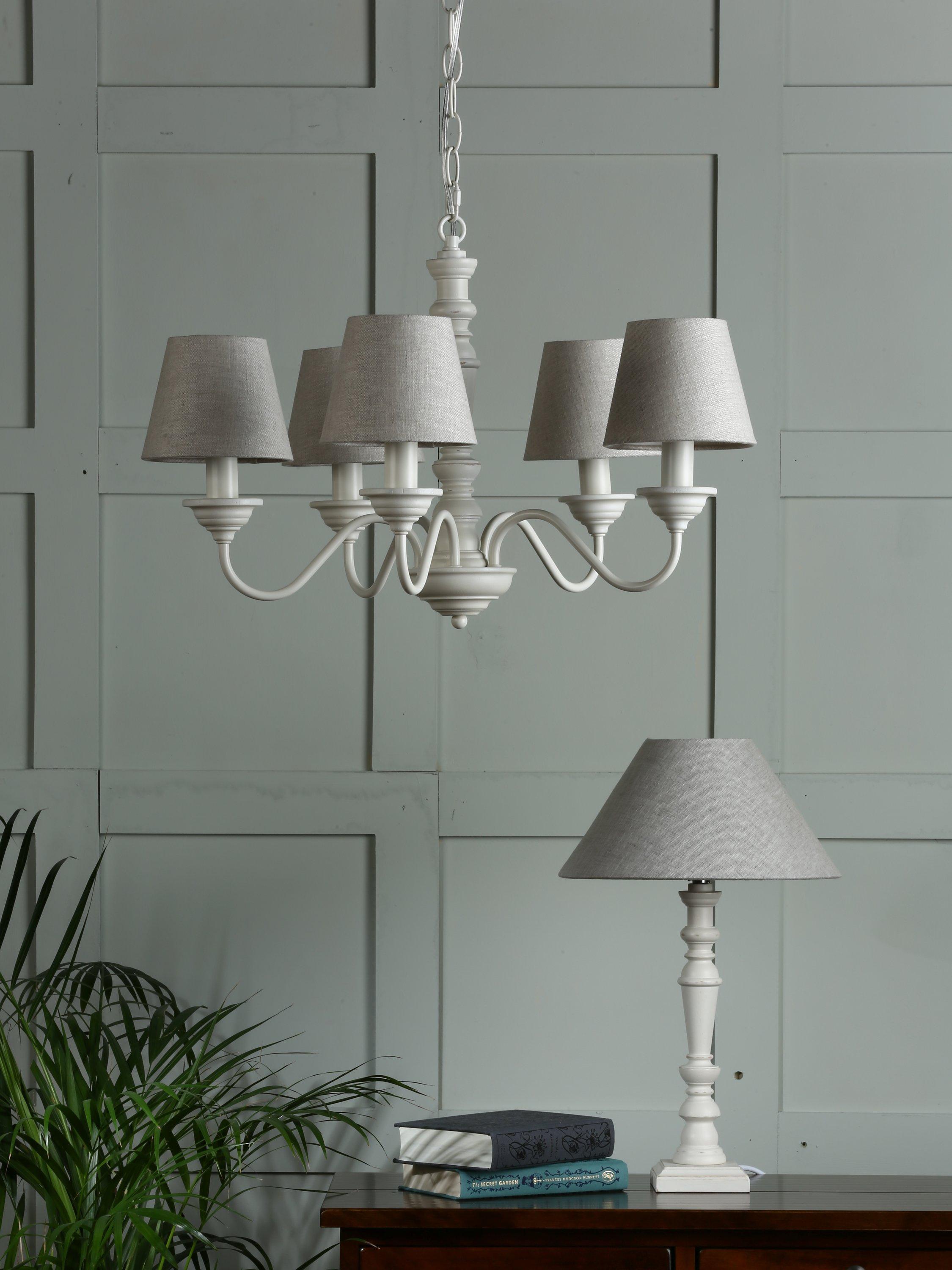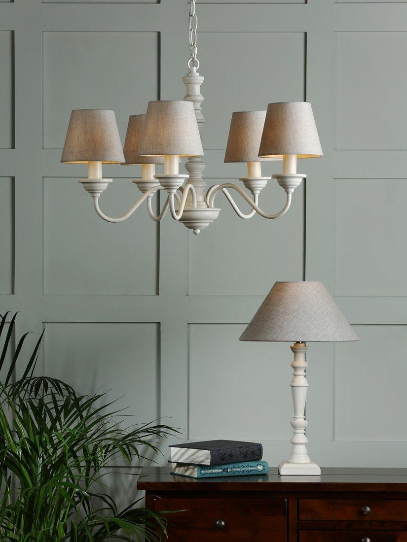 The elegantly proportioned Tate ceiling light from Laura Ashley is the epitome of country charm. The five lights are displayed on curved arms around a simple wooden spindle column. A beautiful distressed effect in white adds to the Tate’s appeal and helps capture the country narrative. Included are Laura Ashley linen, 14cm Bray shades in a natural colour. The drop height is adjustable at the point of installation. Bulbs not included.