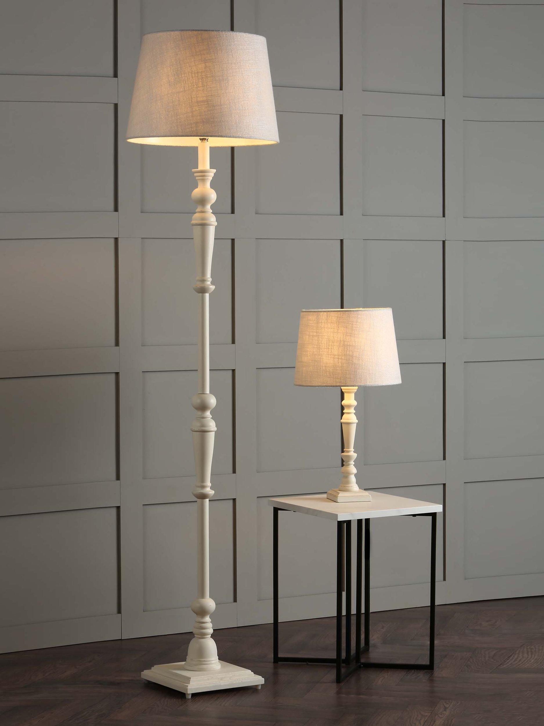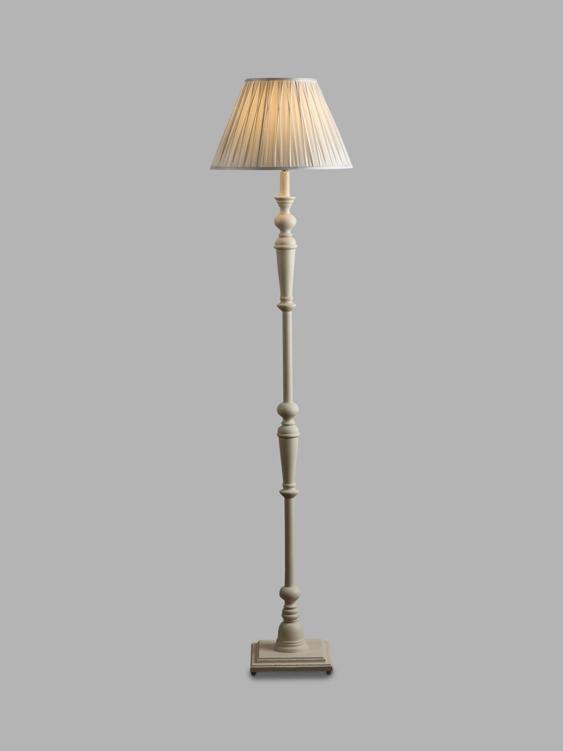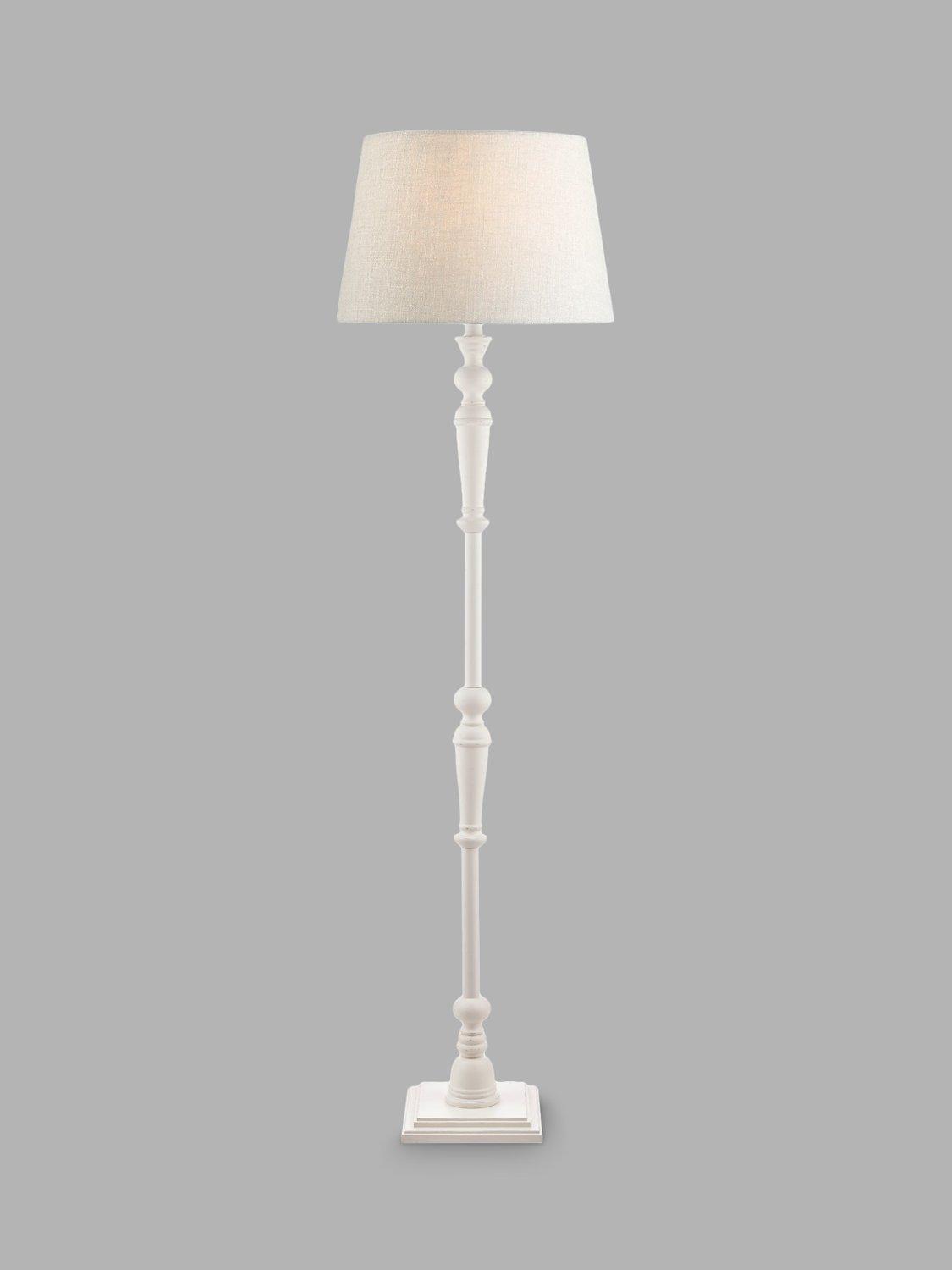 A traditional candlestick floor lamp base for a timeless update to your space. The turned wooden base is painted in a distressed matt finish and features a convenient push-bar switch. We recommend either a natural linen or silk lampshade that's Dia.40cm and above for a well-coordinated finish.