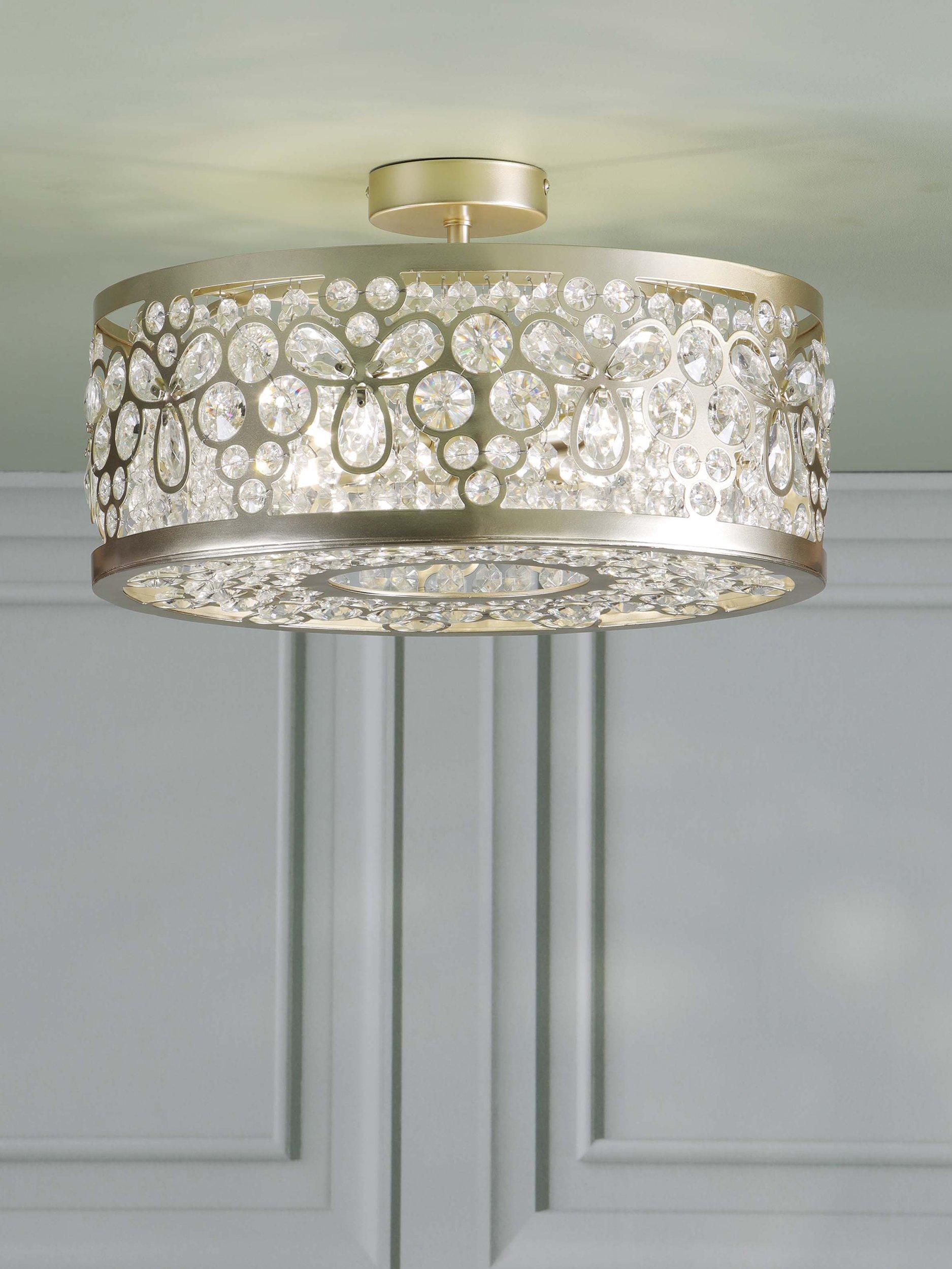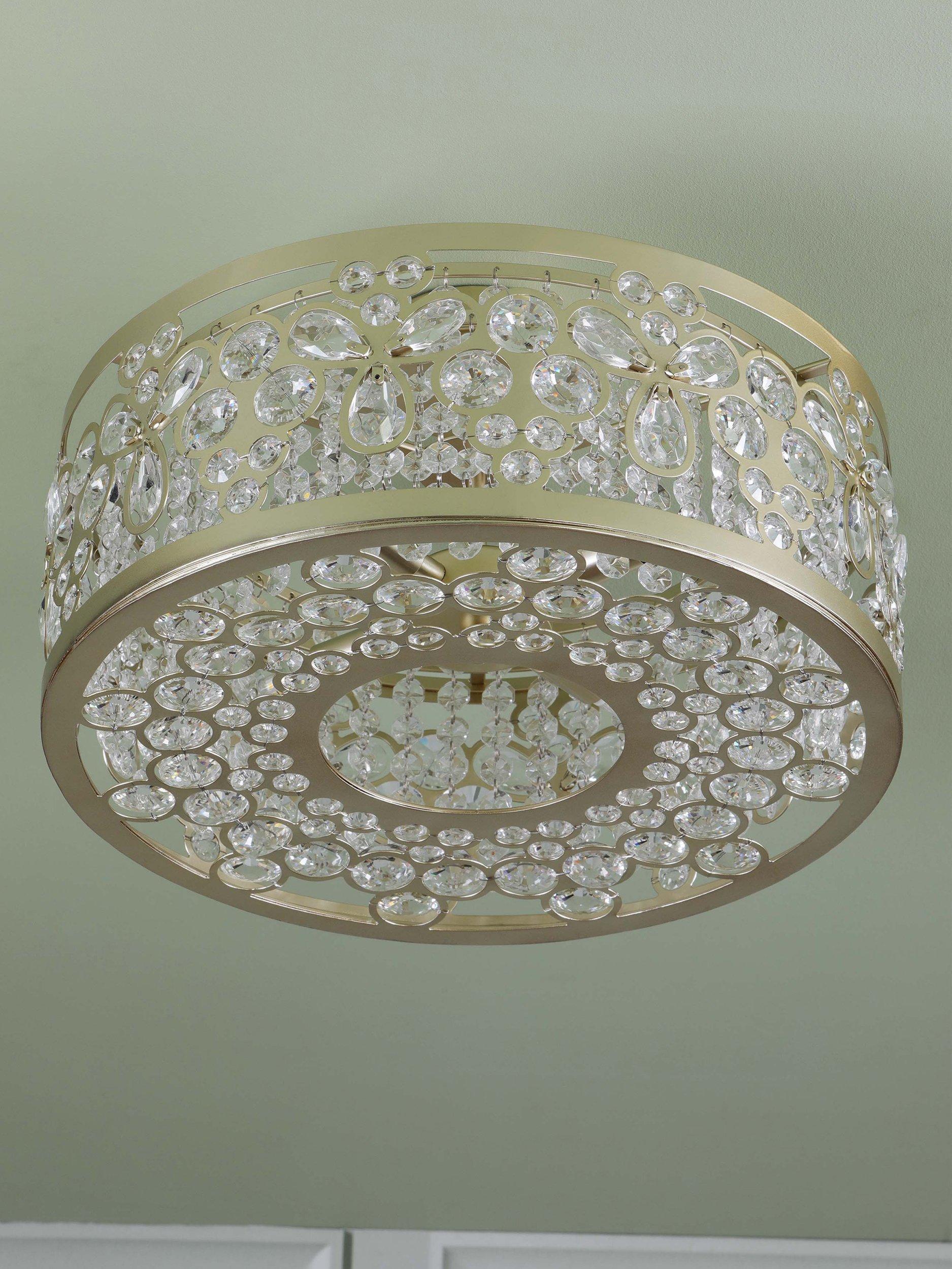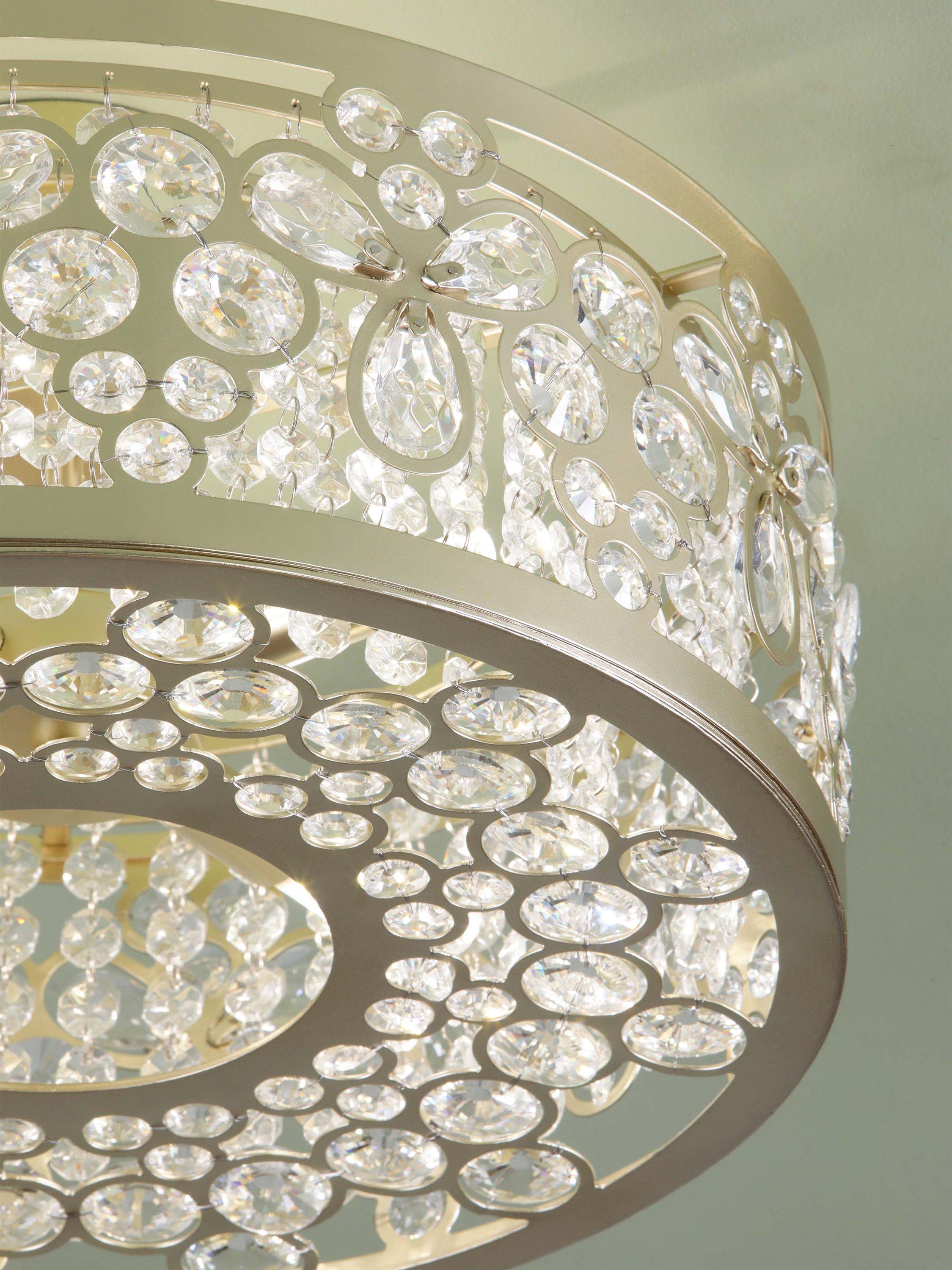 Illuminate your home with timeless style and elegance with the Laura Ashley Tilbrook flush ceiling light. Designed for rooms with low ceilings, this flush ceiling light fixture brings sophistication to any space. Its champagne finish lends a warm, luxurious glow, while clear crystal accents catch the eye with sparkle.