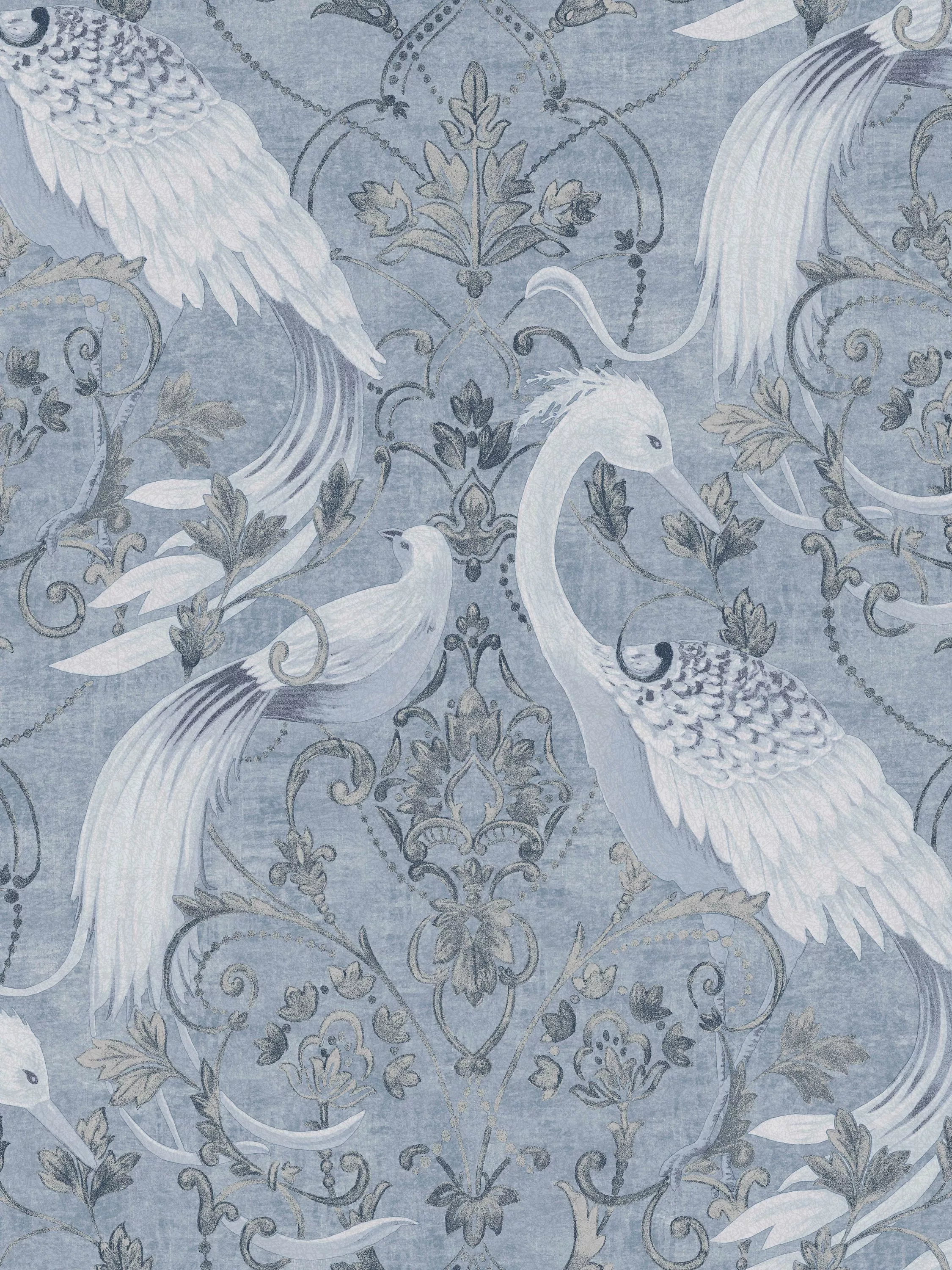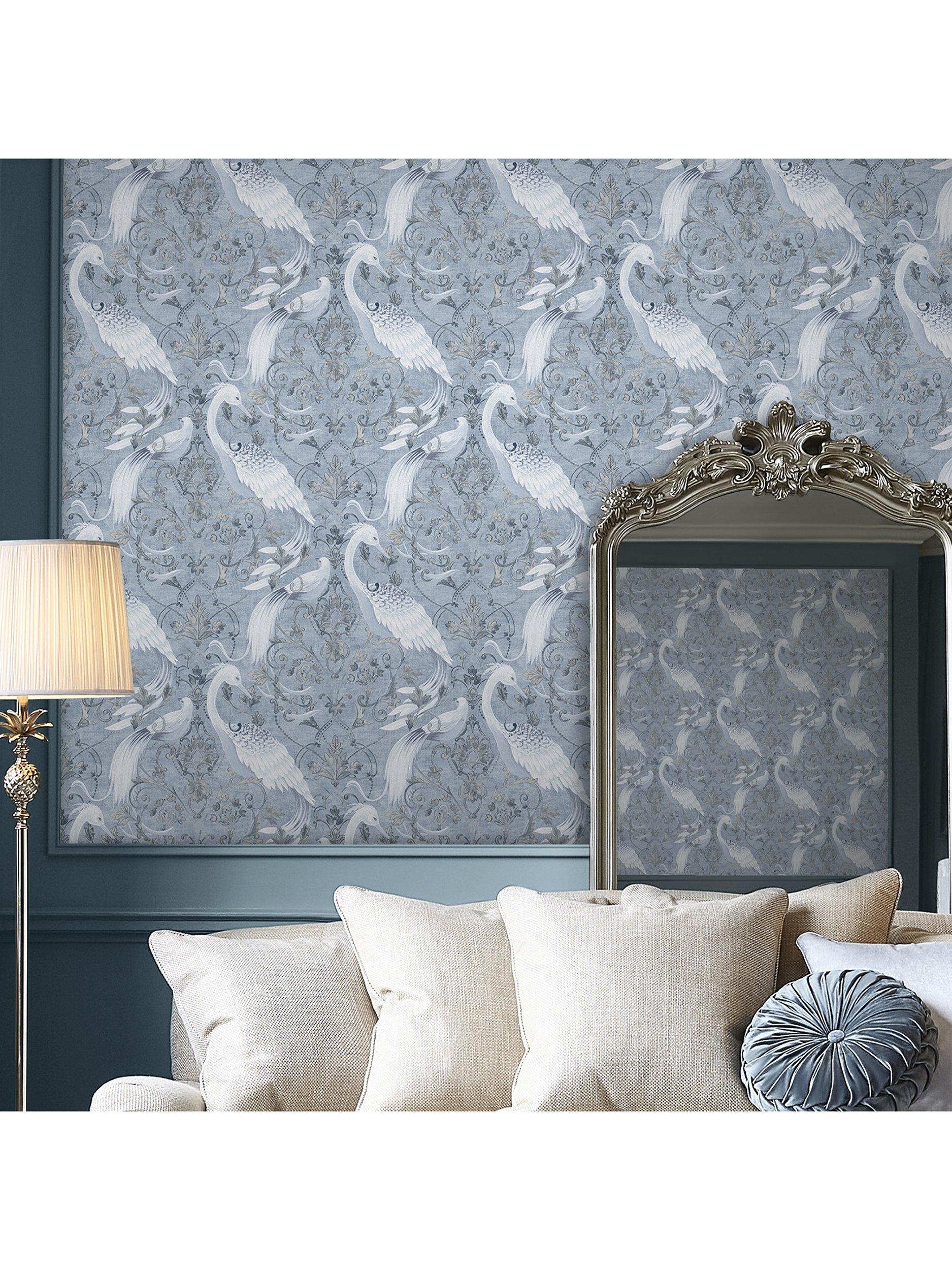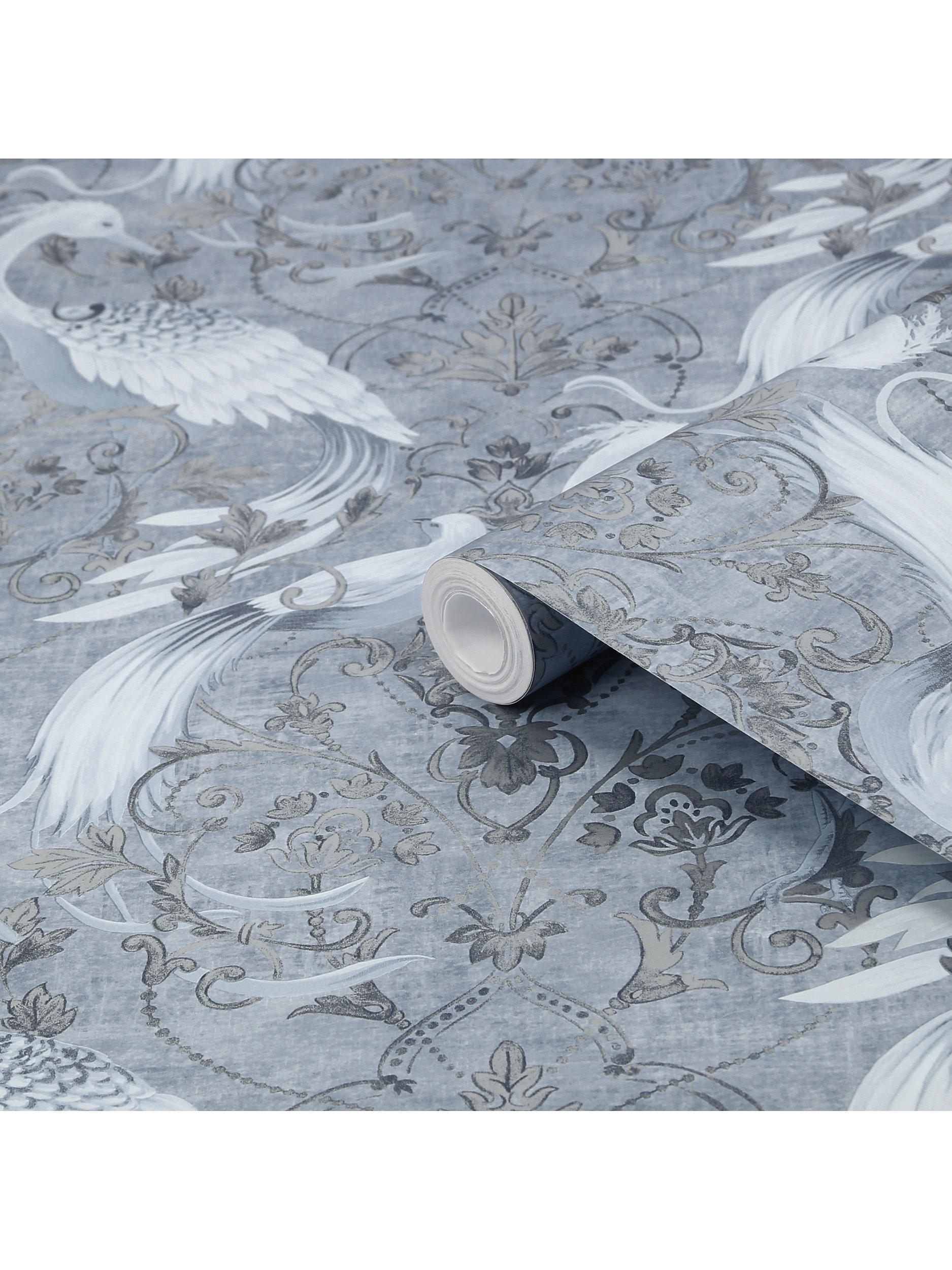 This romantic damask print was inspired by French classical tonal designs. Tregaron features beaded swags, scrolling stylised leaves and flowers, surrounded by cranes forming undulating curve shapes with fanned feathery tails.