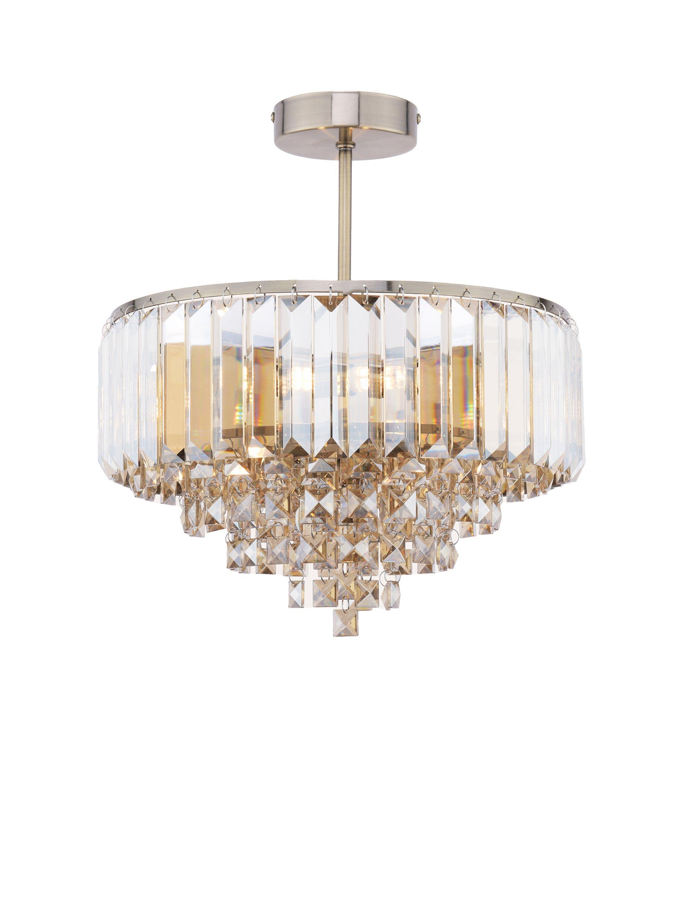 The glamorous Vienna ceiling light showcases bevelled crystal glass, suspended from a circular frame, falling to a central point. A semi flush fitting makes the light suitable for low ceilings and smaller rooms.