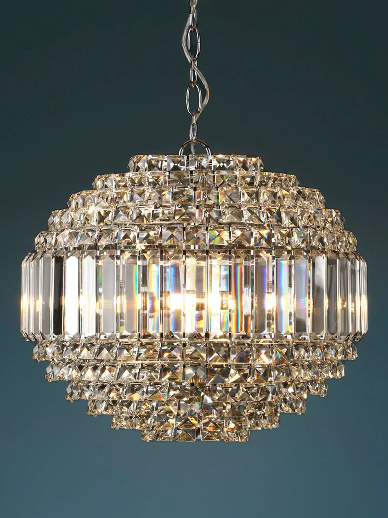 Adding instant glamour to your space, this ceiling light is made from bevelled glass crystal rods and square-cut glass droplets which glisten when illuminated. Its grand size and globe shape makes it a focal point in your space, and it's height-adjustable at the point of installation. It offers a warm and diffused wash of light and polished chrome metal offers the perfect complement. Five LED bulbs are required.