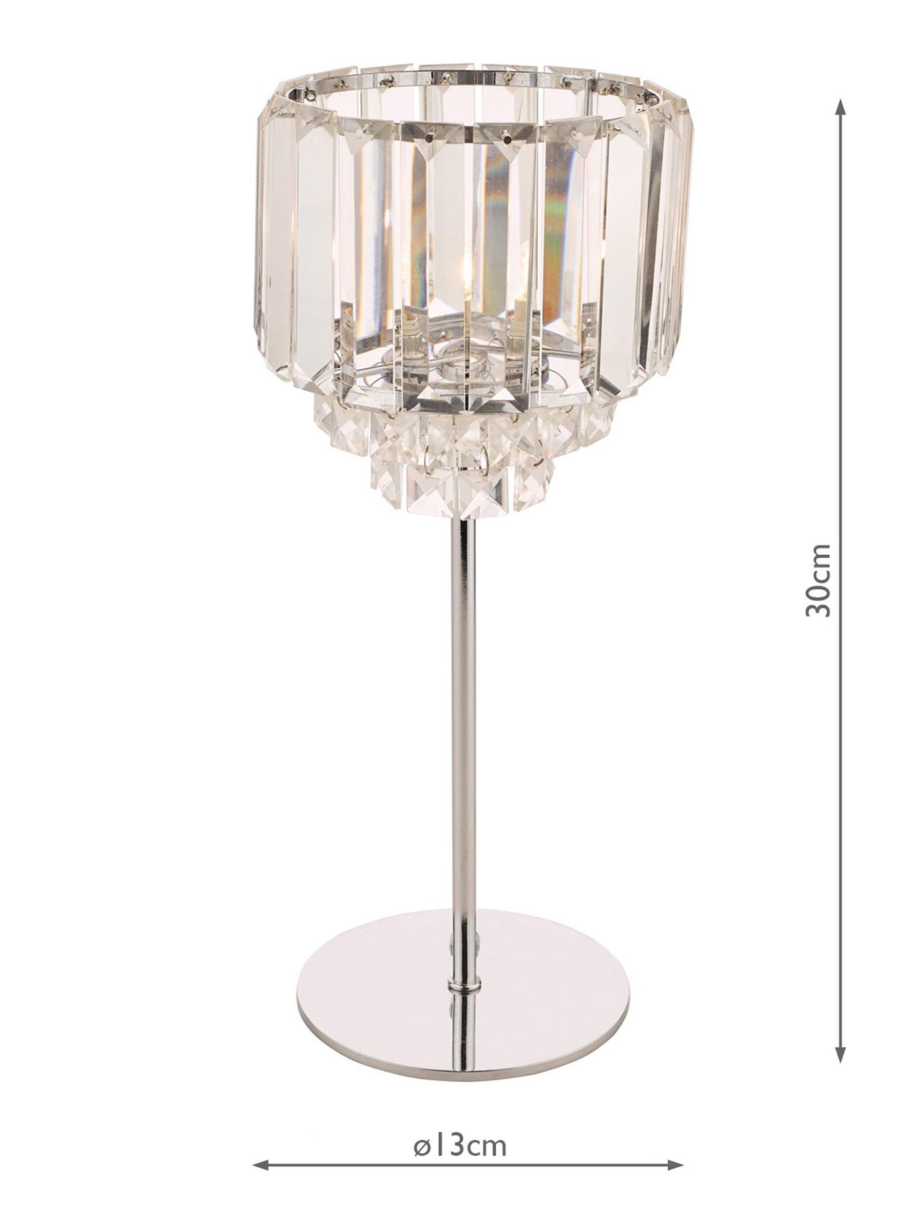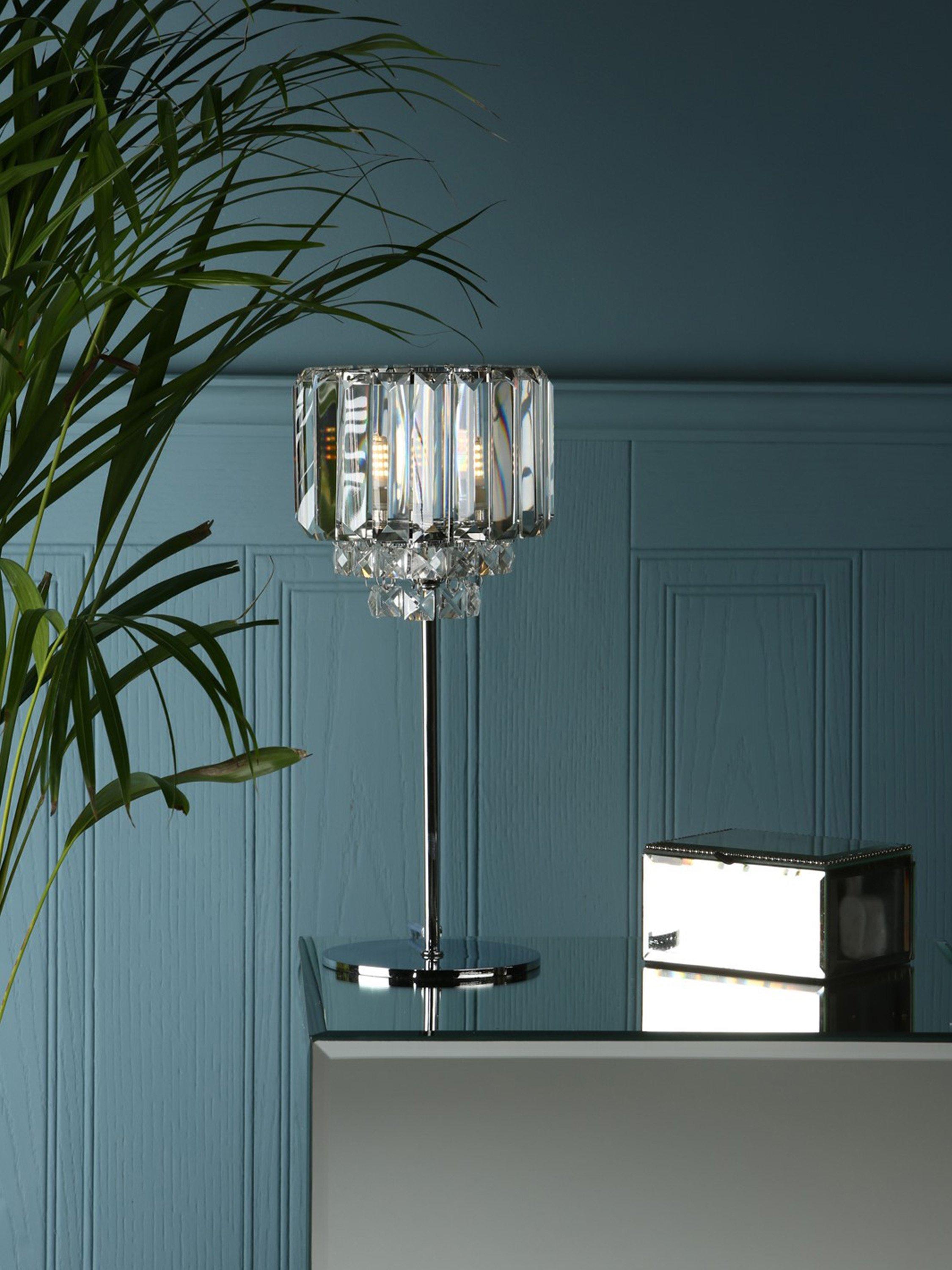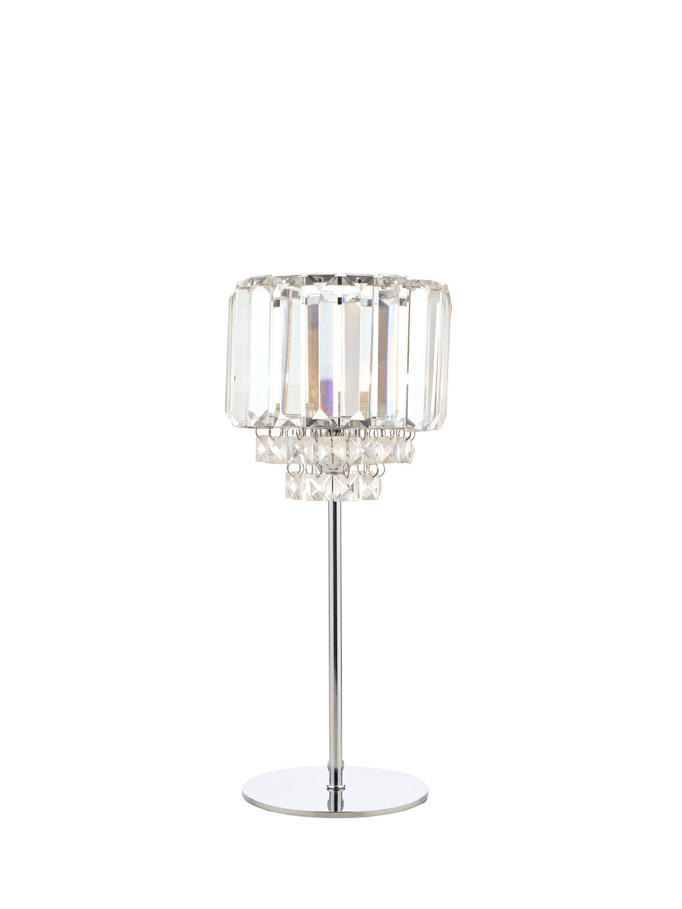 The combination of crystal glass and polished chrome metal makes this table lamp an attractive and eye-catching feature for your space. The shade is made up of bevelled glass crystal rods and square-cut faceted glass droplets that fall to a central point from a circular frame. Requiring one LED bulb, it offers a warm and diffused glow of light, perfect for creating ambience.