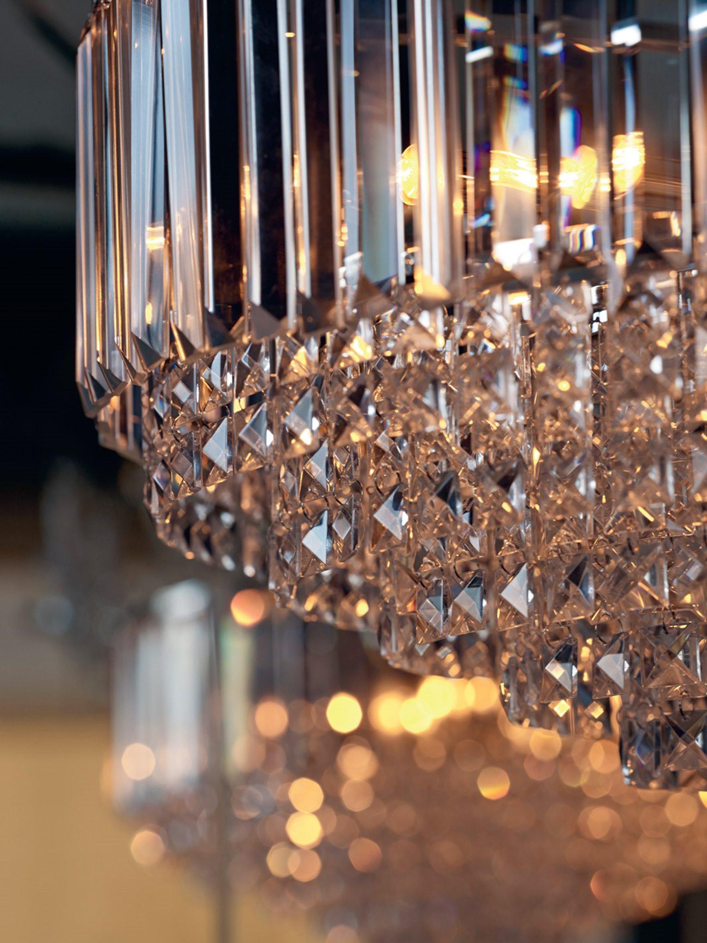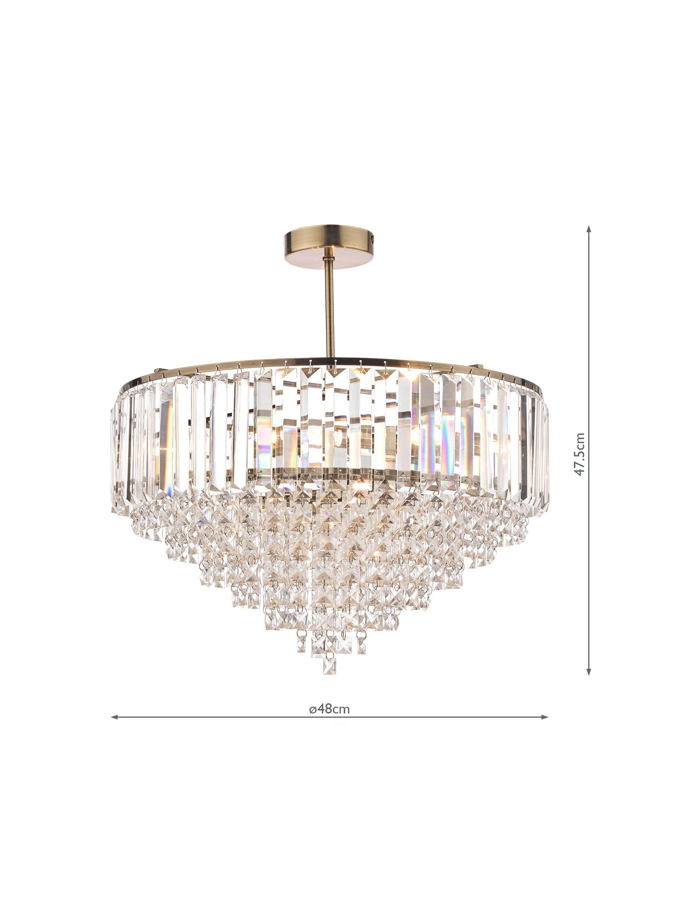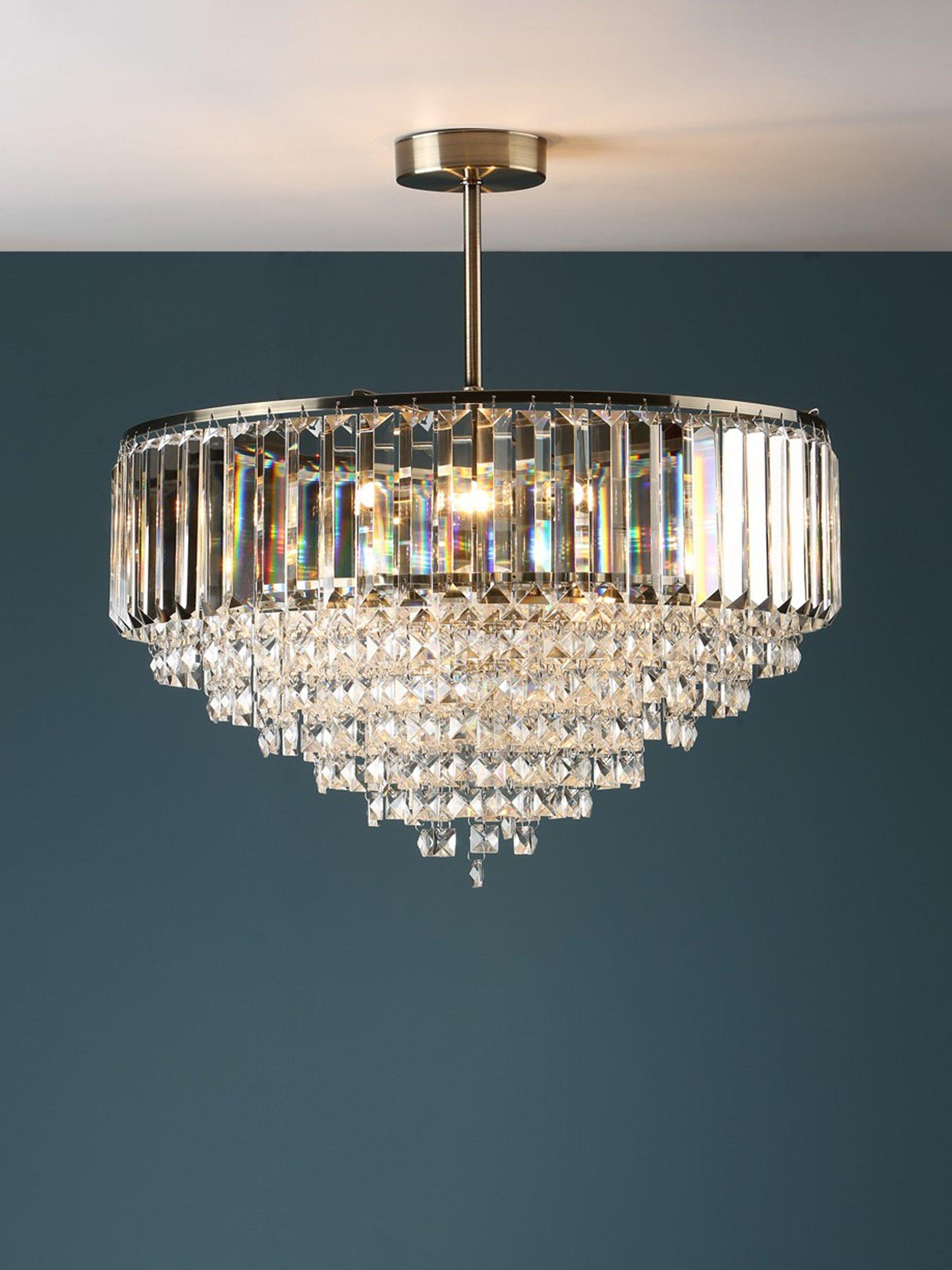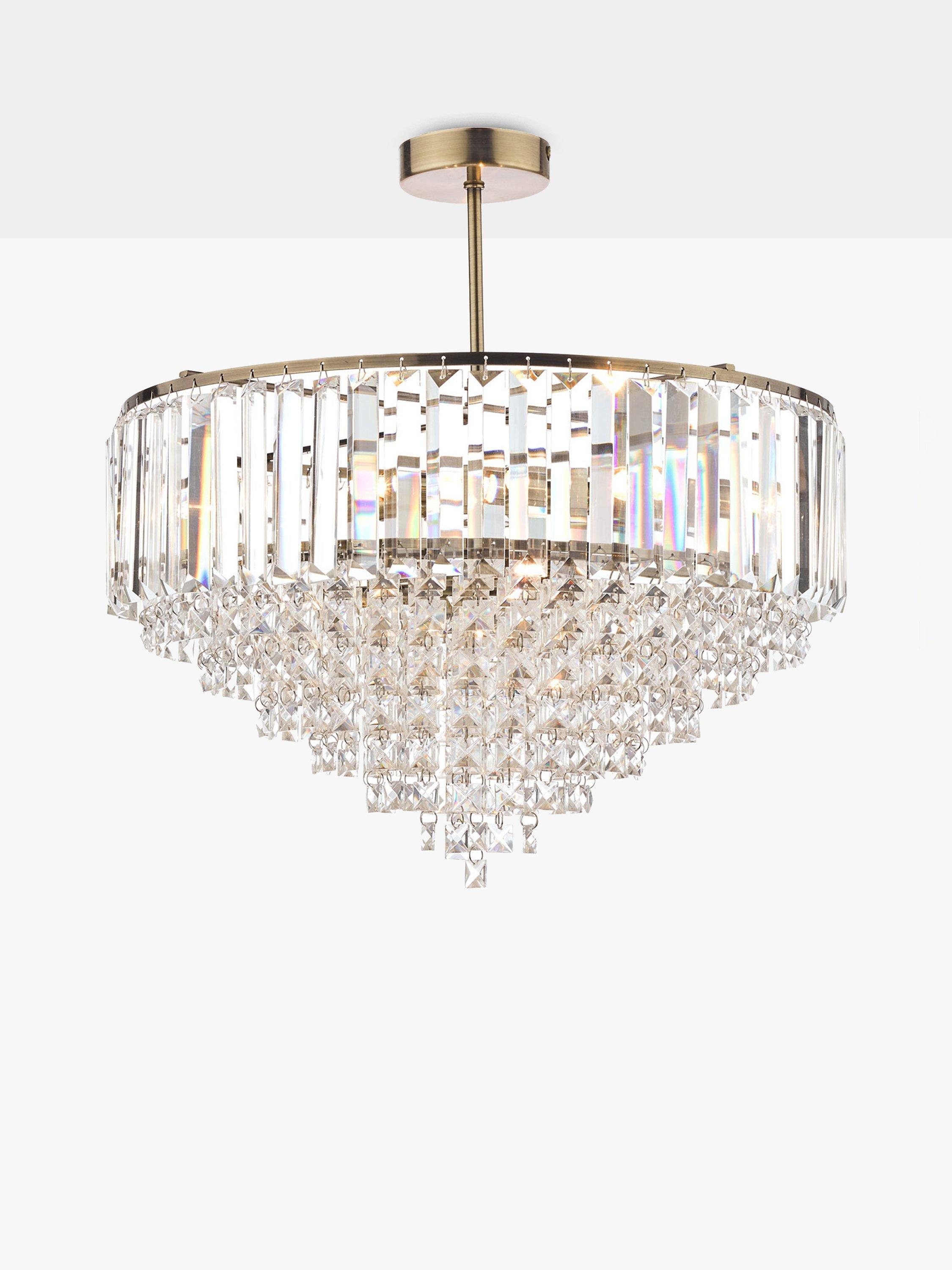 Made from a combination of bevelled crystal glass rods and square-cut faceted glass droplets, this ceiling light will become a focal point in your space. Available in an antique brass or modern chrome finish, it has a smart, circular frame and will spread light around your room. Semi-flush fittings are popular in smaller rooms or areas that have a low ceiling.