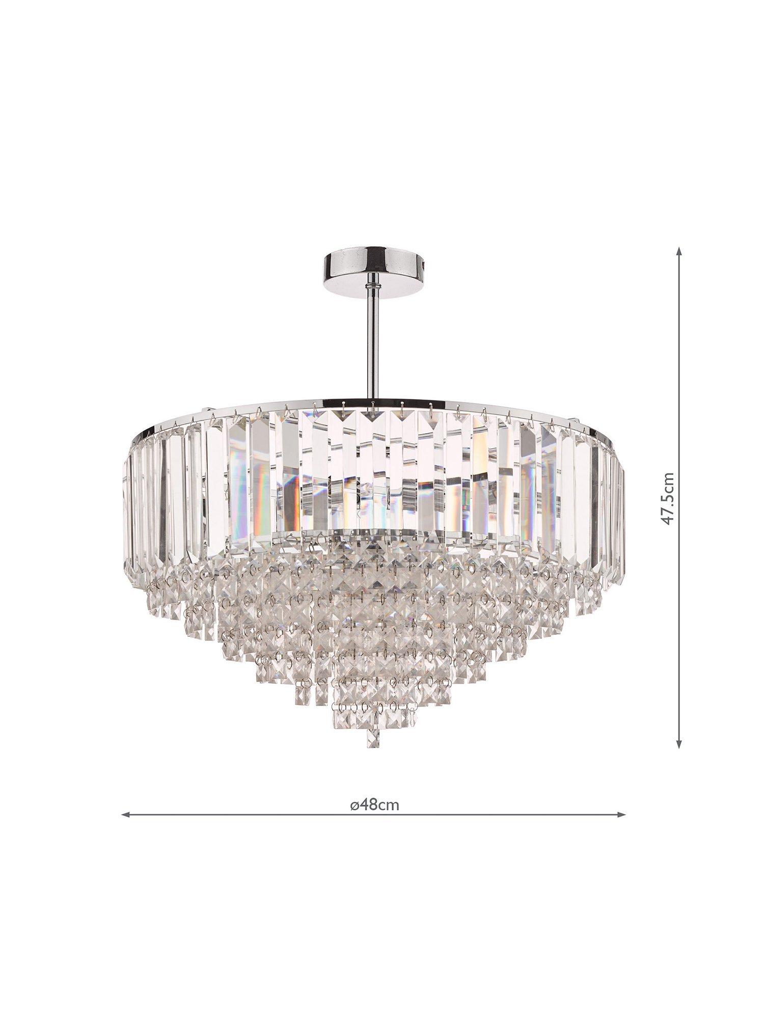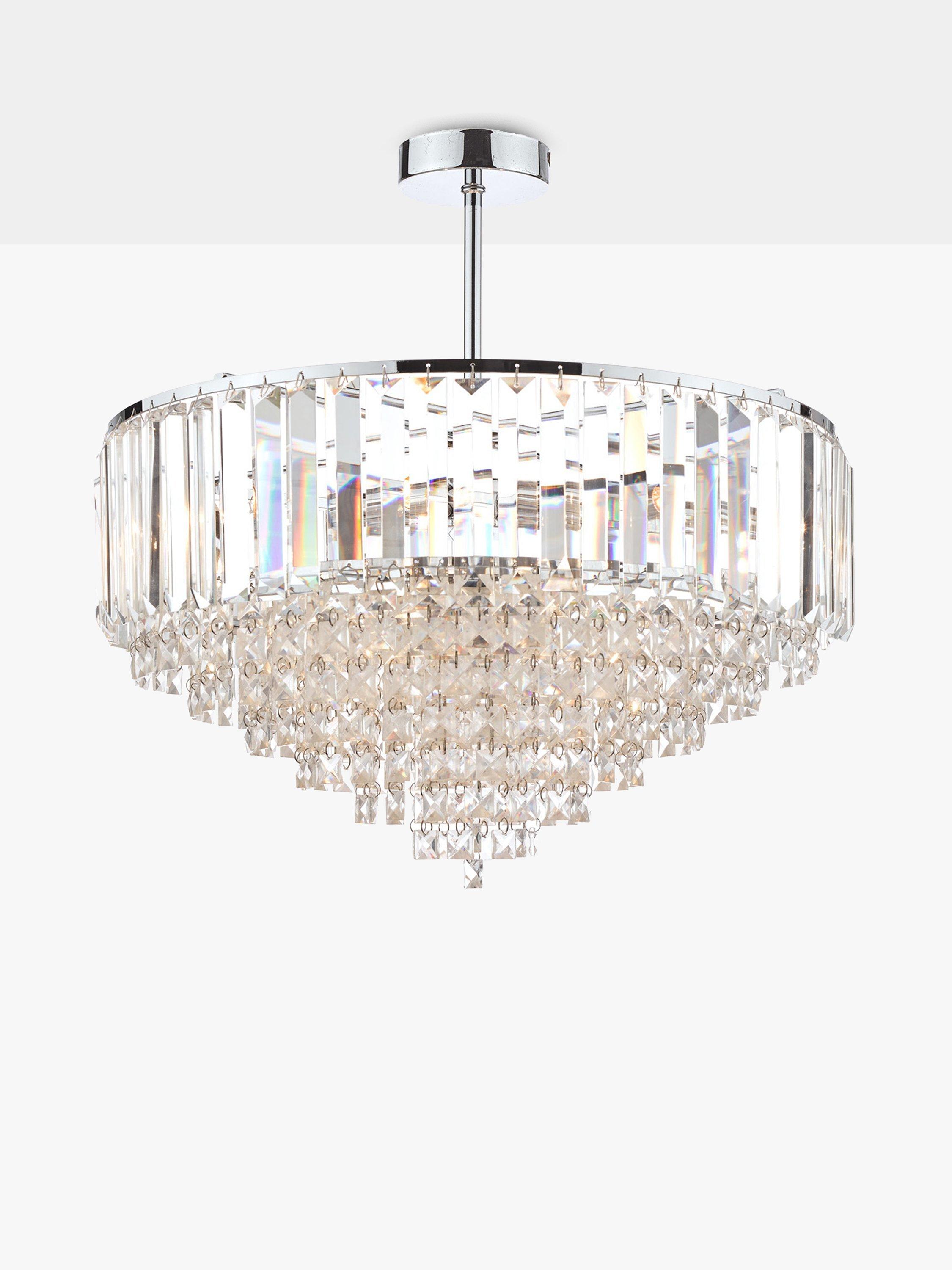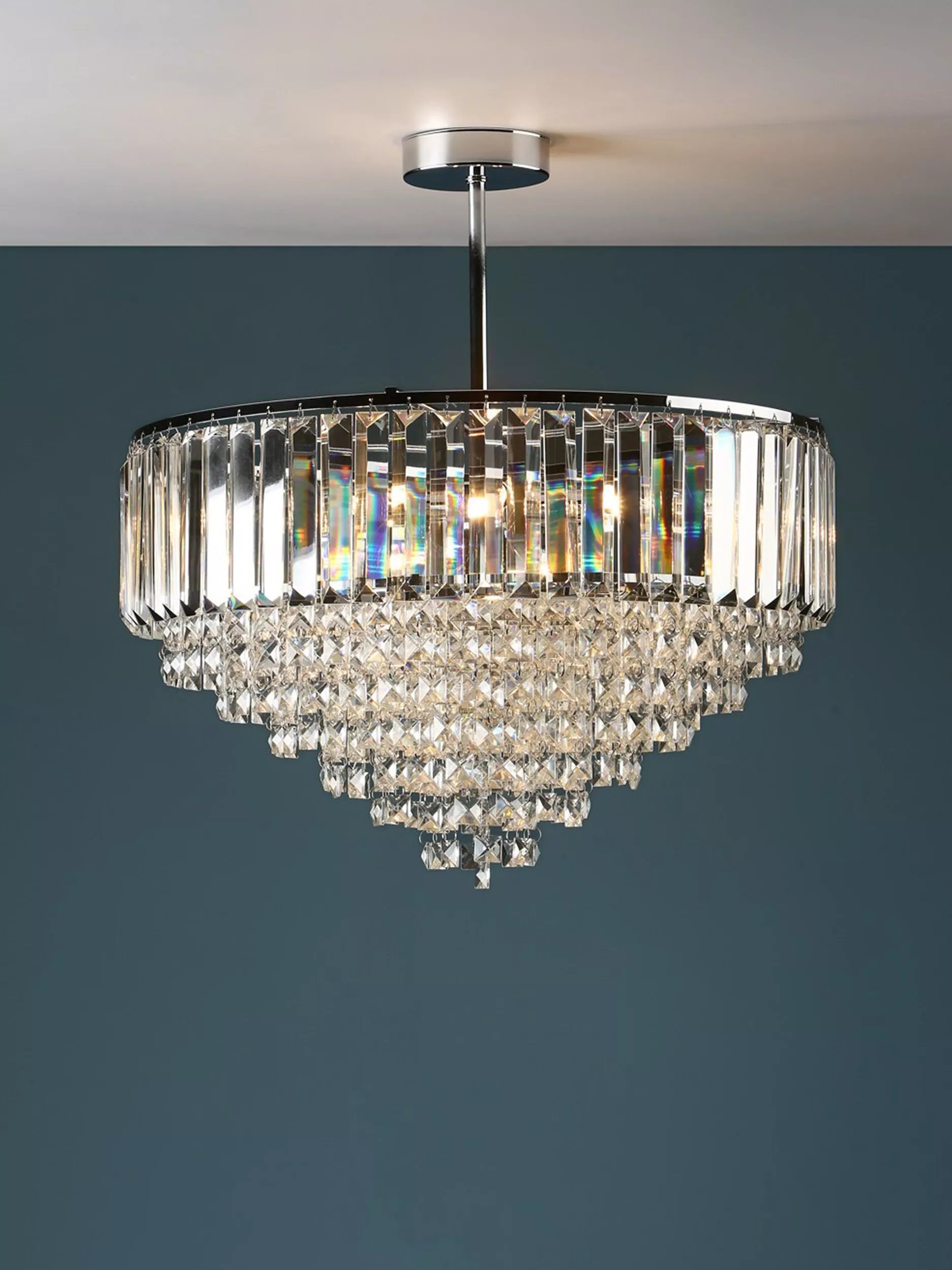 Made from a combination of bevelled crystal glass rods and square-cut faceted glass droplets, this ceiling light will become a focal point in your space. Available in an antique brass or modern chrome finish, it has a smart, circular frame and will spread light around your room. Semi-flush fittings are popular in smaller rooms or areas that have a low ceiling.