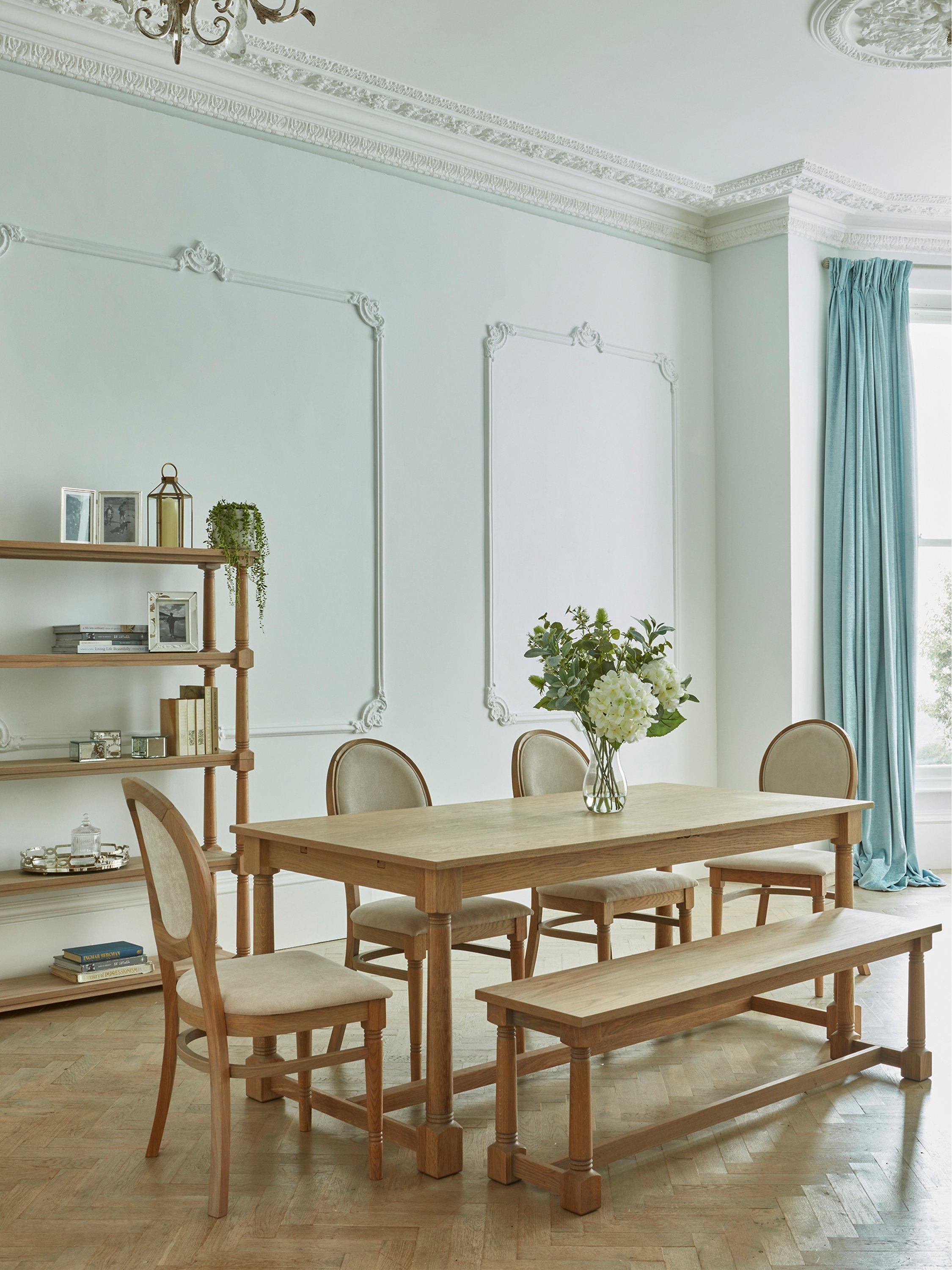 Comfortably seating three people, the Laura Ashley Wellington dining bench pairs perfectly with the Wellington dining table and features the same signature stately carved effect pillar column legs.