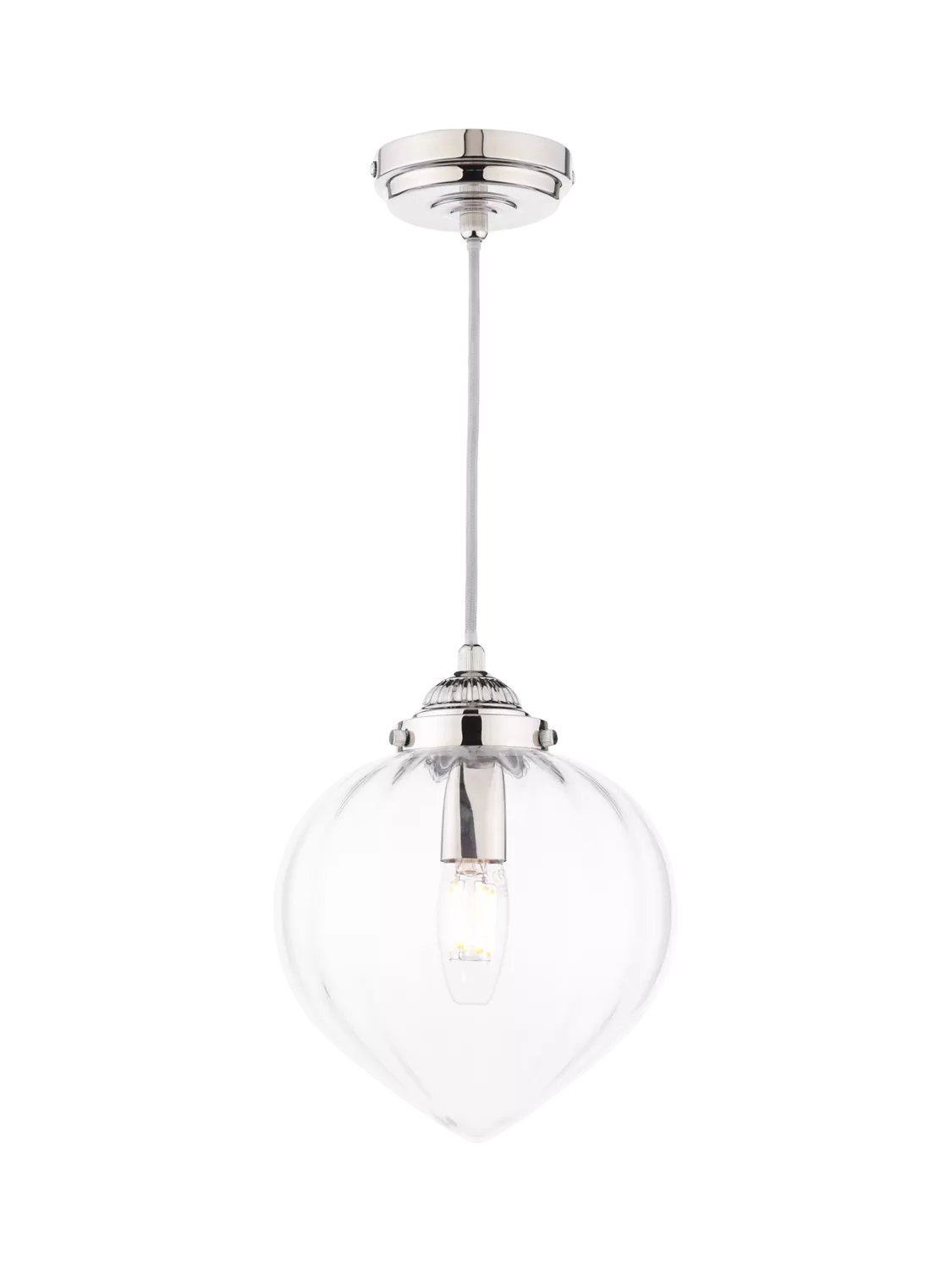 Elevate your lighting with the Laura Ashley Whitham Pendant. This stunning pendant features a polished nickel finish and a clear ribbed glass shade, creating a warm, inviting glow. Ideal for the living room, bedroom or kitchen.