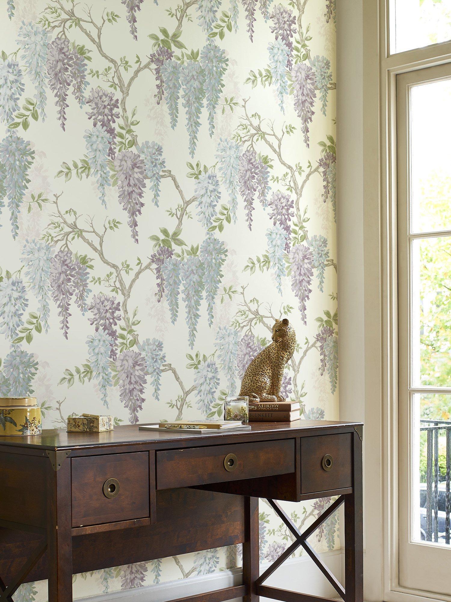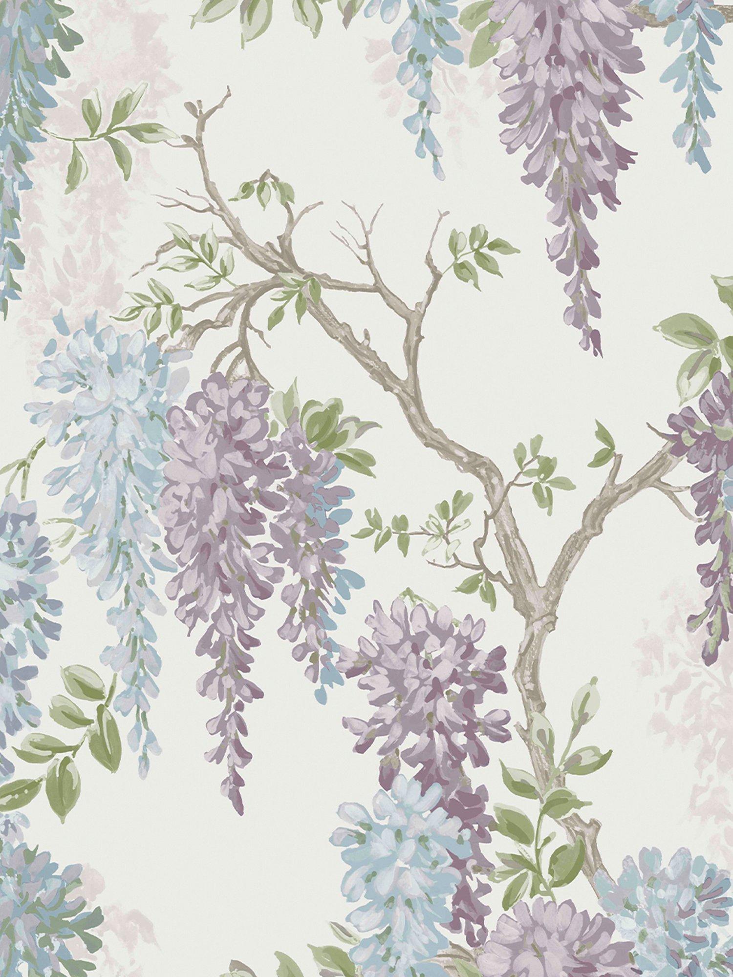 A fabulous redesign of Laura Ashley's popular Wisteria floral wallpaper featuring a trailing design of heavily-laden Wisteria branches in soft shades of duck egg blue and iris.