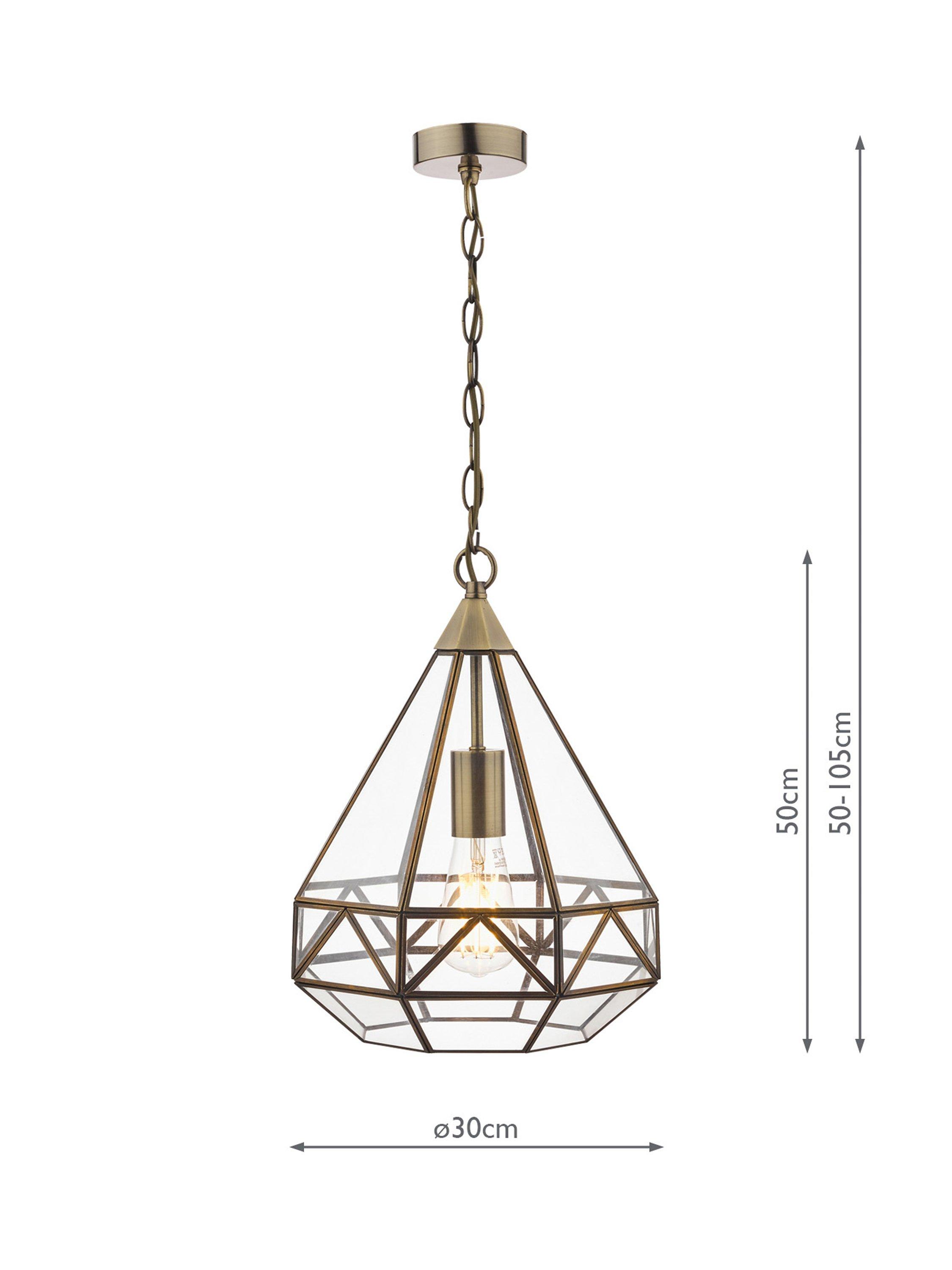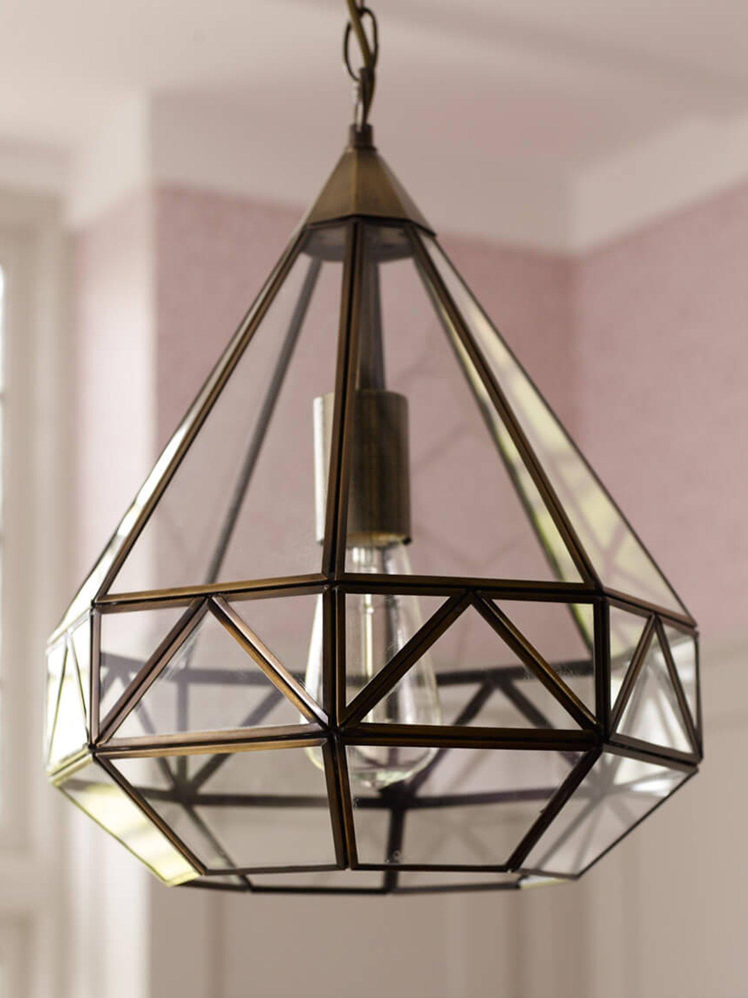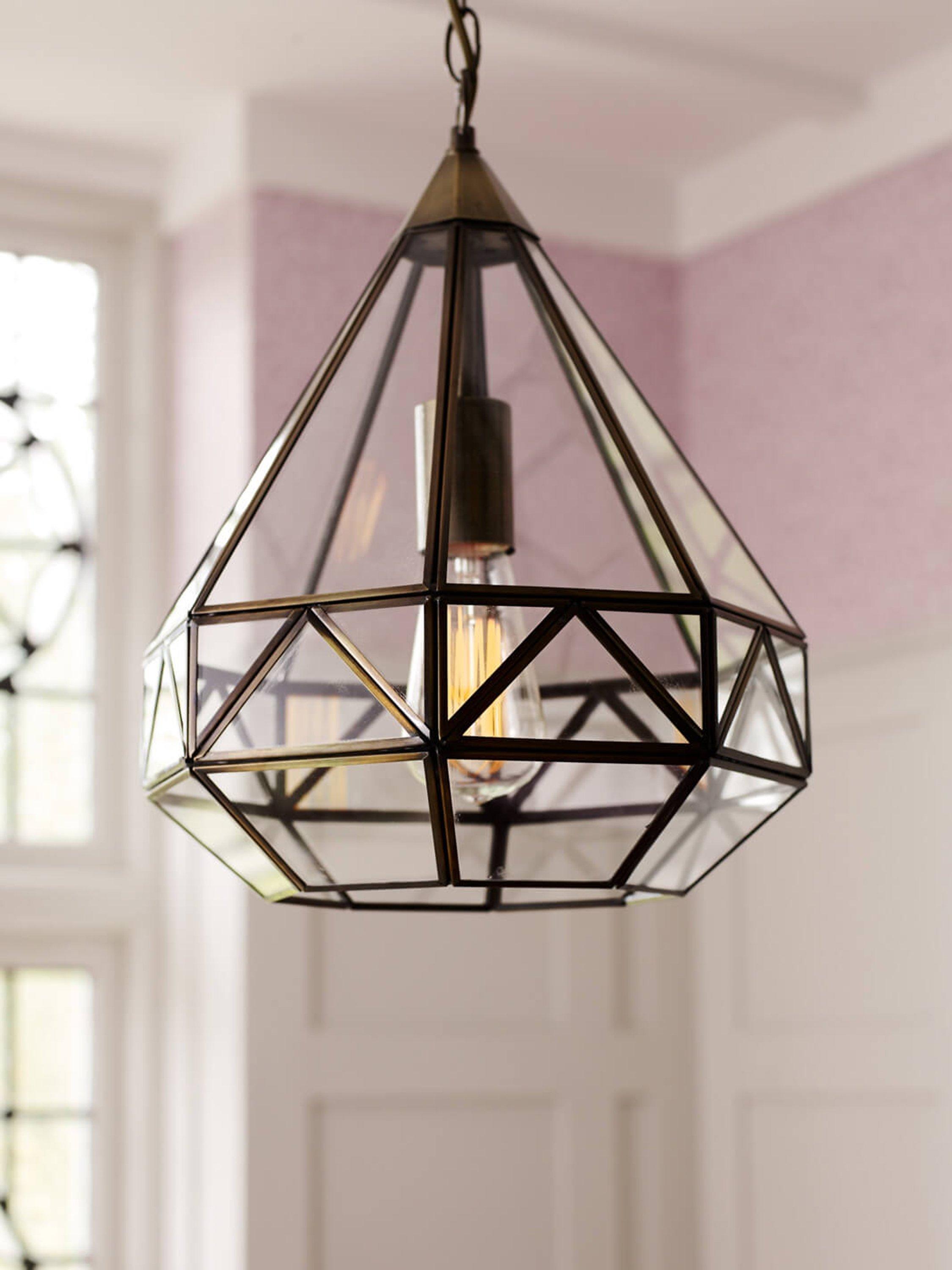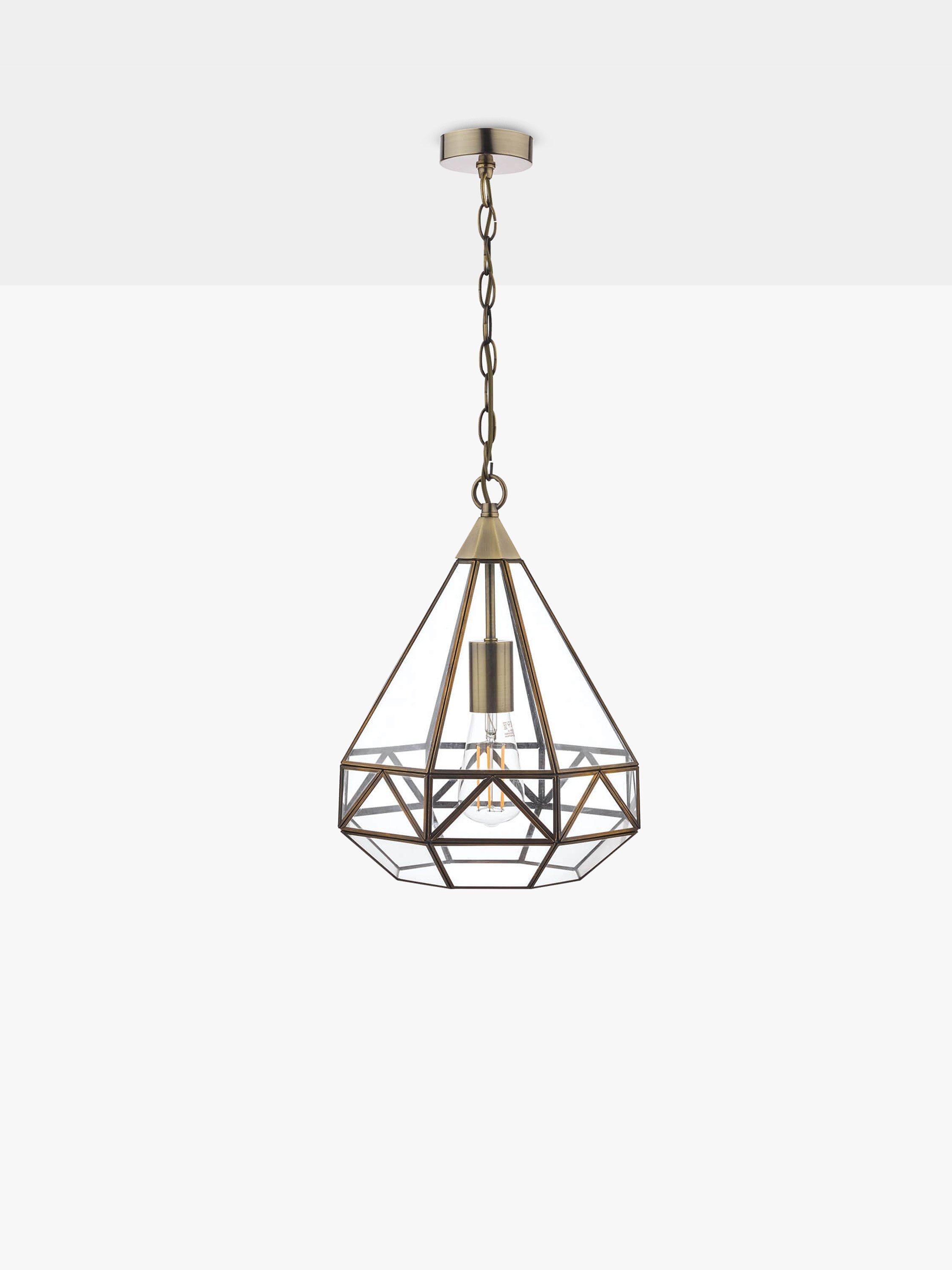 A reinvention of the classic lantern for your modern home. This pendant has a distinctive geometric glass frame that's supported by metal detailing in a choice of finishes. It requires one LED bulb, and when illuminated it offers a warm glow of light. Plus, the chain is height-adjustable at the point of installation. This pendant is versatile, so it would work really well both in bedrooms or directly above a dining table.