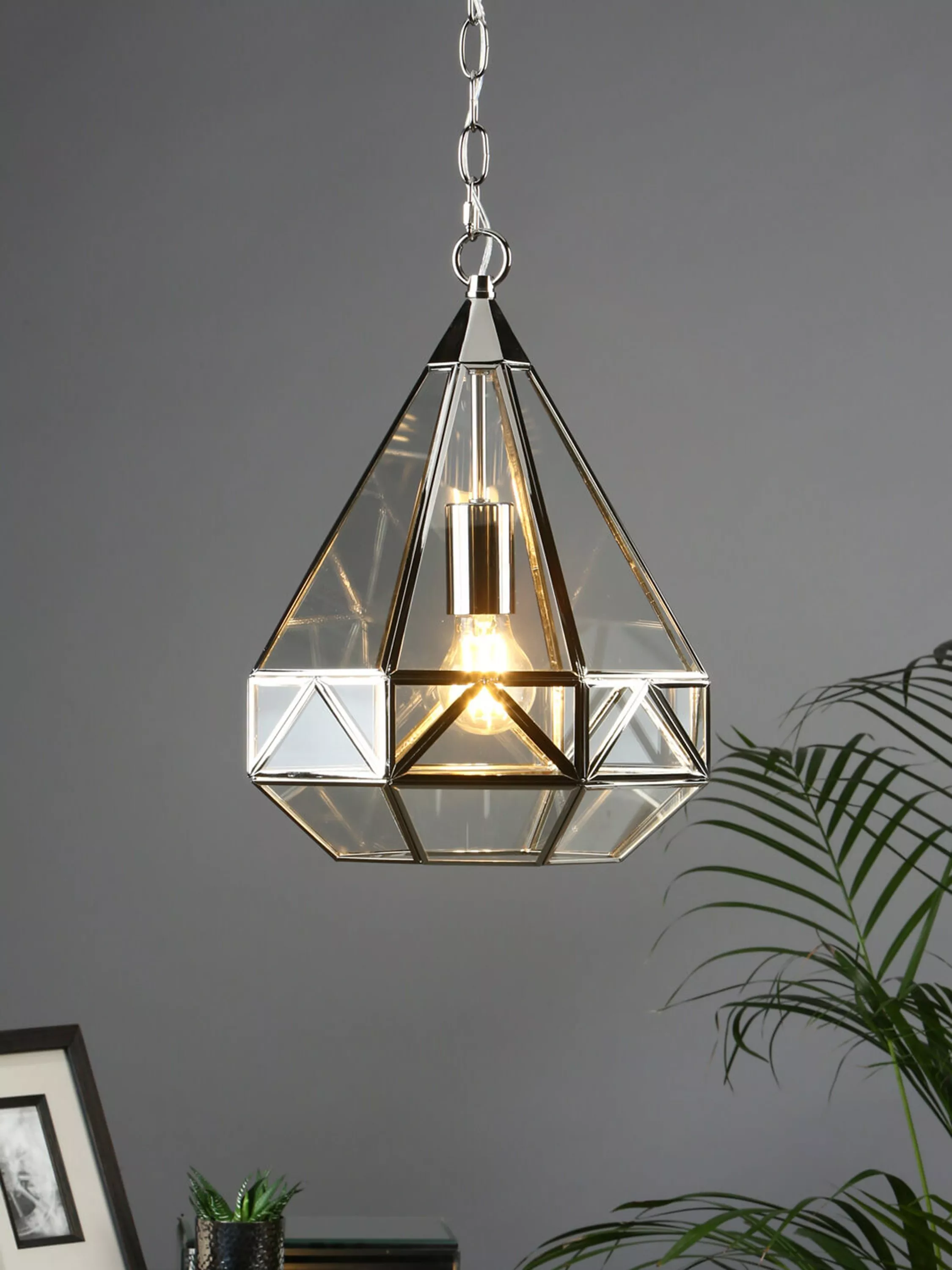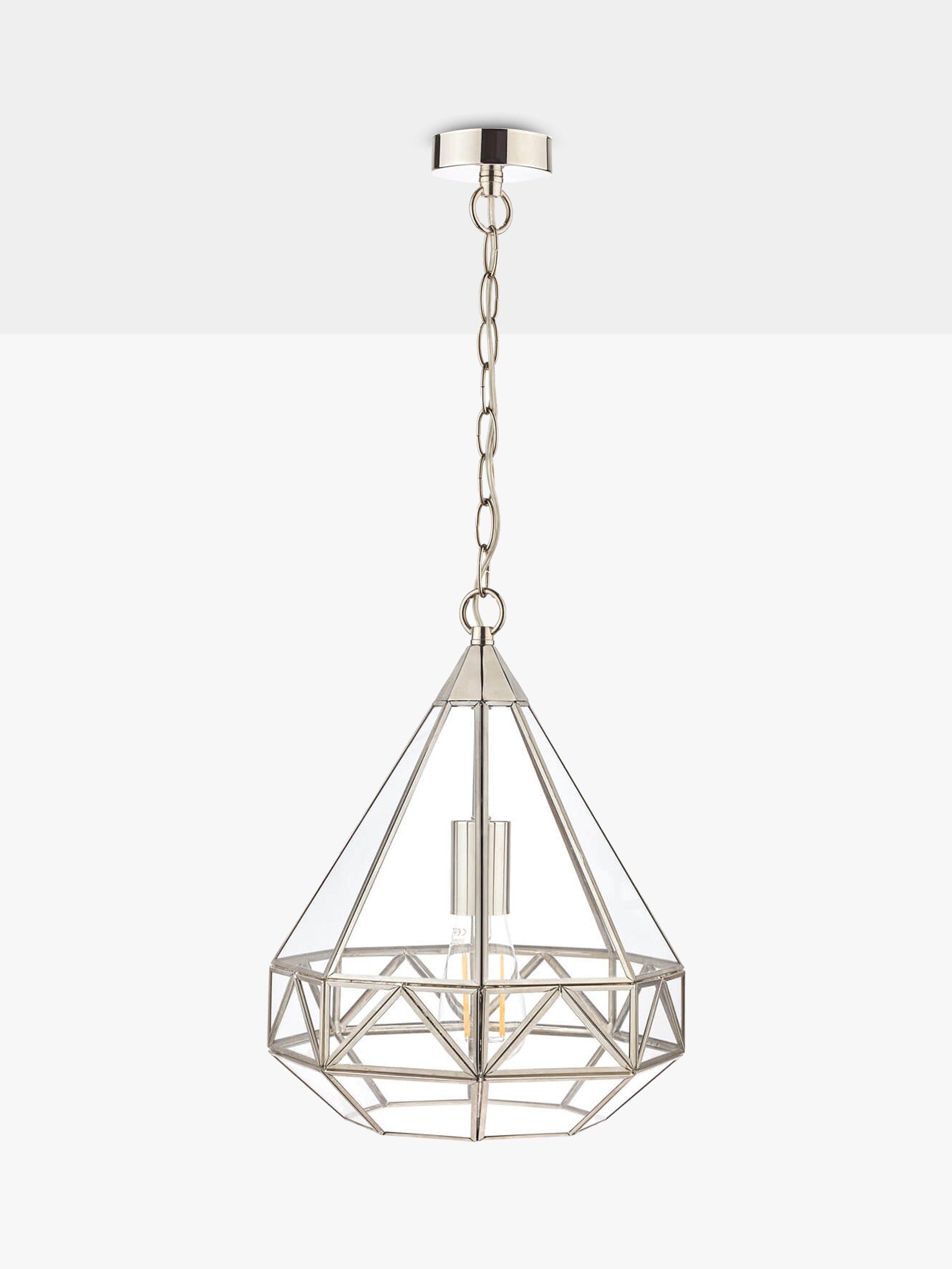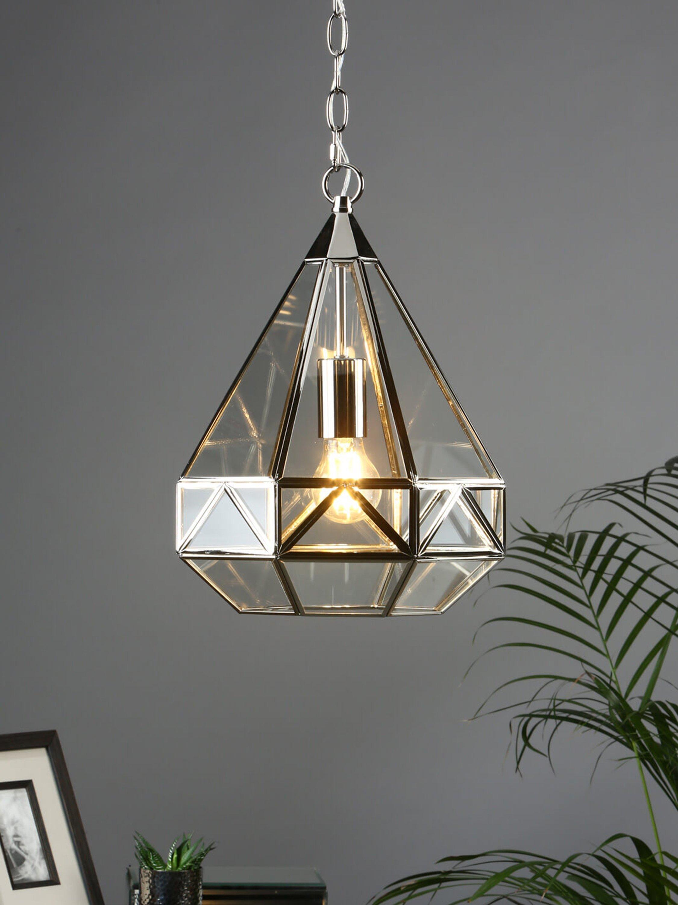A reinvention of the classic lantern for your modern home. This pendant has a distinctive geometric glass frame that's supported by metal detailing in a choice of finishes. It requires one LED bulb, and when illuminated it offers a warm glow of light. Plus, the chain is height-adjustable at the point of installation. This pendant is versatile, so it would work really well both in bedrooms or directly above a dining table.
