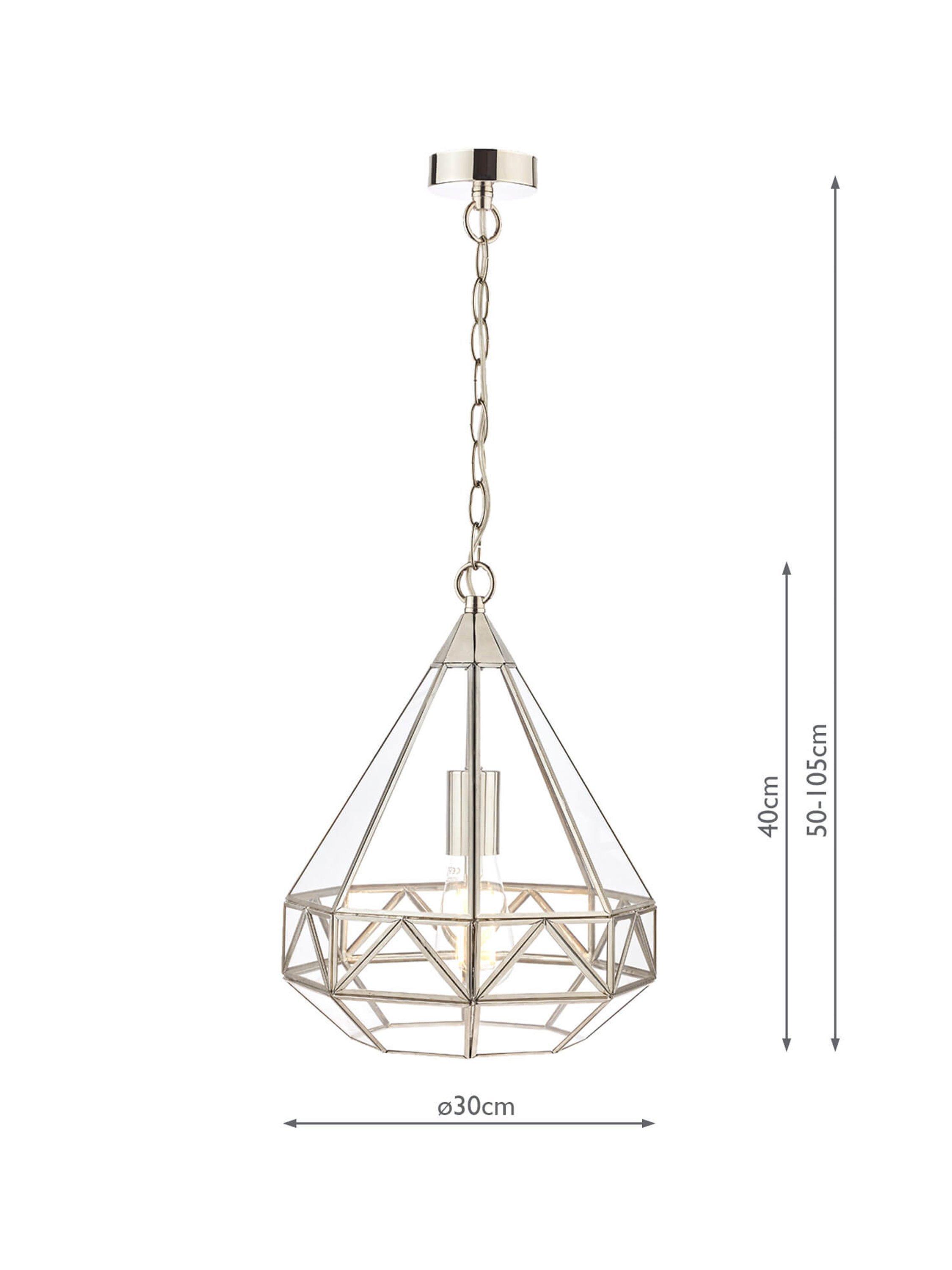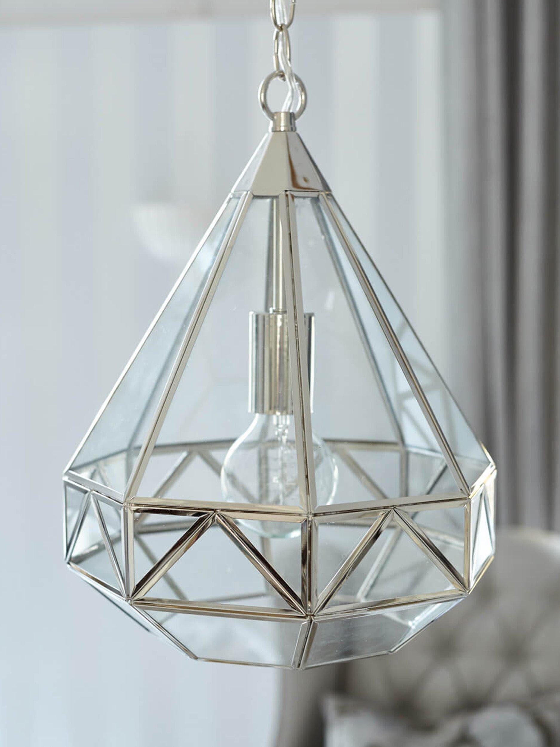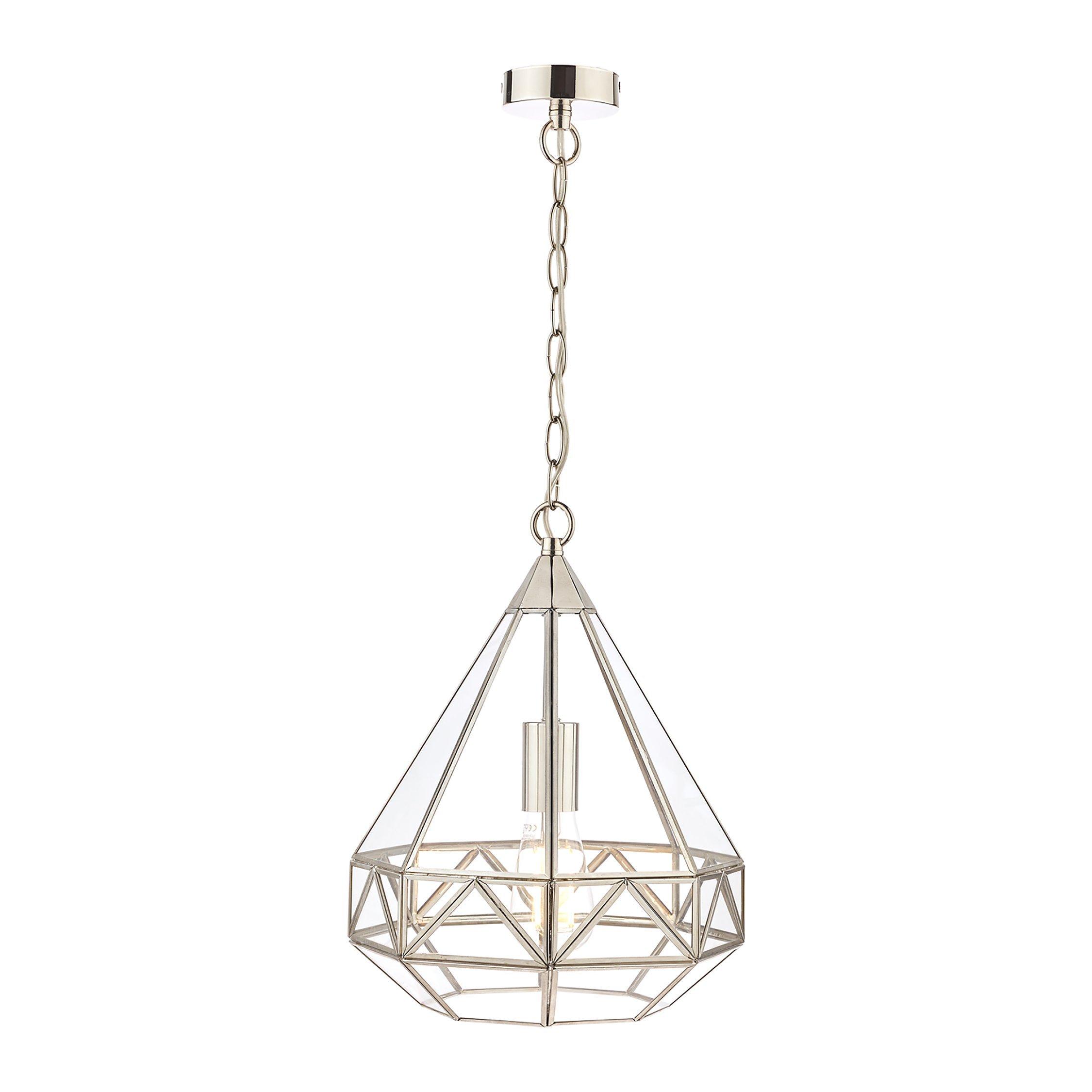 A reinvention of the classic lantern for your modern home. This pendant has a distinctive geometric glass frame that's supported by metal detailing in a choice of finishes. It requires one LED bulb, and when illuminated it offers a warm glow of light. Plus, the chain is height-adjustable at the point of installation. This pendant is versatile, so it would work really well both in bedrooms or directly above a dining table.