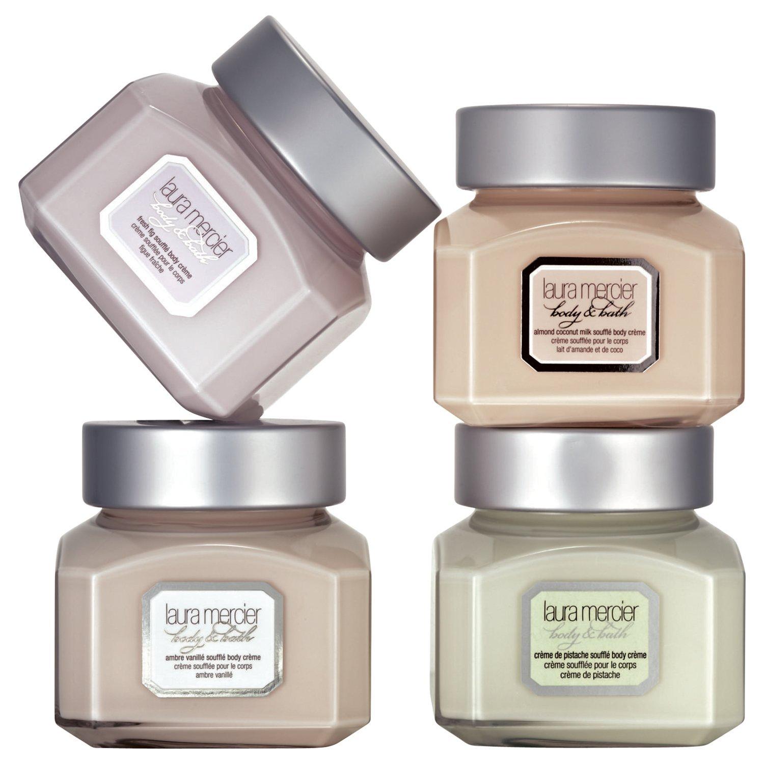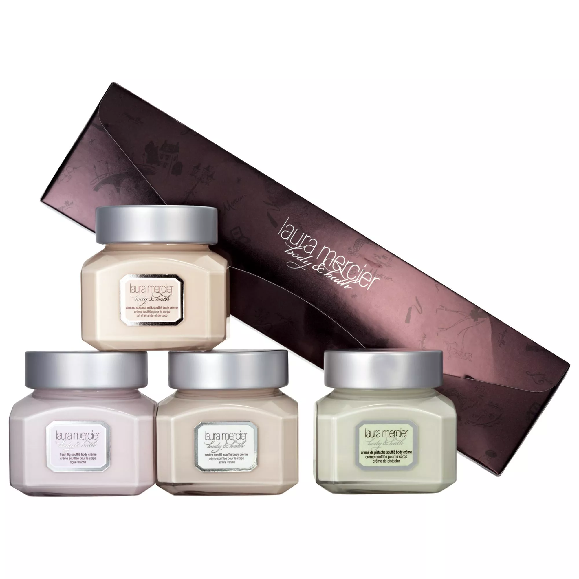 Laura Mercier's Soufflé Body Crème Sampler Collection presents a quartet of Laura's favorite ultra-rich Soufflé Body Crèmes in Almond Coconut Milk, Ambre Vanillé, Crème Brûlée and Crème de Pistache. Blended with the finest gourmande notes, each delectable body crème contains active ingredients in a silky smooth super-whipped soufflé formula that instantly nourishes the skin with vitamins and protein derivatives, while Shea Butter and Macadamia Nut Oil provide conditioning benefits.