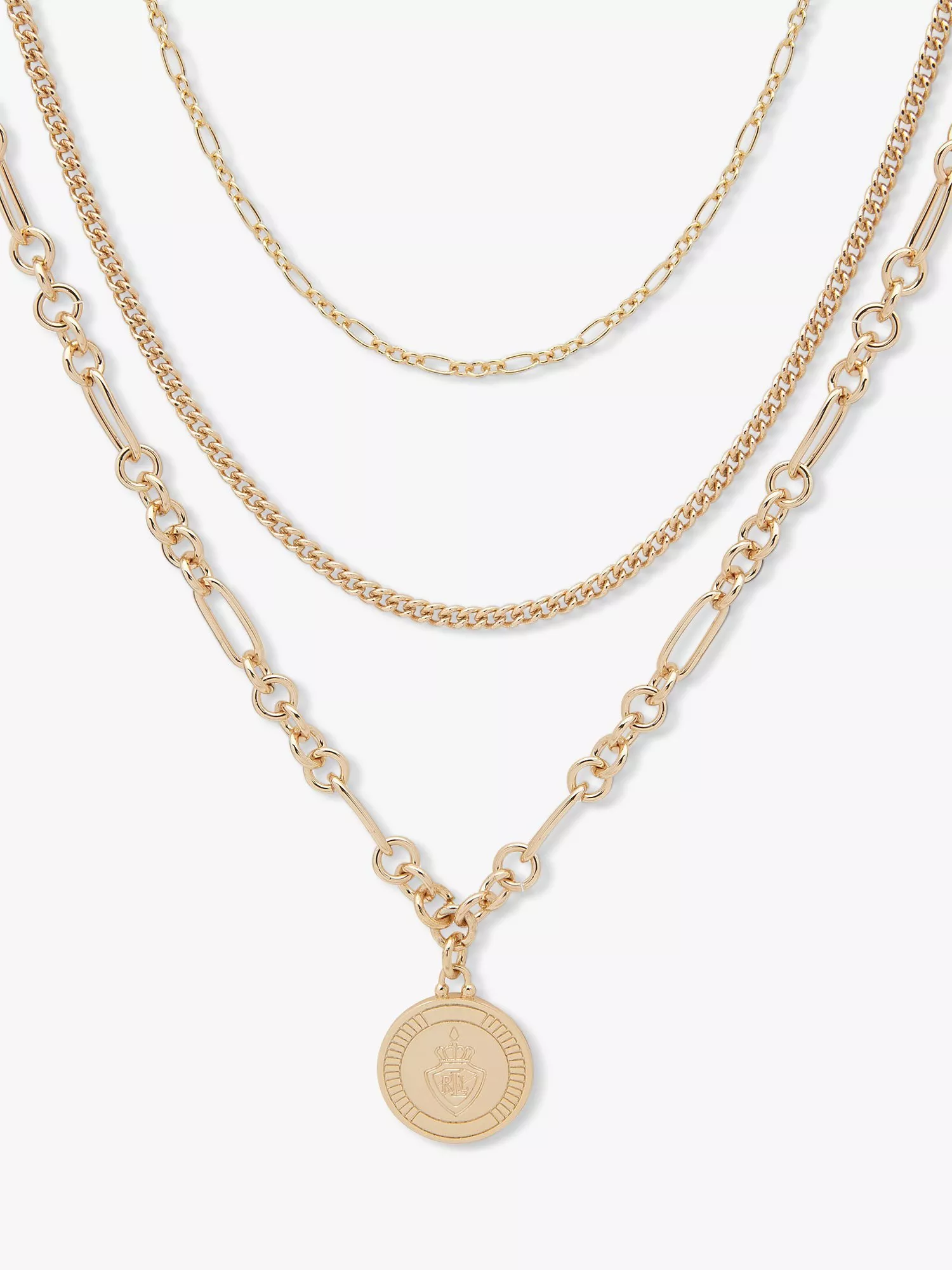 Layer it up with this effortless and timelessly stylish multi-row pendant necklace. The signature Lauren Ralph Lauren crest is engraved on a gold finish coin and hangs from a chain-link necklace that's further complemented with two other chain-link necklaces.
