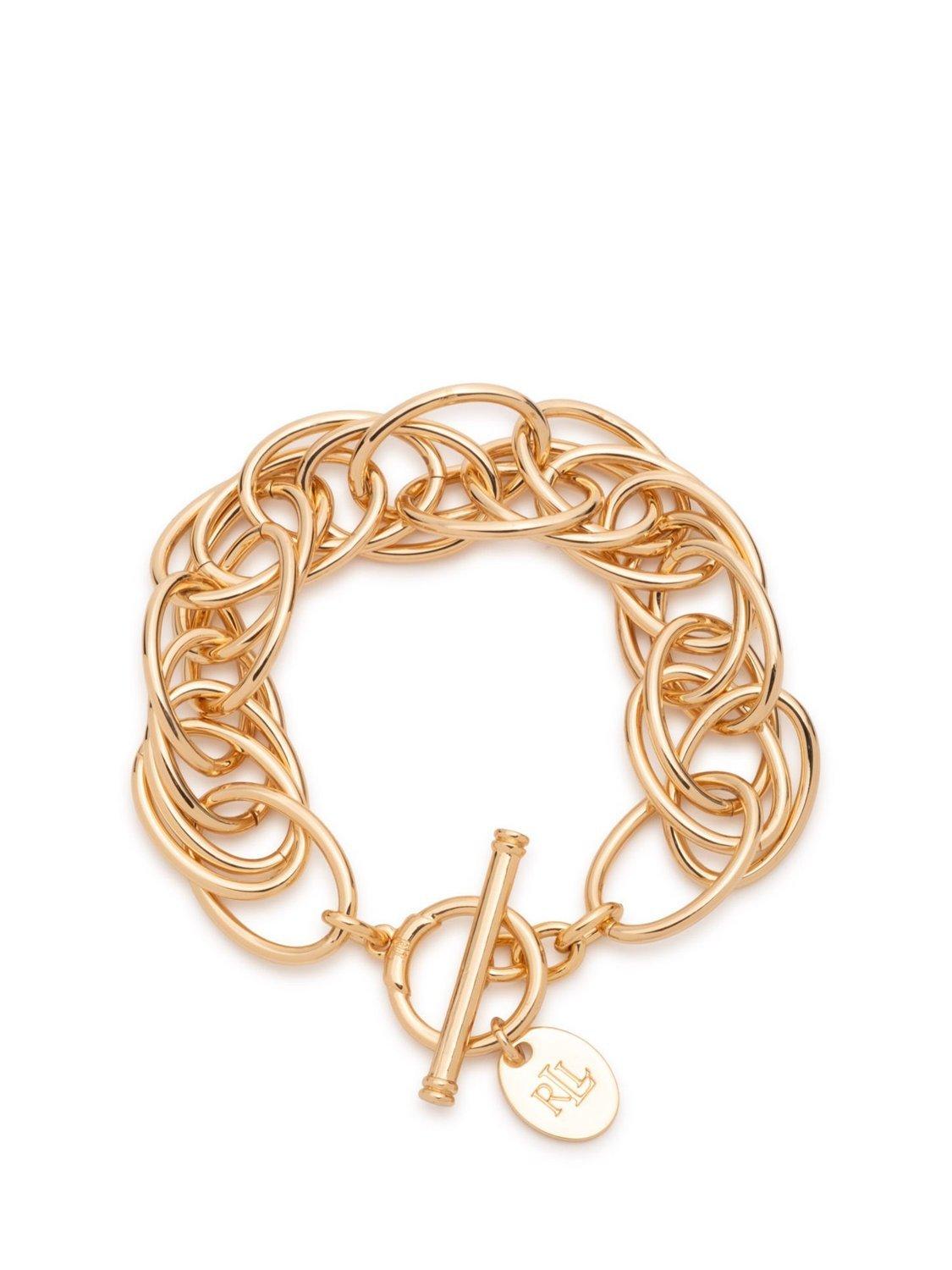 This Lauren Ralph Lauren gold bracelet features interlocking links and a chic toggle clasp, creating a striking and timeless statement piece for any occasion.