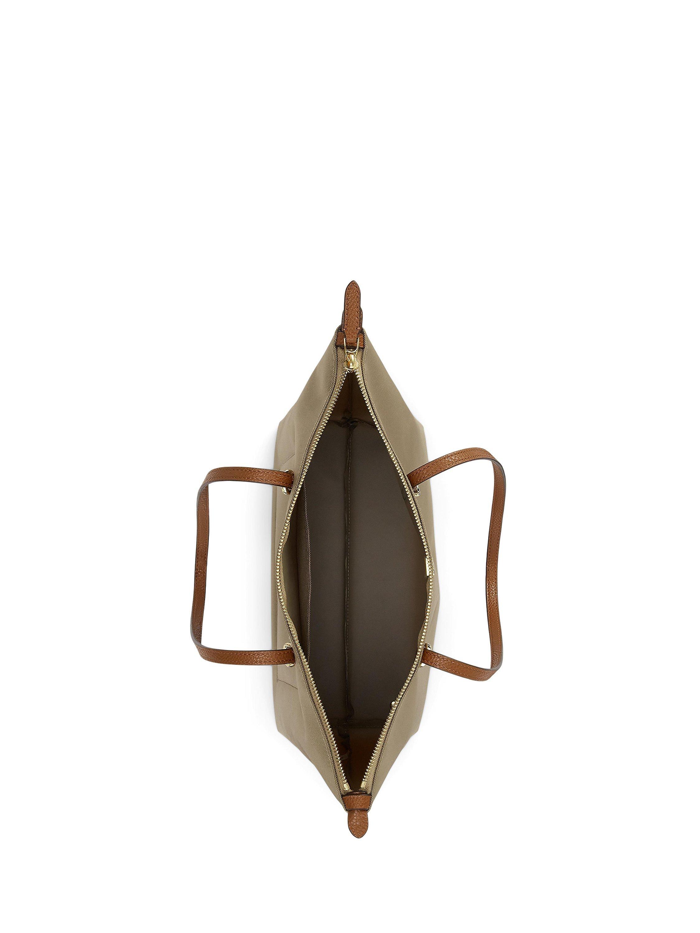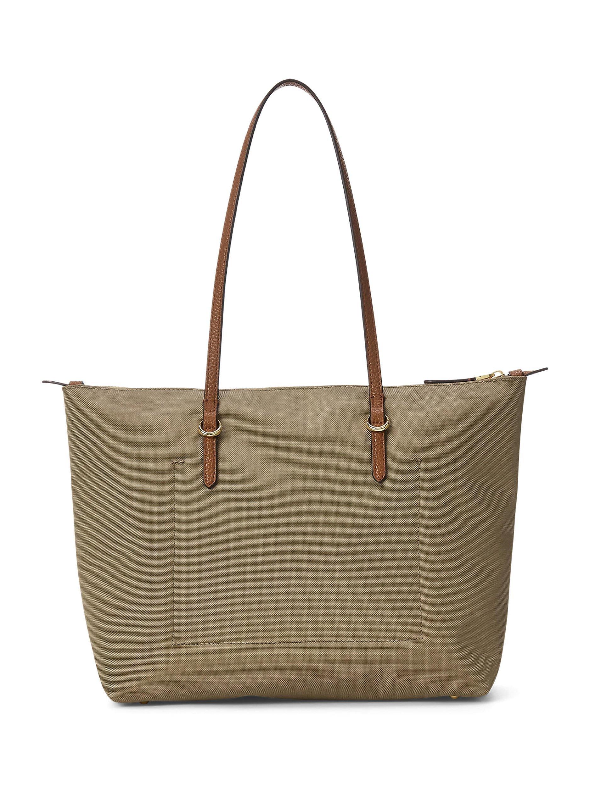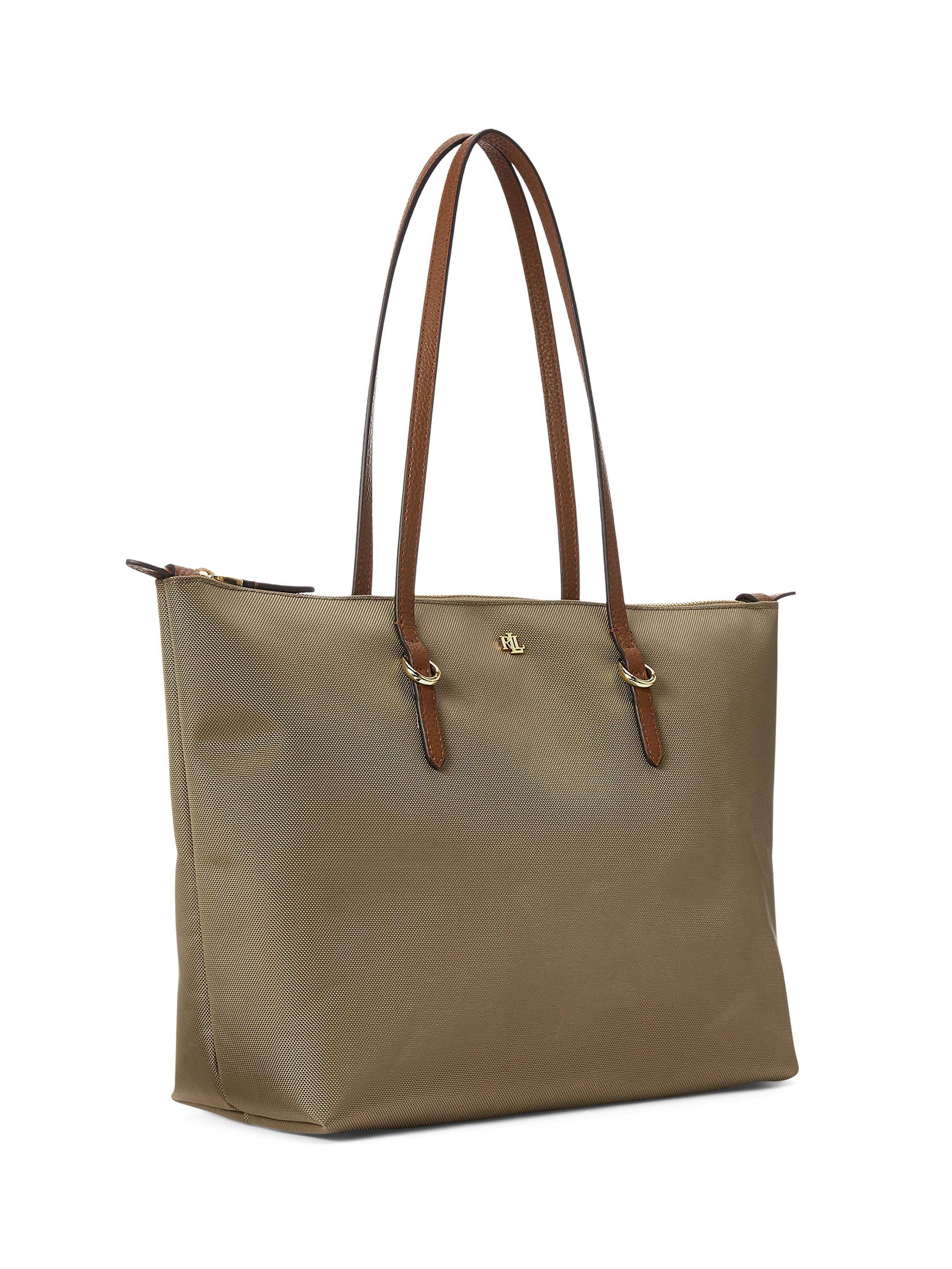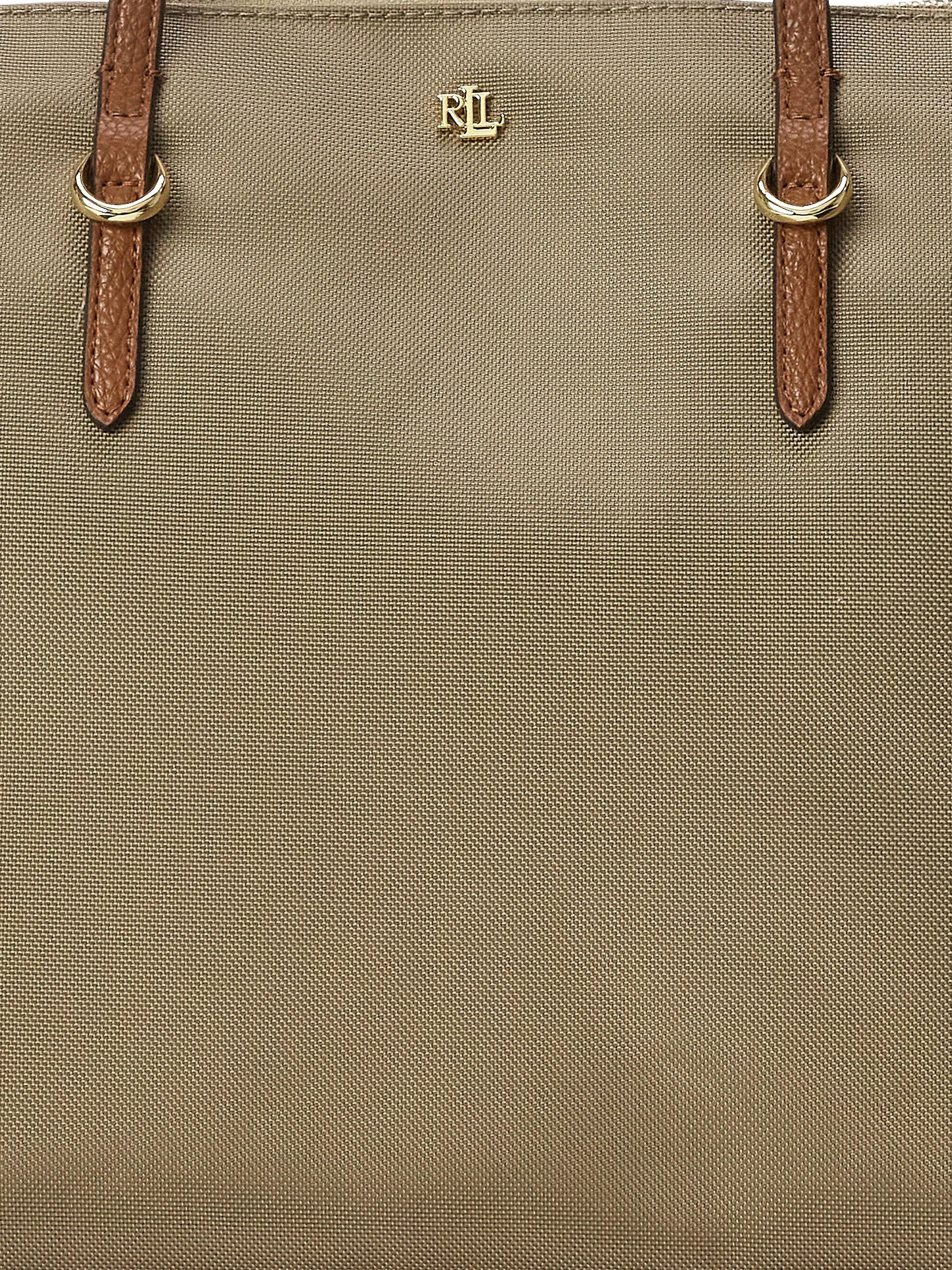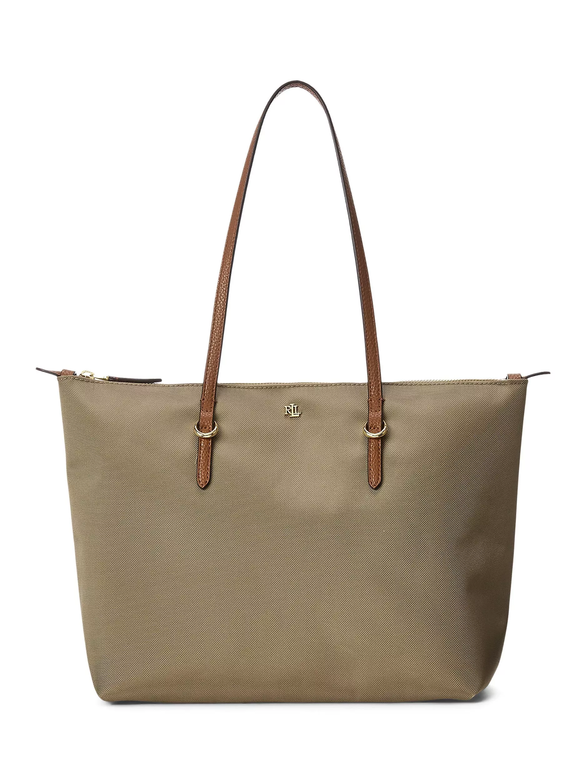 Crafted with durable nylon and designed with sumptuous faux-leather straps, the medium Keaton tote features a spacious silhouette, perfect for carrying the day’s essentials. A versatile must-have, it’s finished with an “LRL” metal logo at the front for signature style.