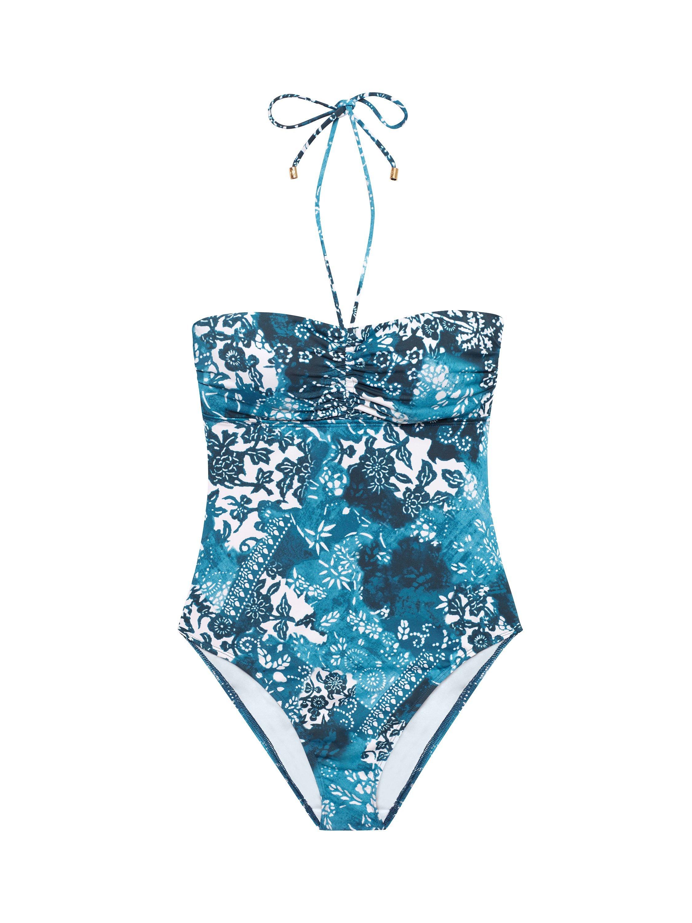 Printed with a pretty floral patchwork print, this swimsuit from Lauren Ralph Lauren is cut to a bandeau silhouette, has moulded cups and ties at the back in a halterneck design.