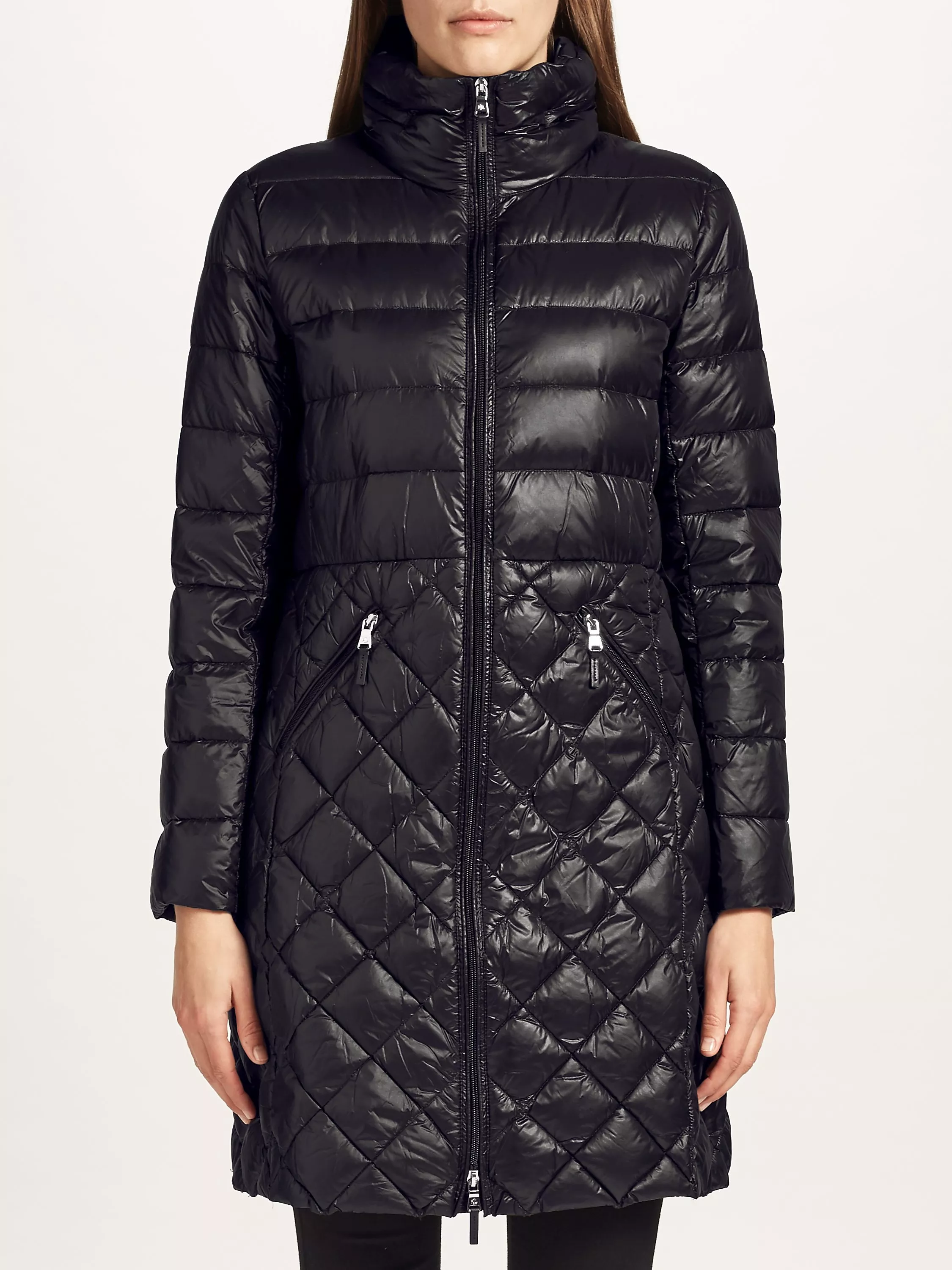 Designed with horizontal and diamond quilting, this coat effortlessly flatters the silhouette. It has a straight fit that skims the hips, a funnel neckline, zip through front and zipped pockets for a practical finish.