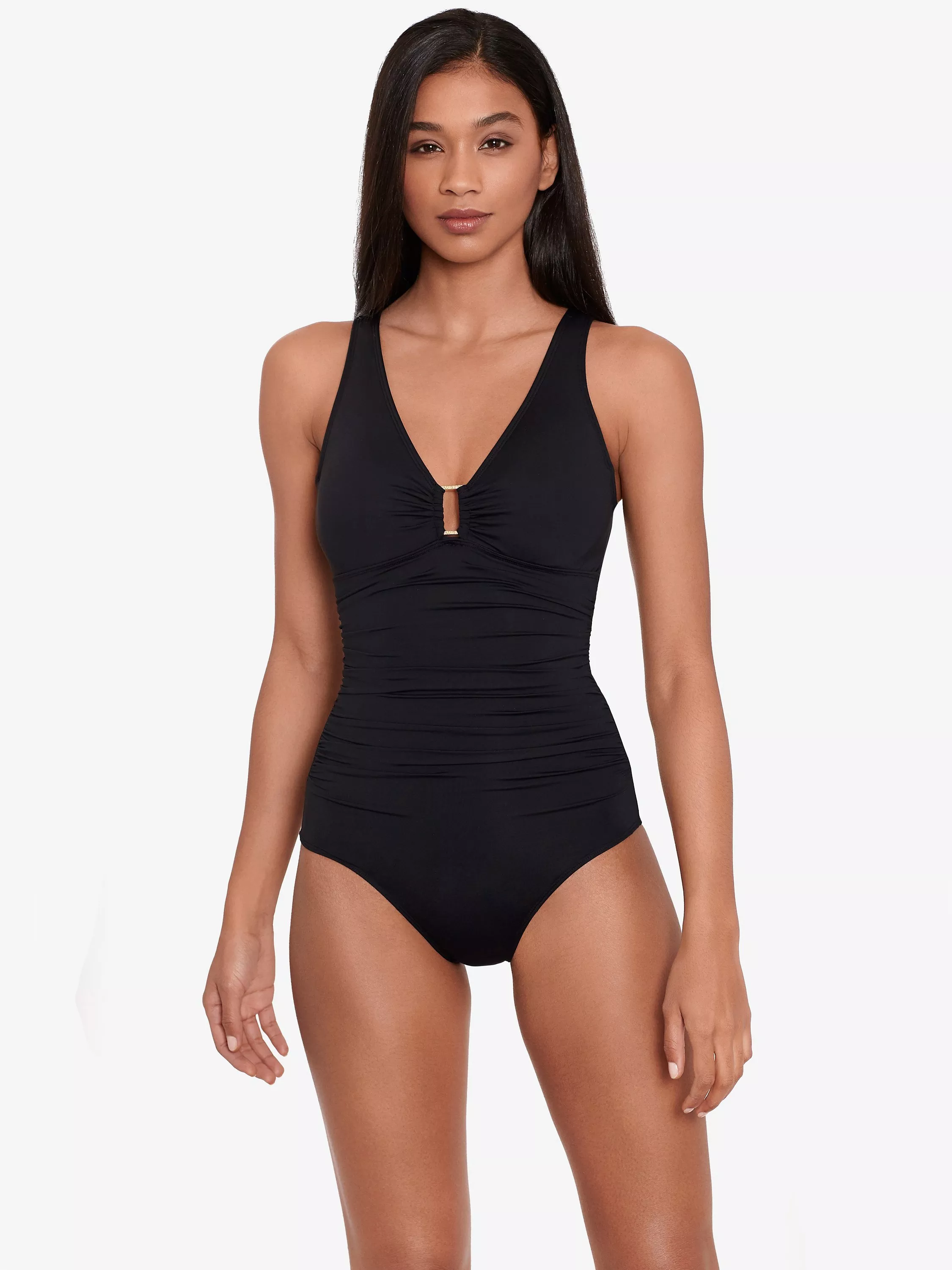 Destined for sun-drenched beach days, this ring front swimsuit by Lauren Ralph Lauren complements with a plunging neckline, underwiring, removable padding and a scooped back.