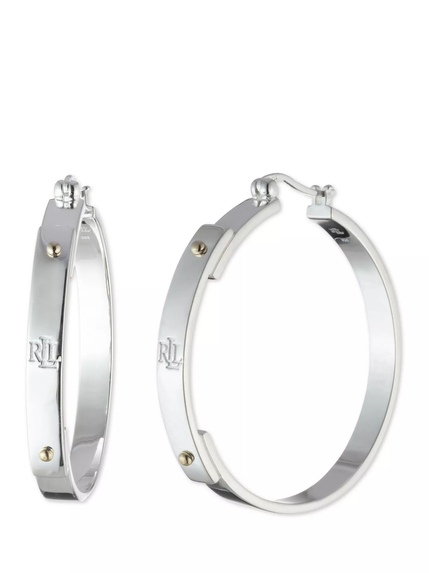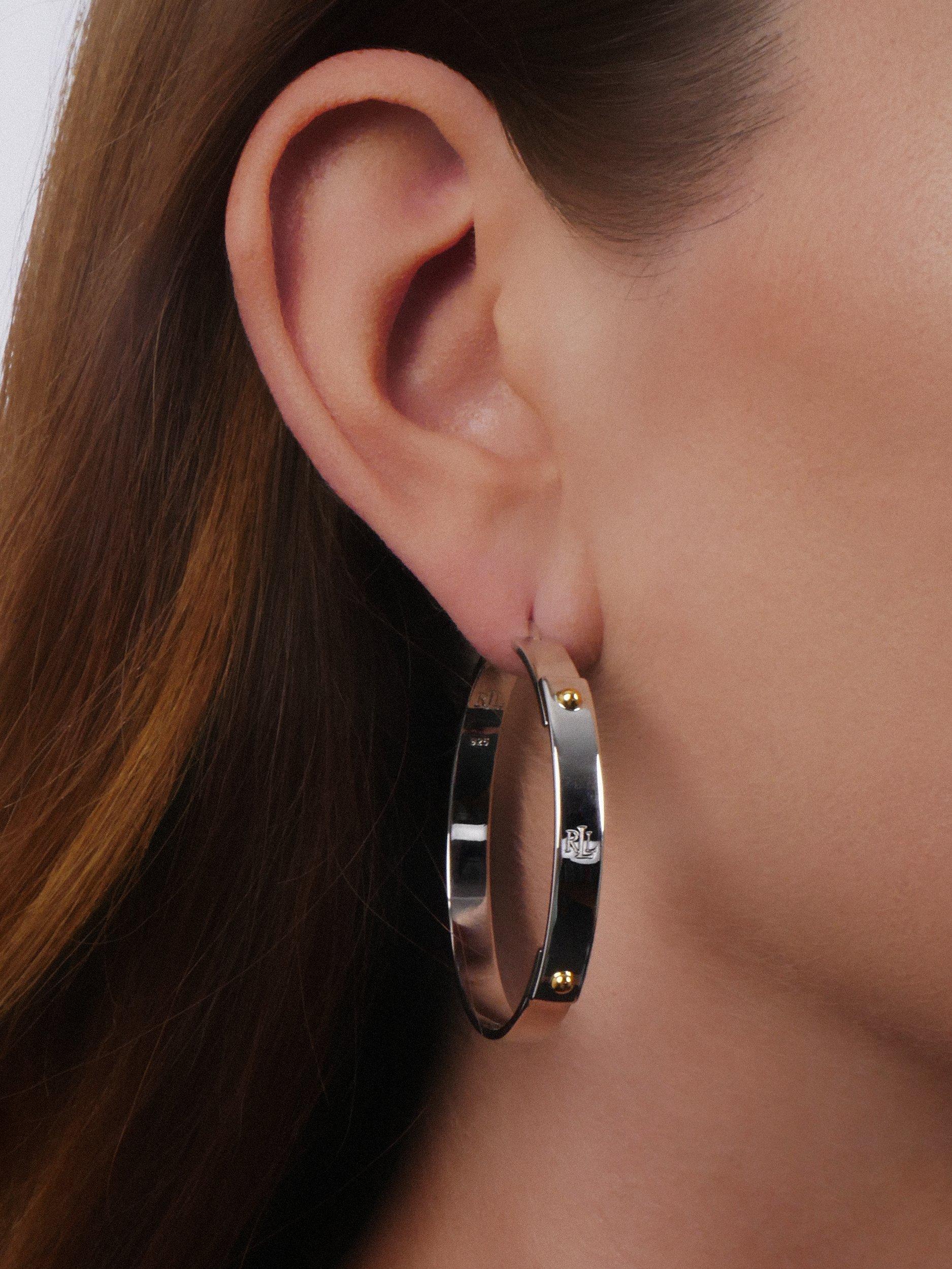 Sculpted to a hoop shape, this pair of earrings from Ralph Lauren brings something new to your accessories edit with their contrast stud detail and engraved logo on front.