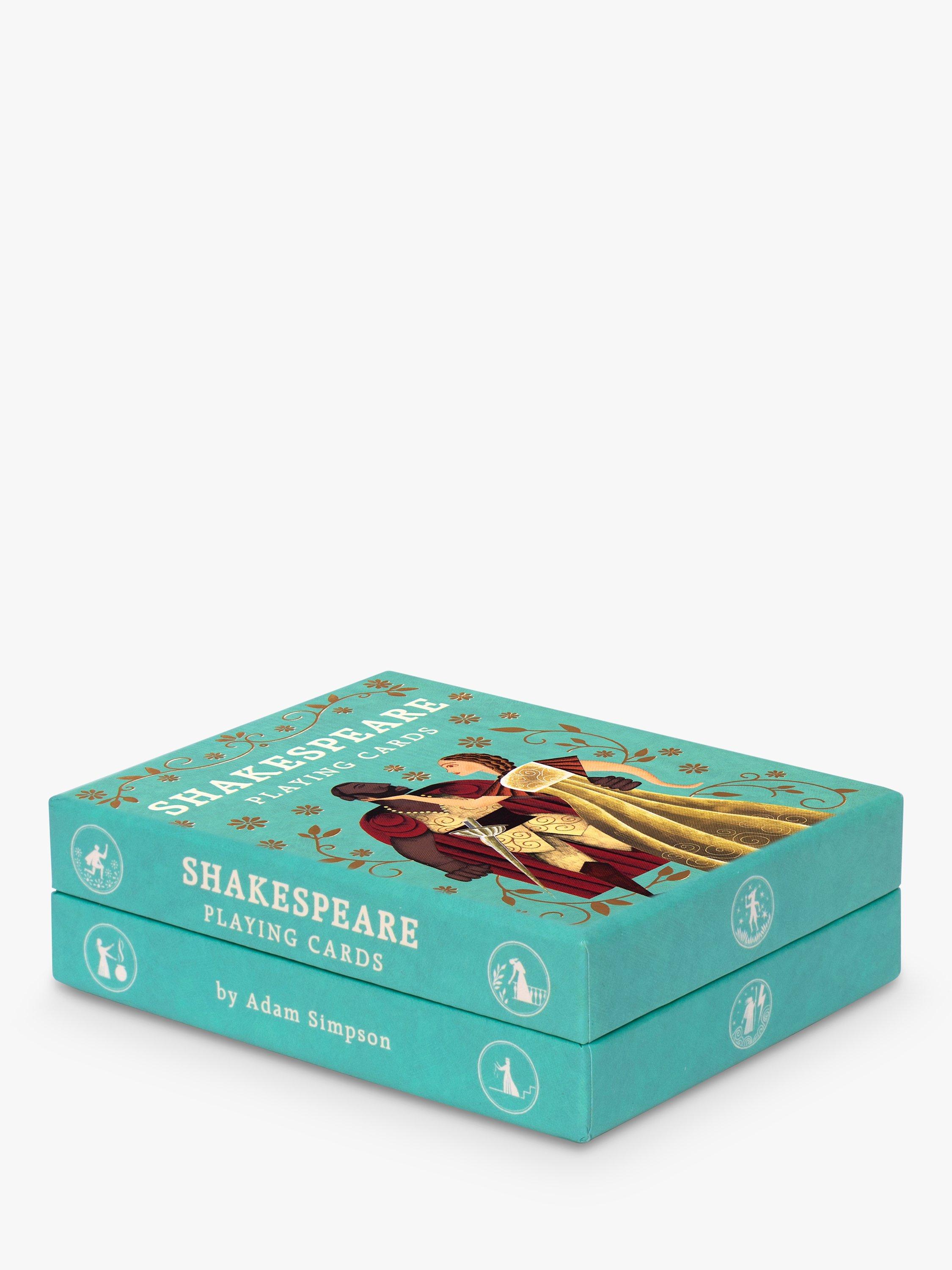 A beautiful set of playing cards featuring illustrations of Shakespeare's most famous characters. Play your favourite card games with Romeo and Juliet as King and Queen of Hearts, Lady Macbeth as Ace Villain, and let Adam Simpson's artwork bring Shakespeare's plays to life.