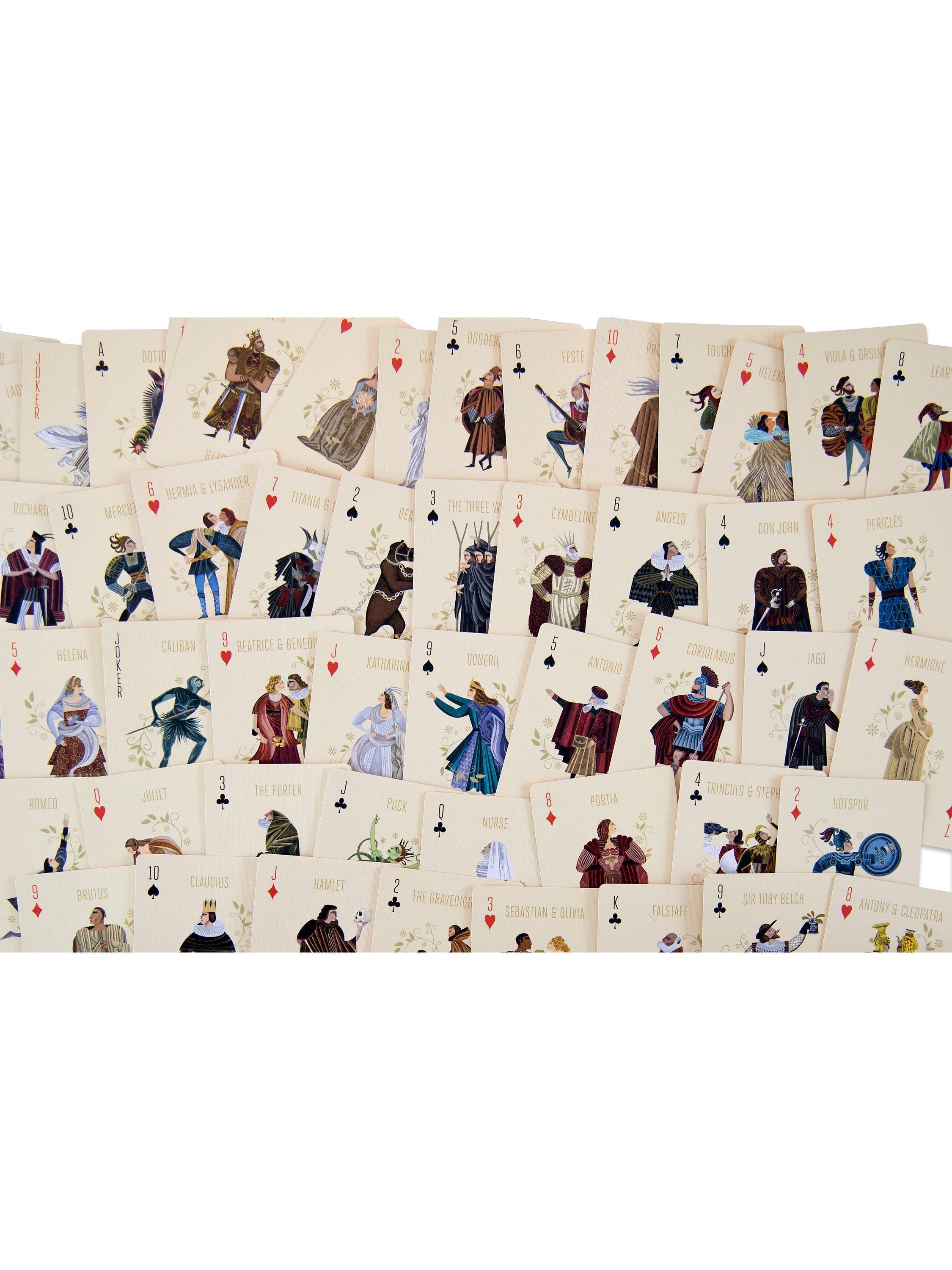 Arranged in four suits - with hearts = lovers, clubs = fools, diamonds = heroes and heroines, and spades = villains, plus two jokers, of course - this artist-illustrated deck of playing cards features 54 of Shakespeare's most famous characters. It includes a booklet with text about each character and their place in literary history.