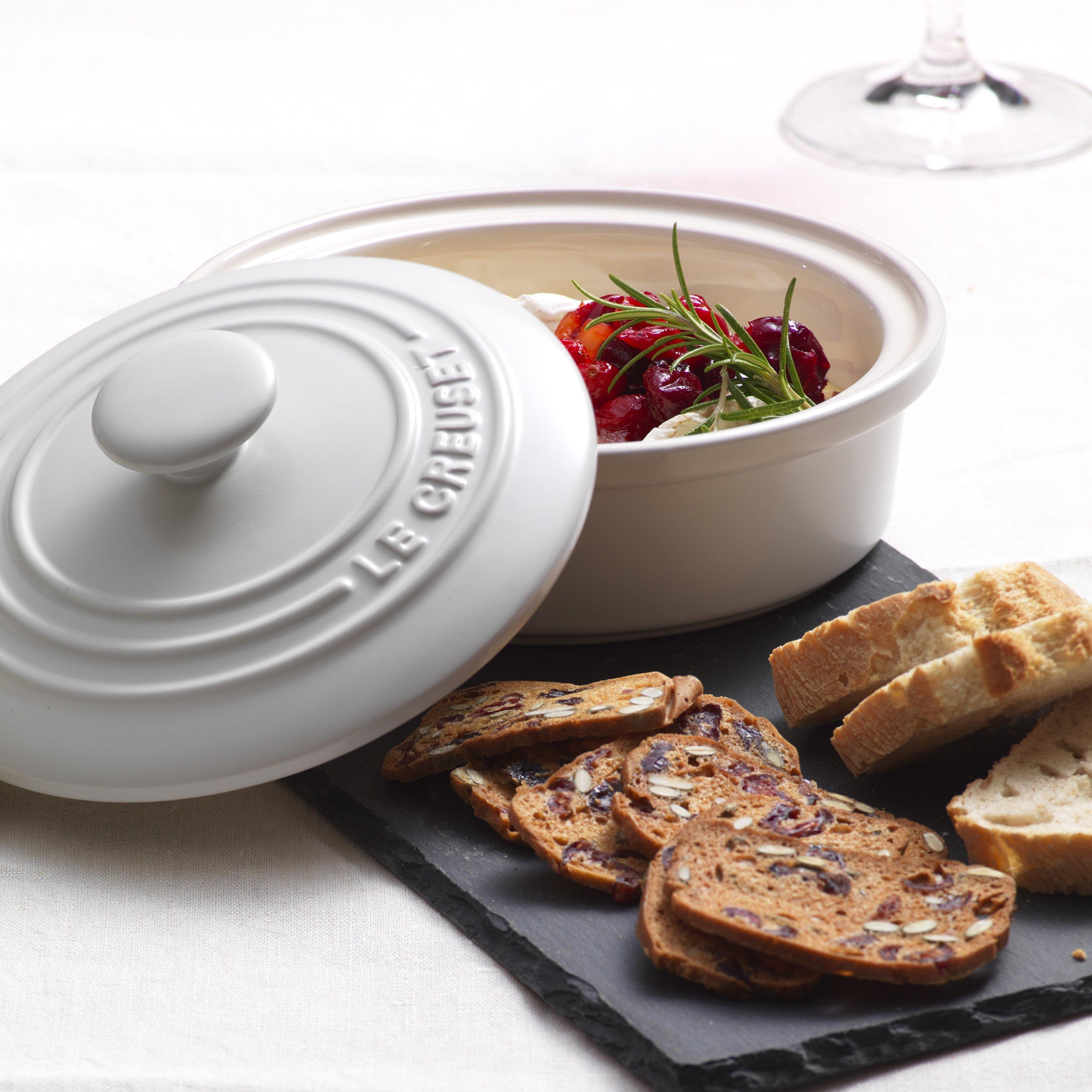 Turn a wheel of Camembert or any soft cheese into the ultimate comfort food with Le Creuset's Camembert Baker. Once partially melted, top the cheese with dried fruit, chutney or fresh ground pepper. The dense stoneware distributes heat evenly and prevents scorching.