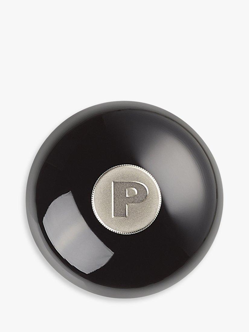 It has a hardened ceramic grinder that's resistant to corrosion for grinding peppercorns and is fully adjustable. The Le Creuset logo is near the base, and an embossed 'P' is on the metal knob, taking inspiration from Le Creuset cast iron casserole knobs.