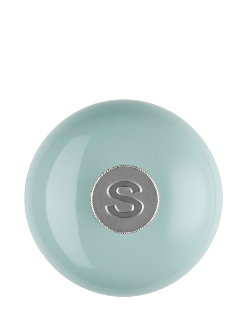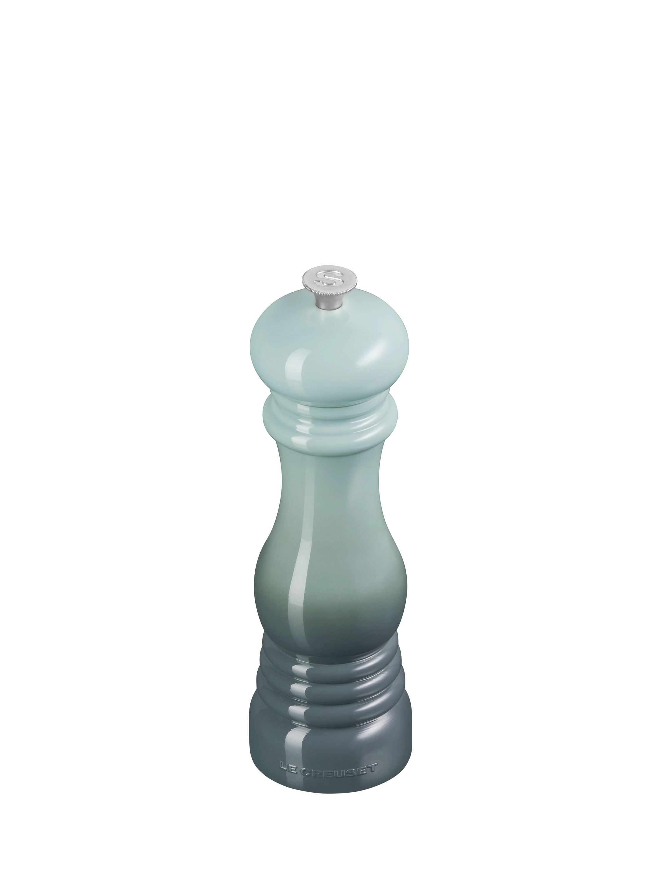 It has a hardened ceramic grinder that's resistant to corrosion for grinding salt and is fully adjustable. The Le Creuset logo is near the base, and an embossed 'S' is on the metal knob, taking inspiration from Le Creuset cast iron casserole knobs.