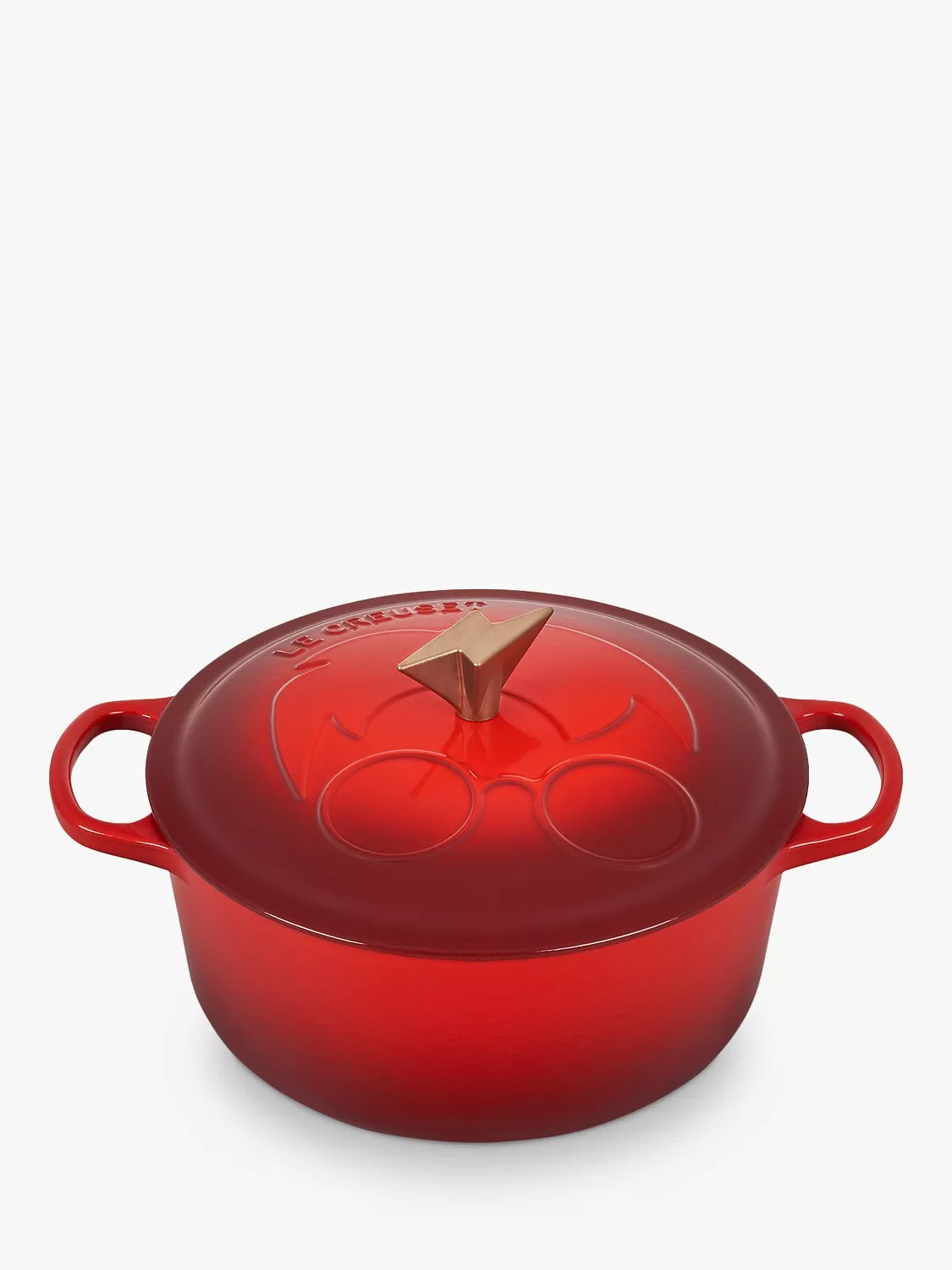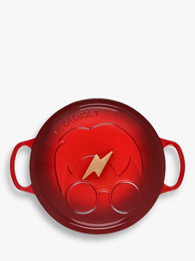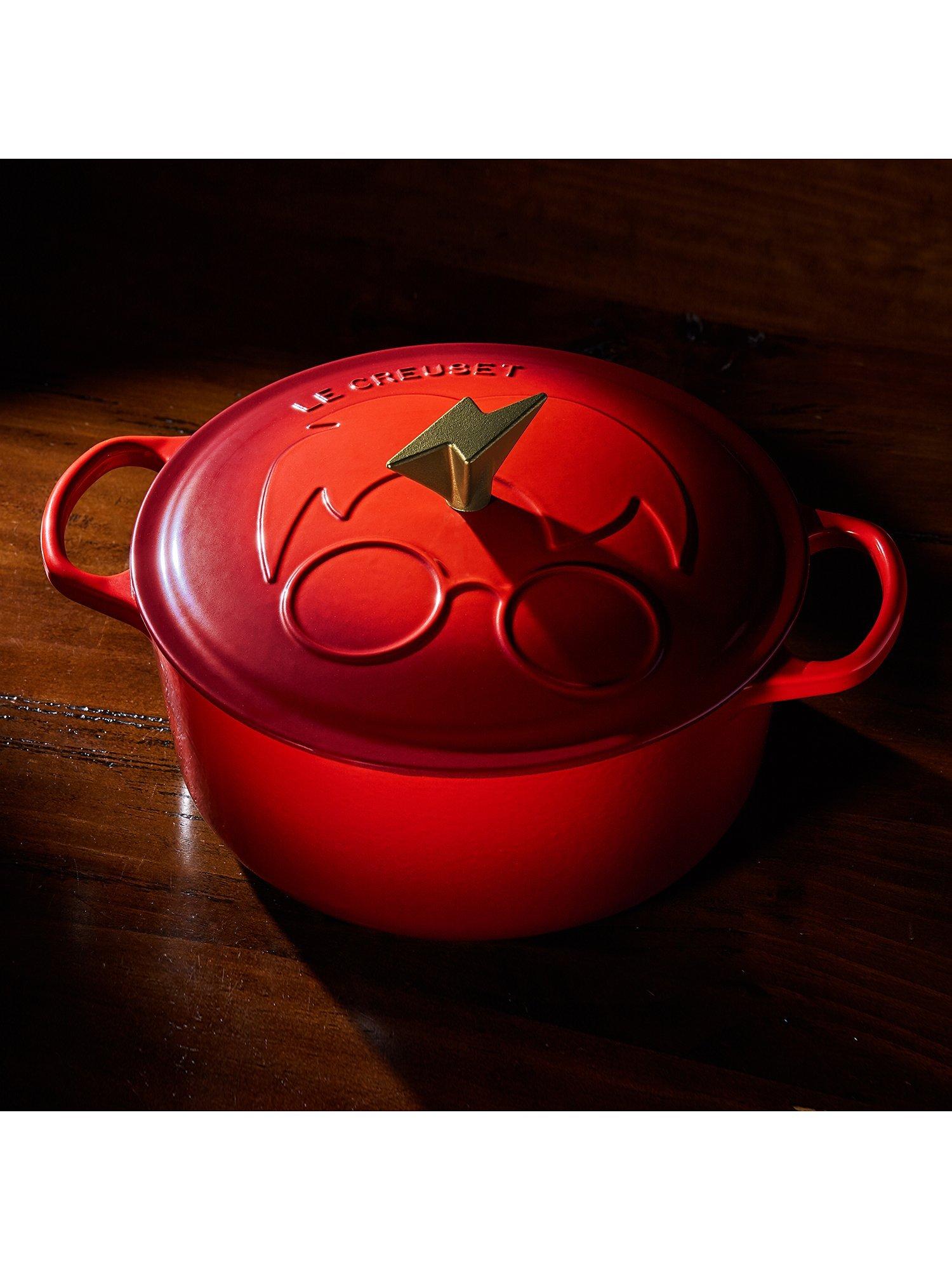 Le Creuset meets Harry Potter with this special edition Signature Round Casserole in the brand's Cerise colour. A solid brass lightning-bolt knob on the lid is inspired by young wizard Harry Potter's iconic scar, centred between embossed hair and an outline of his famous spectacles.