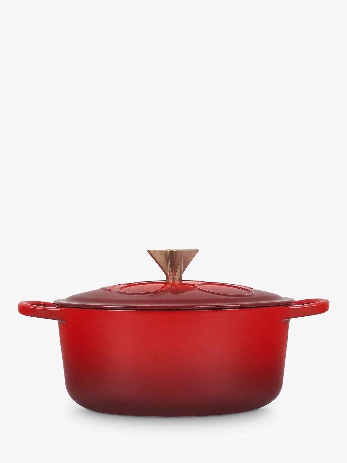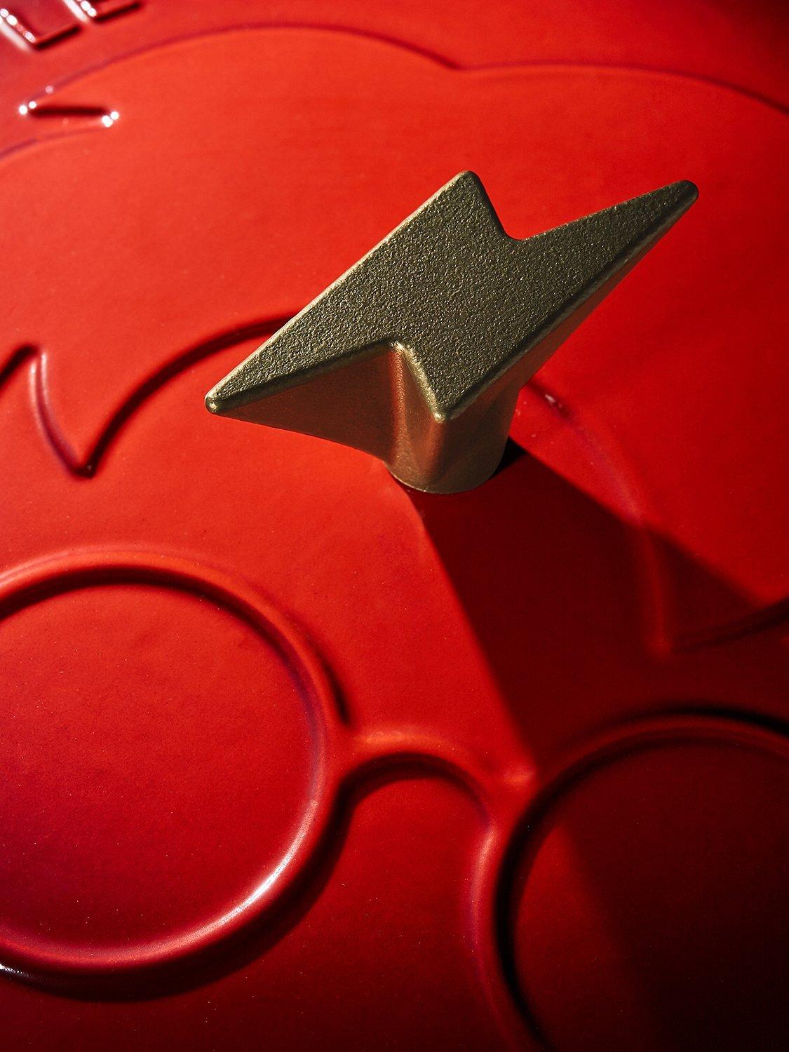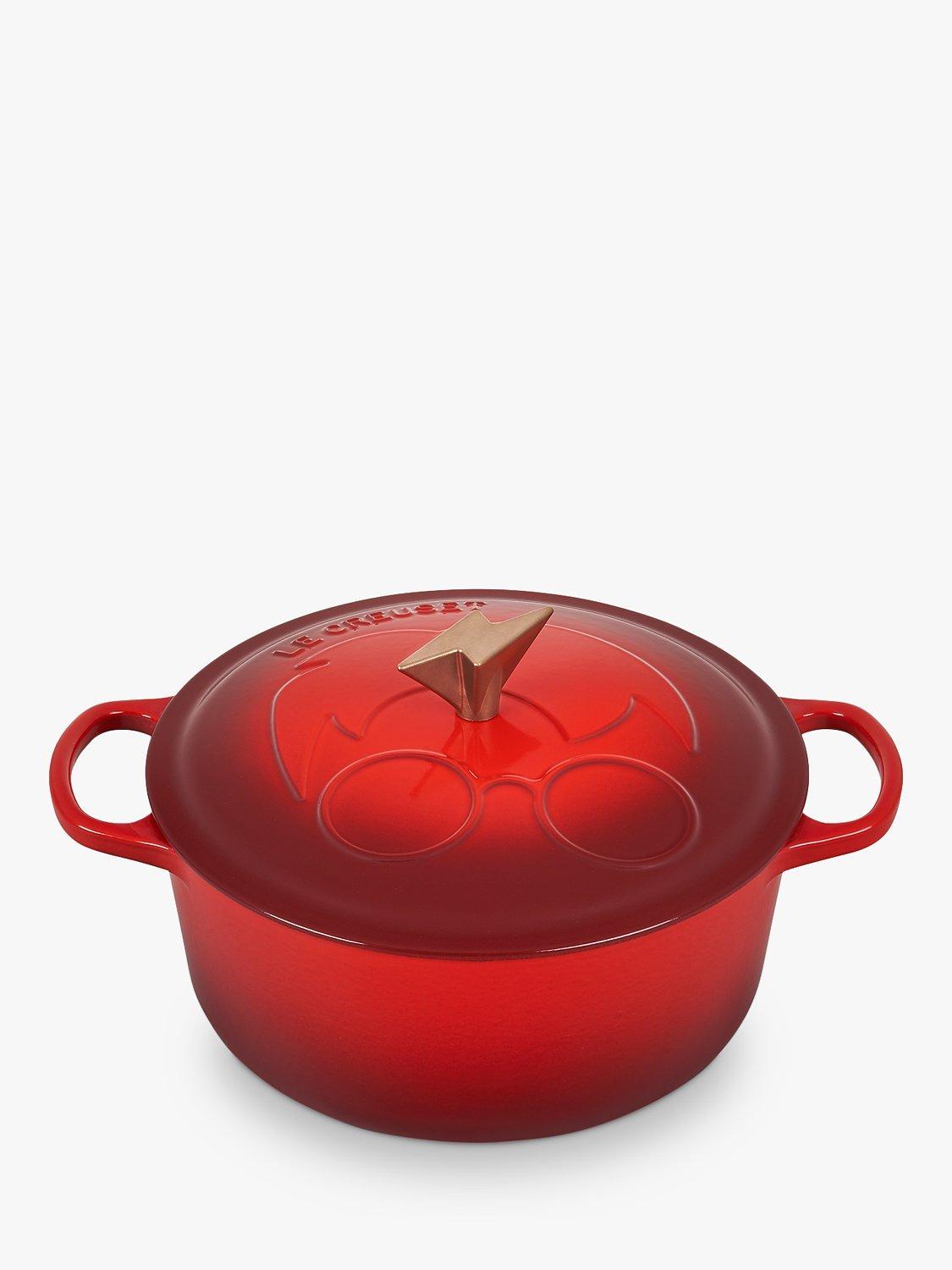 Le Creuset meets Harry Potter with this special edition Signature Round Casserole in the brand's Cerise colour. A solid brass lightning-bolt knob on the lid is inspired by young wizard Harry Potter's iconic scar, centred between embossed hair and an outline of his famous spectacles.