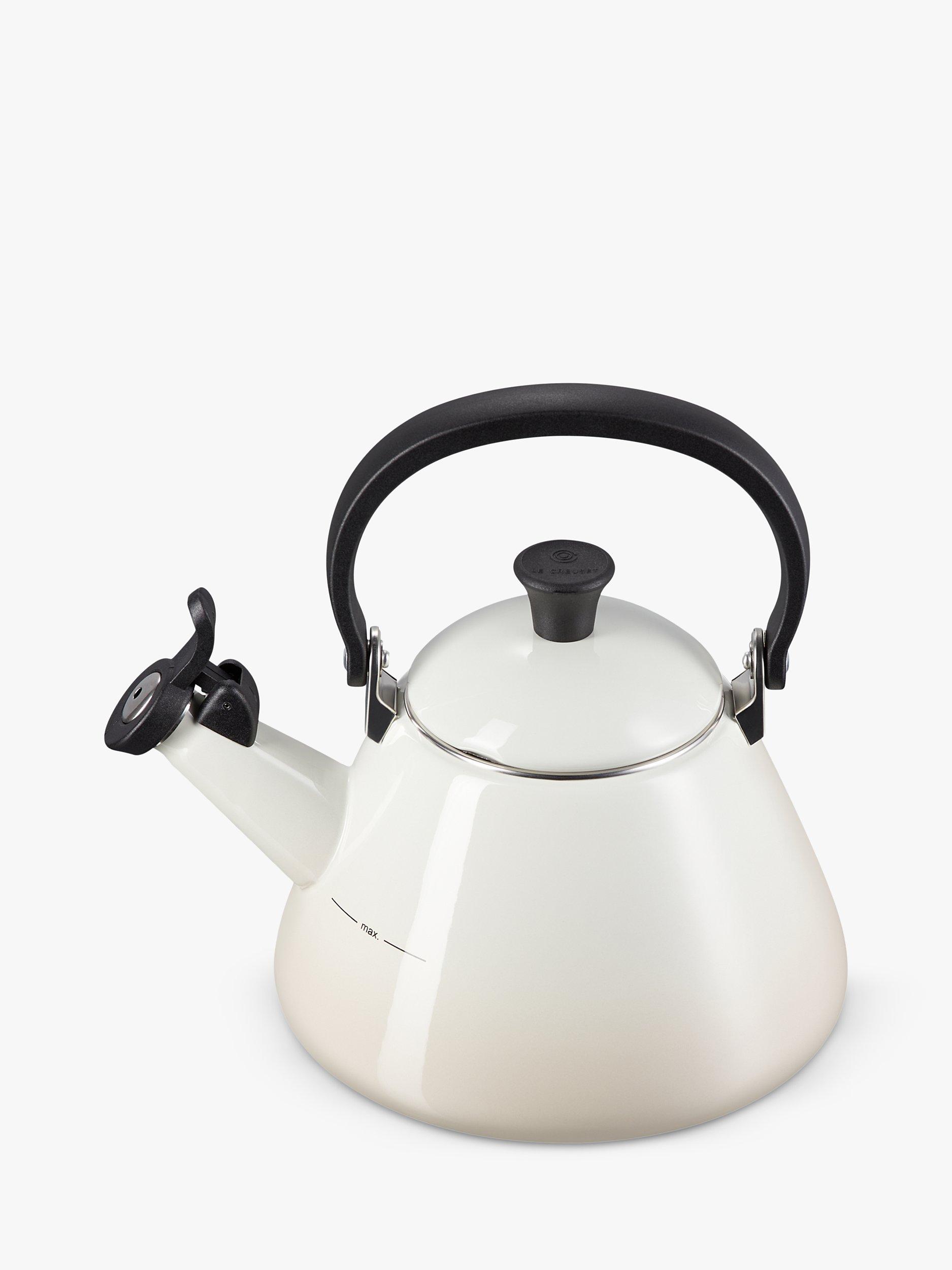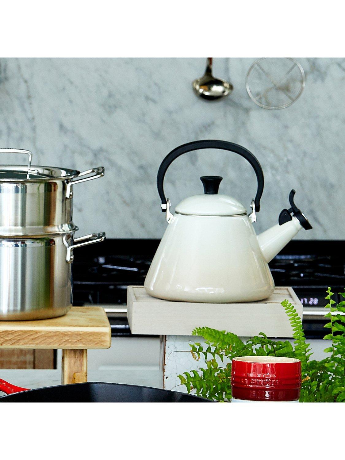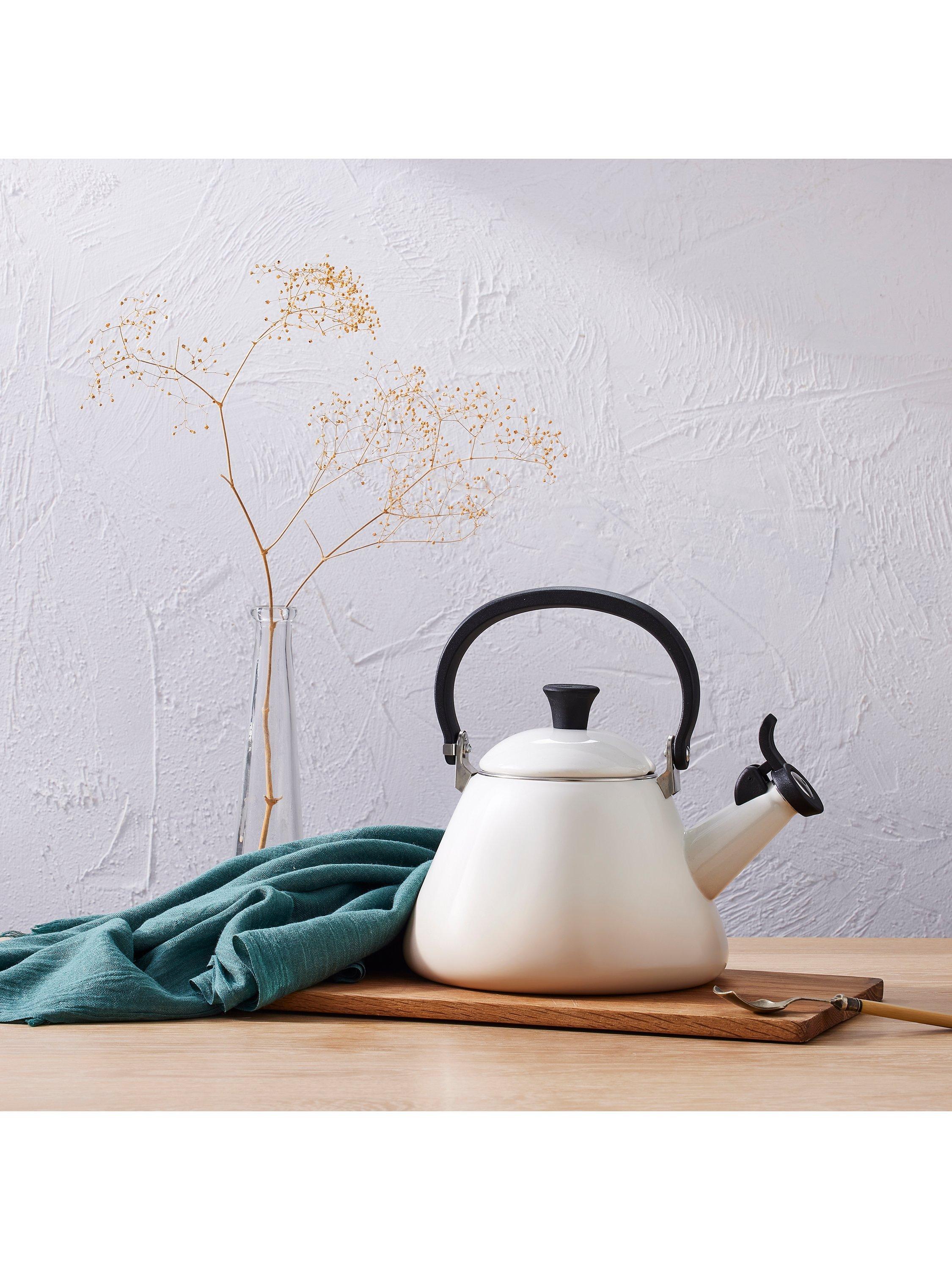 This kone-style enamelled stovetop kettle from Le Creuset has a wide base for fast and efficient heating. A whistle lets you know when the water has come to the boil.
